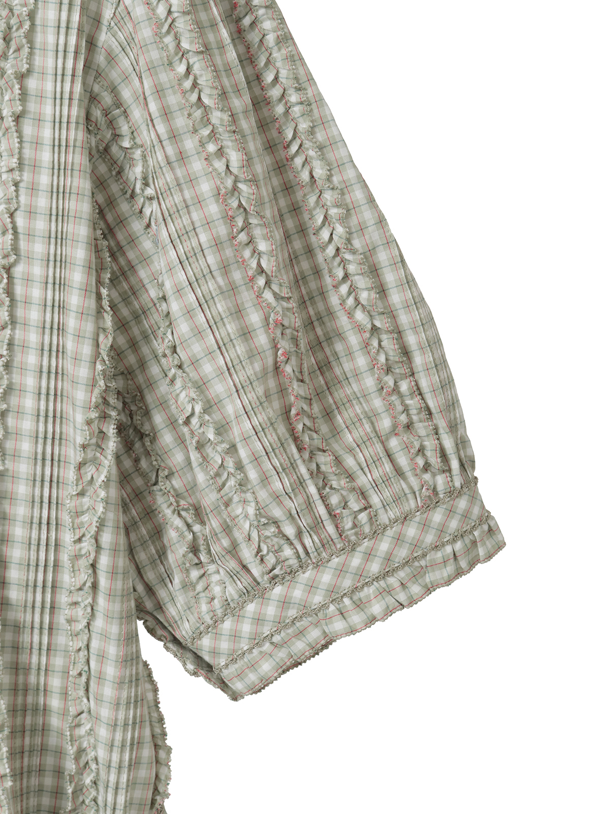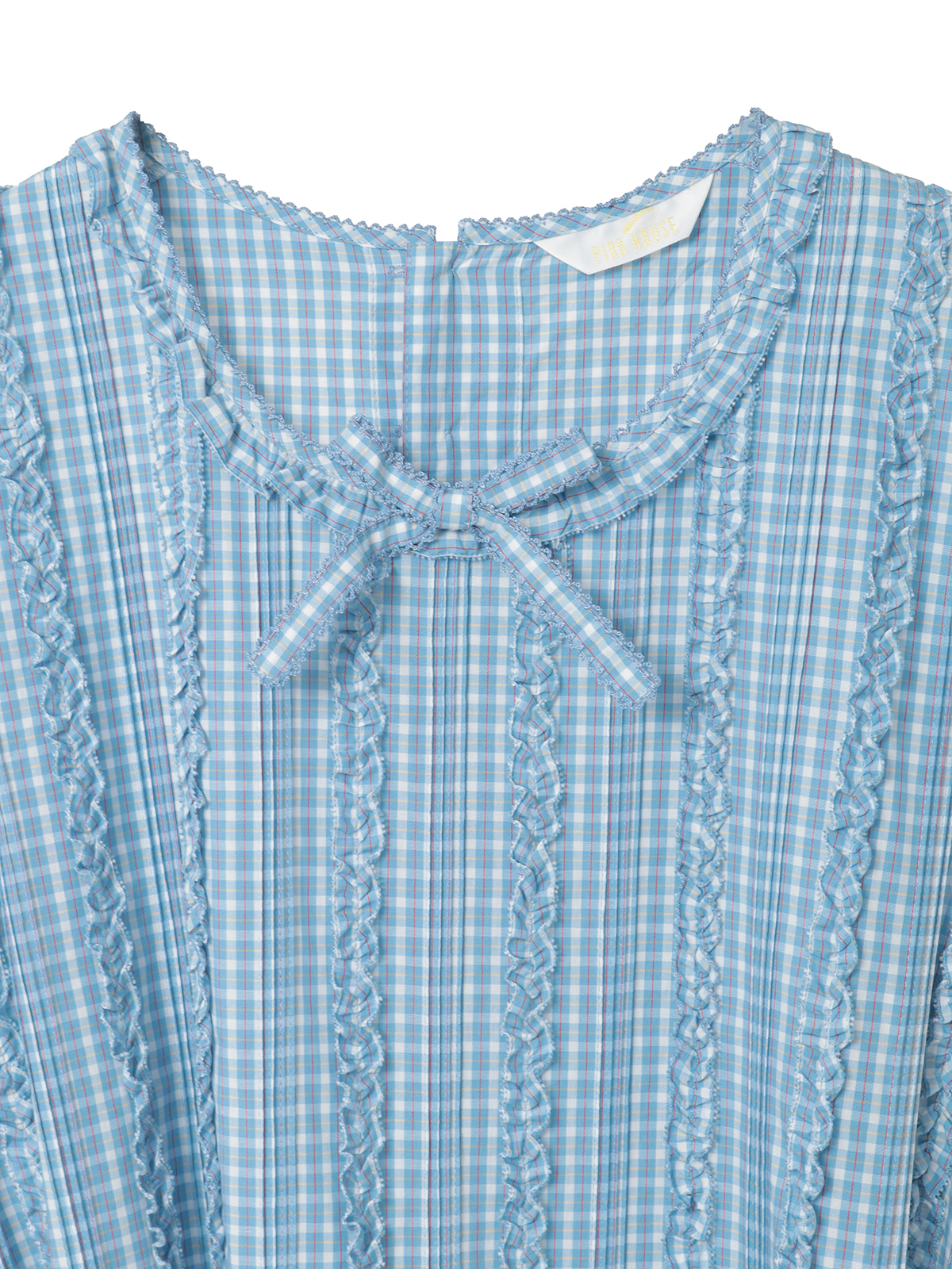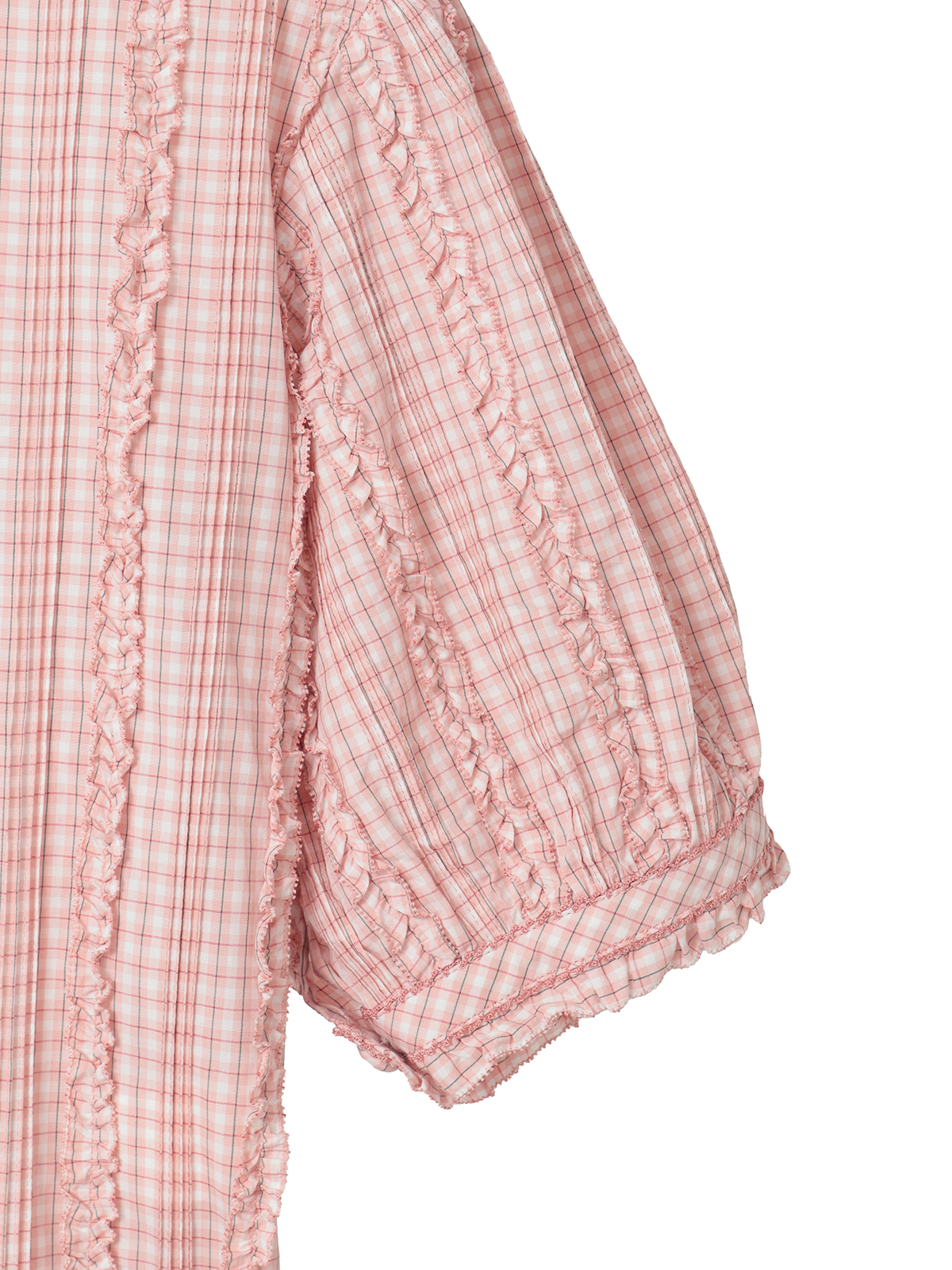ピコフリルにピンタックのデティールを交互にあしらえた、華やかなデティール使いが印象的。