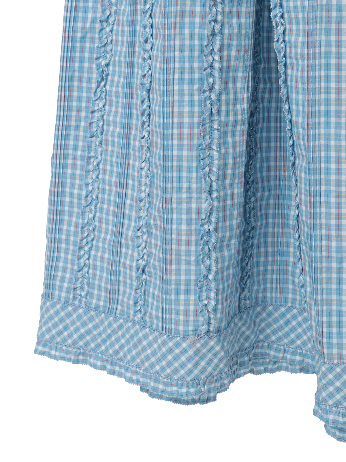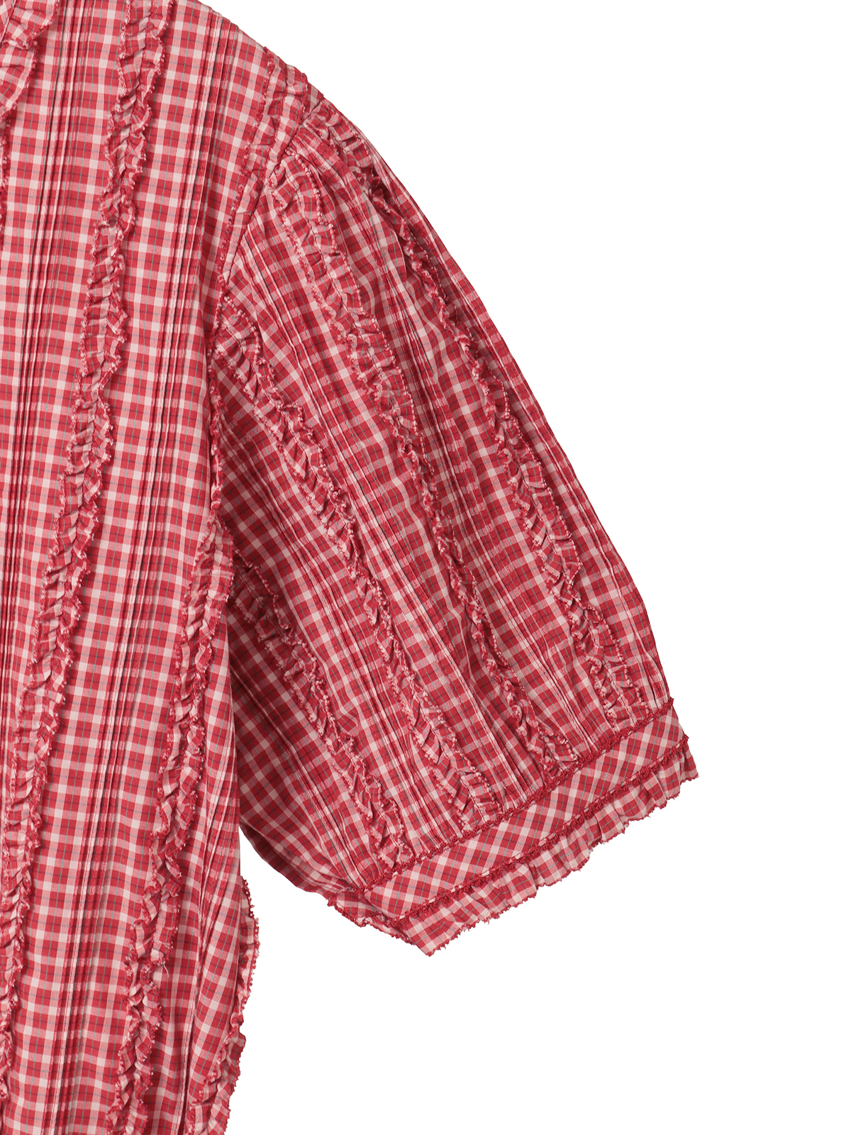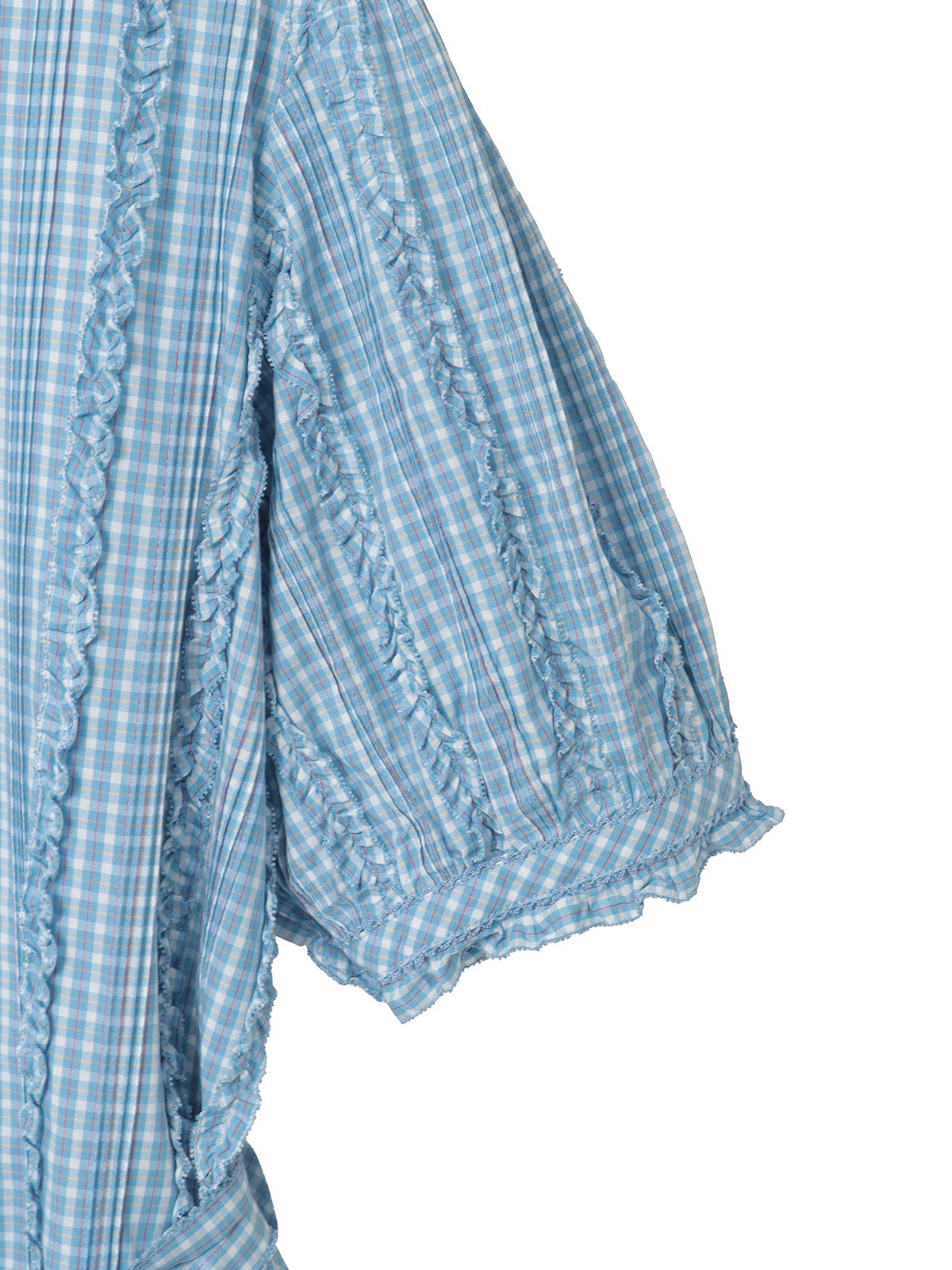 ピコフリルにピンタックのデティールを交互にあしらえた、華やかなデティール使いが印象的。