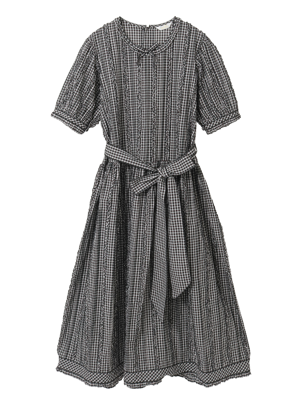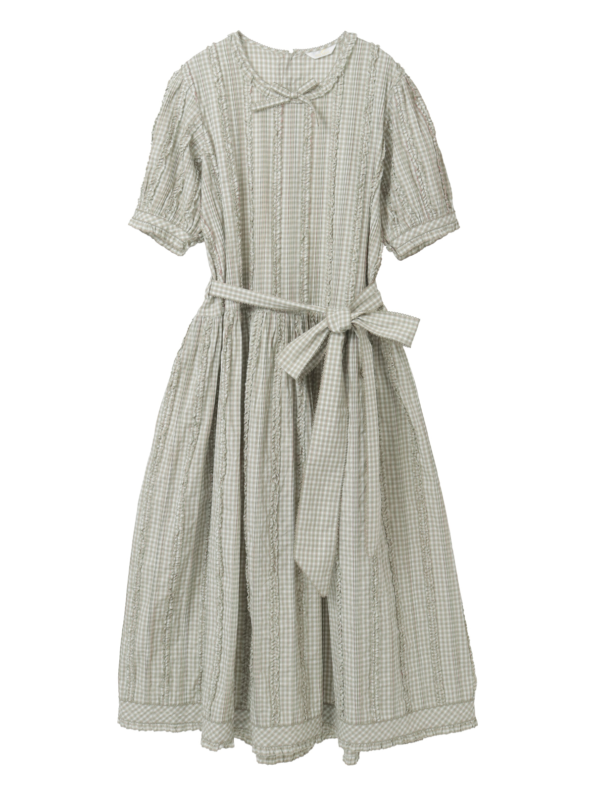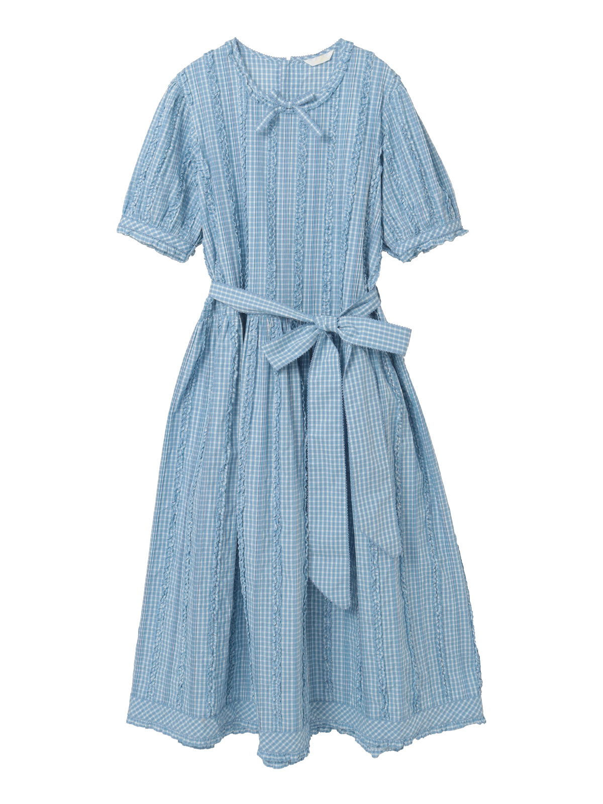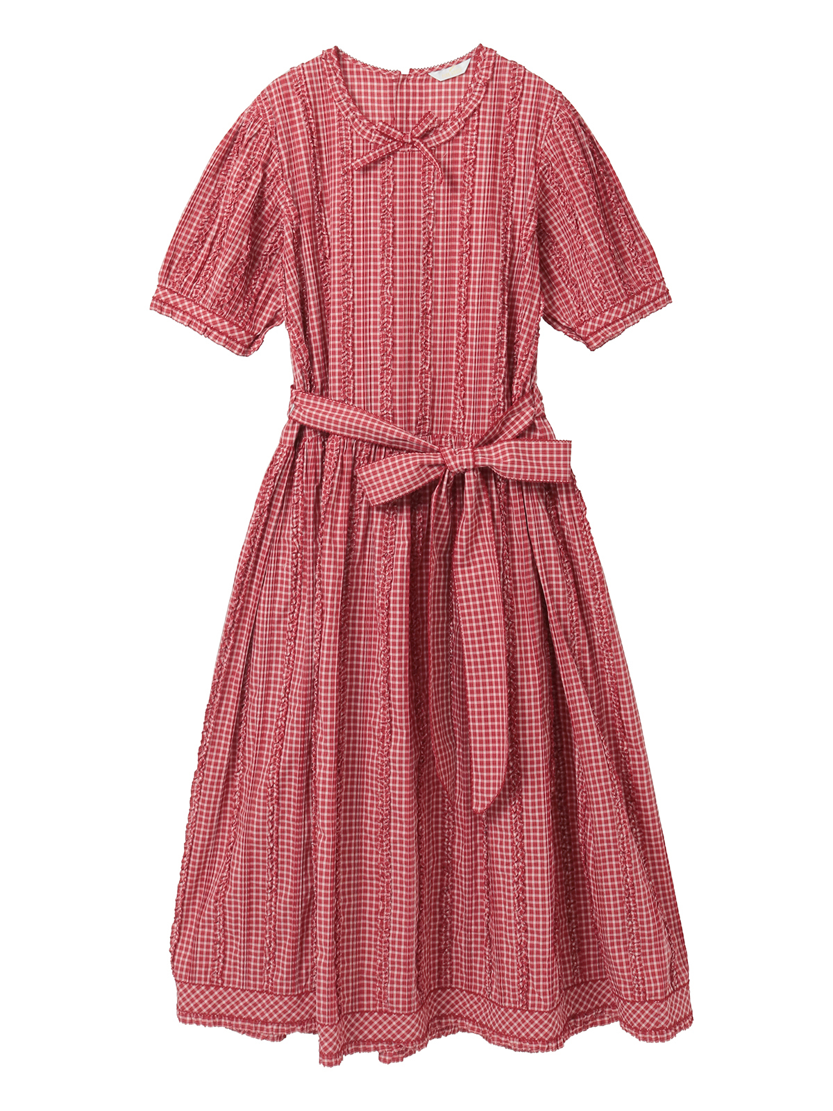 チェック地で作られたサッシュベルトは、フロントでリボン結びして華やかに。
