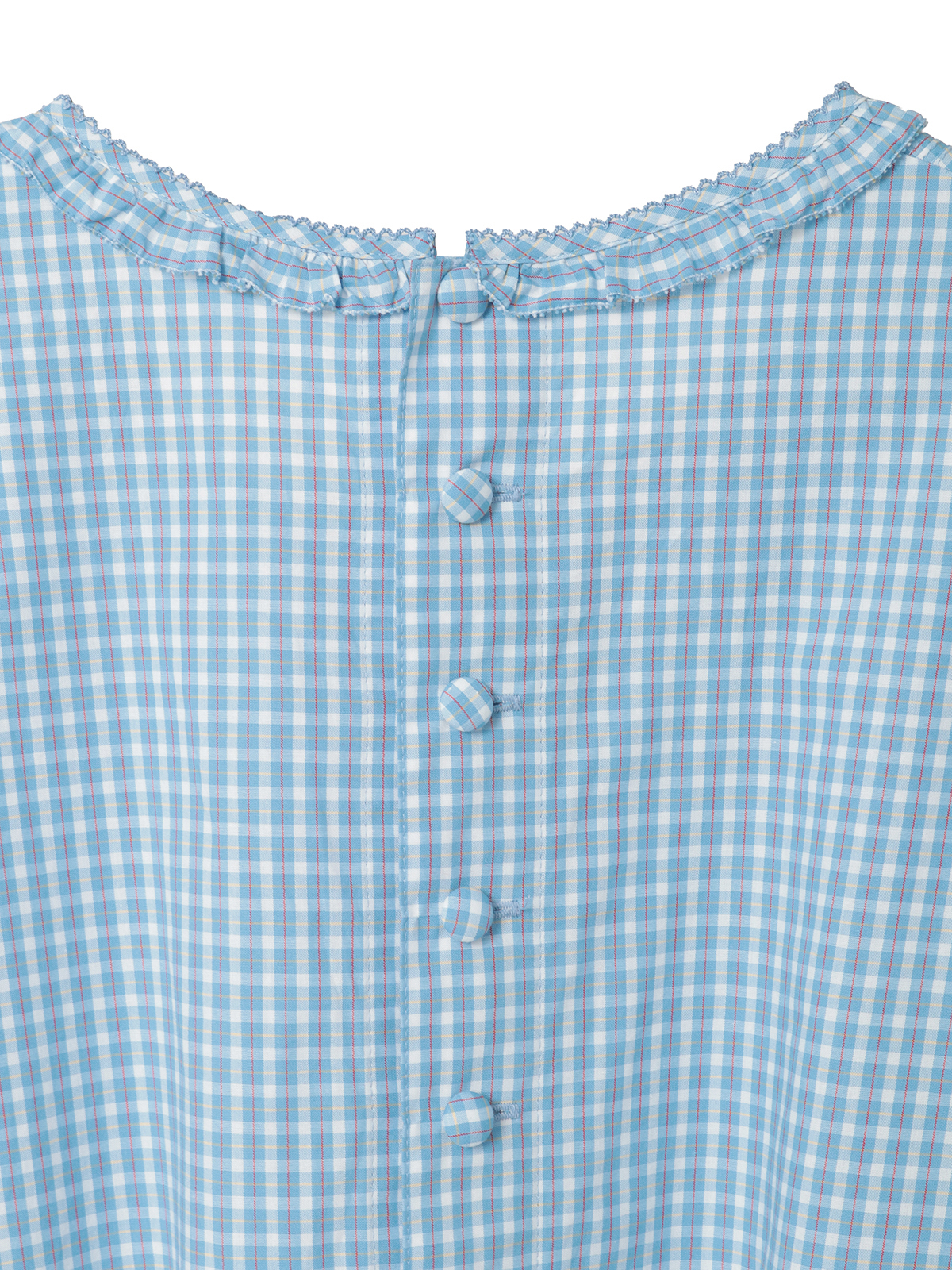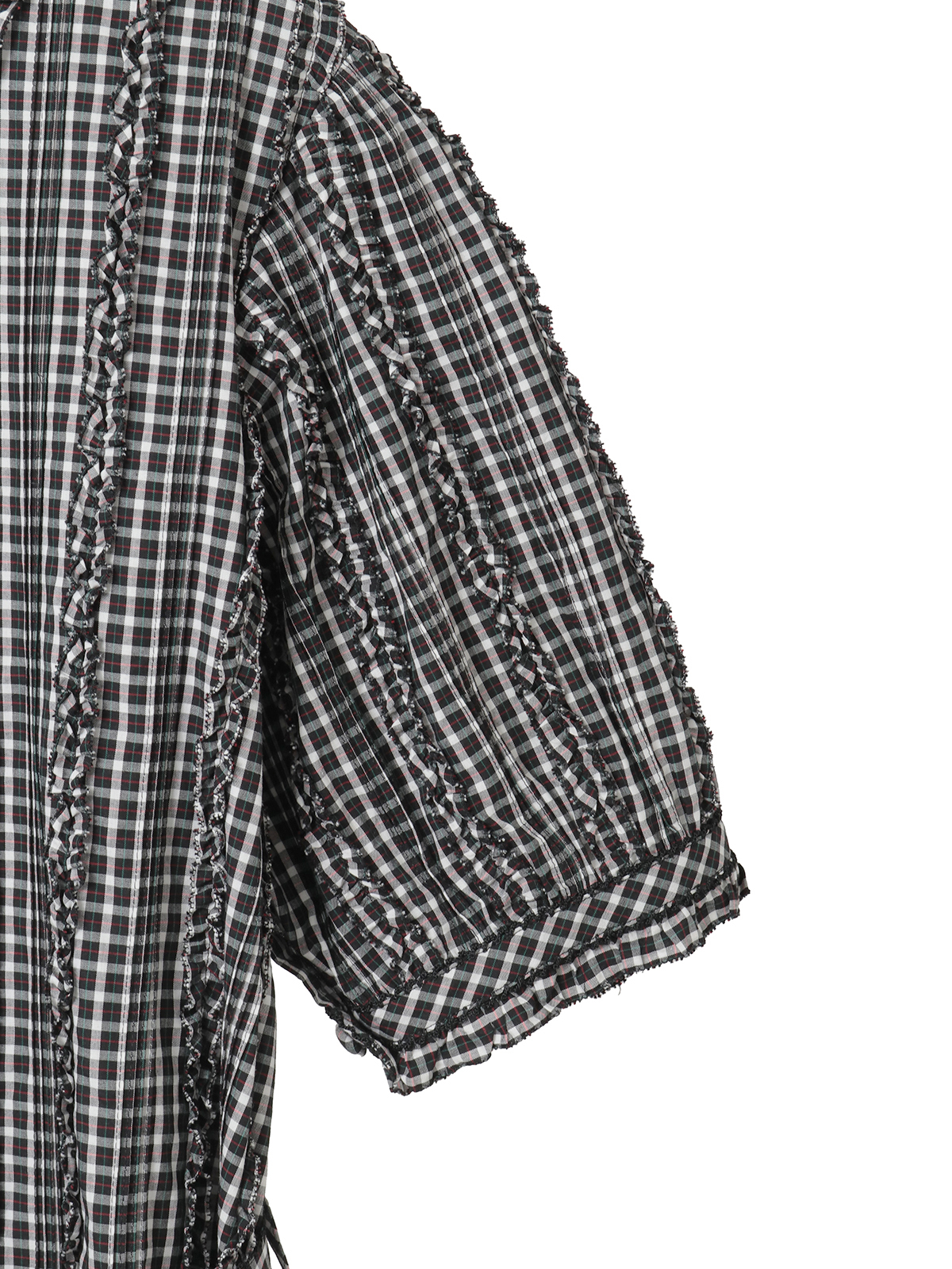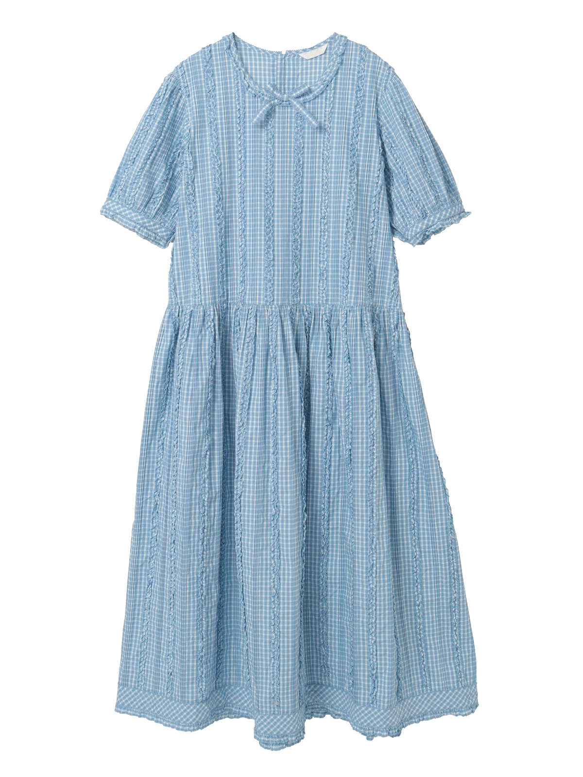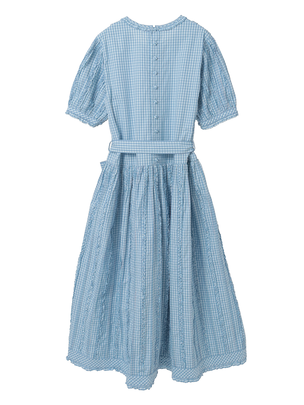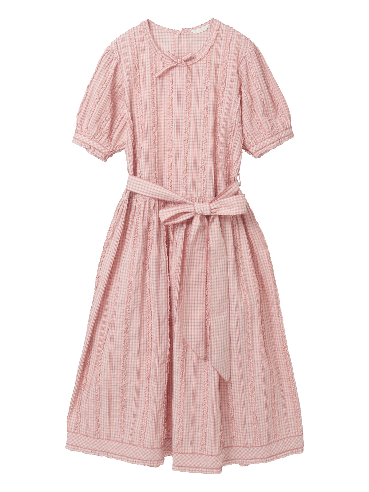 チェック地で作られたサッシュベルトは、フロントでリボン結びして華やかに。