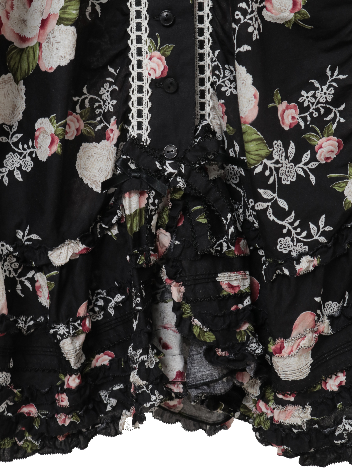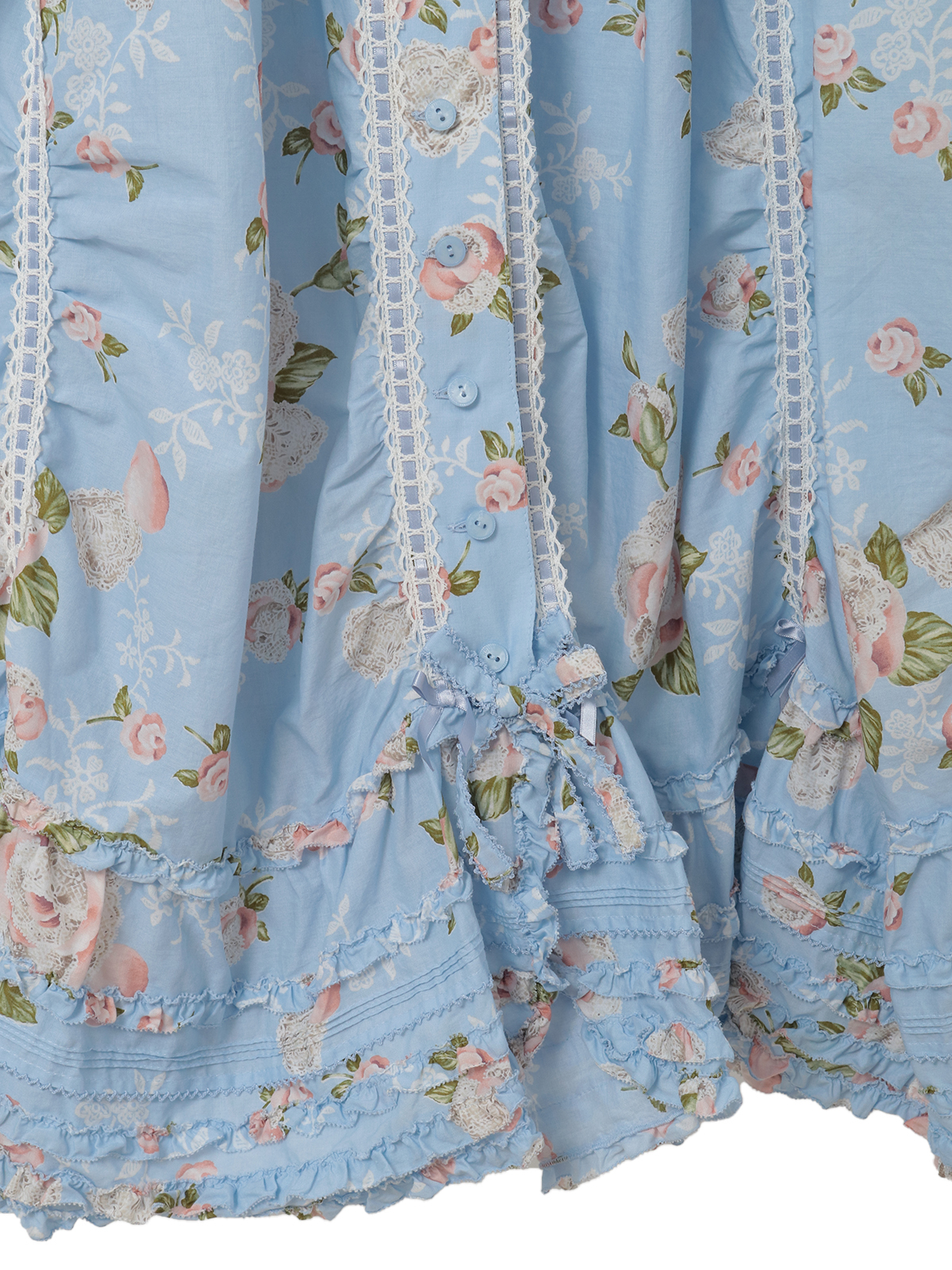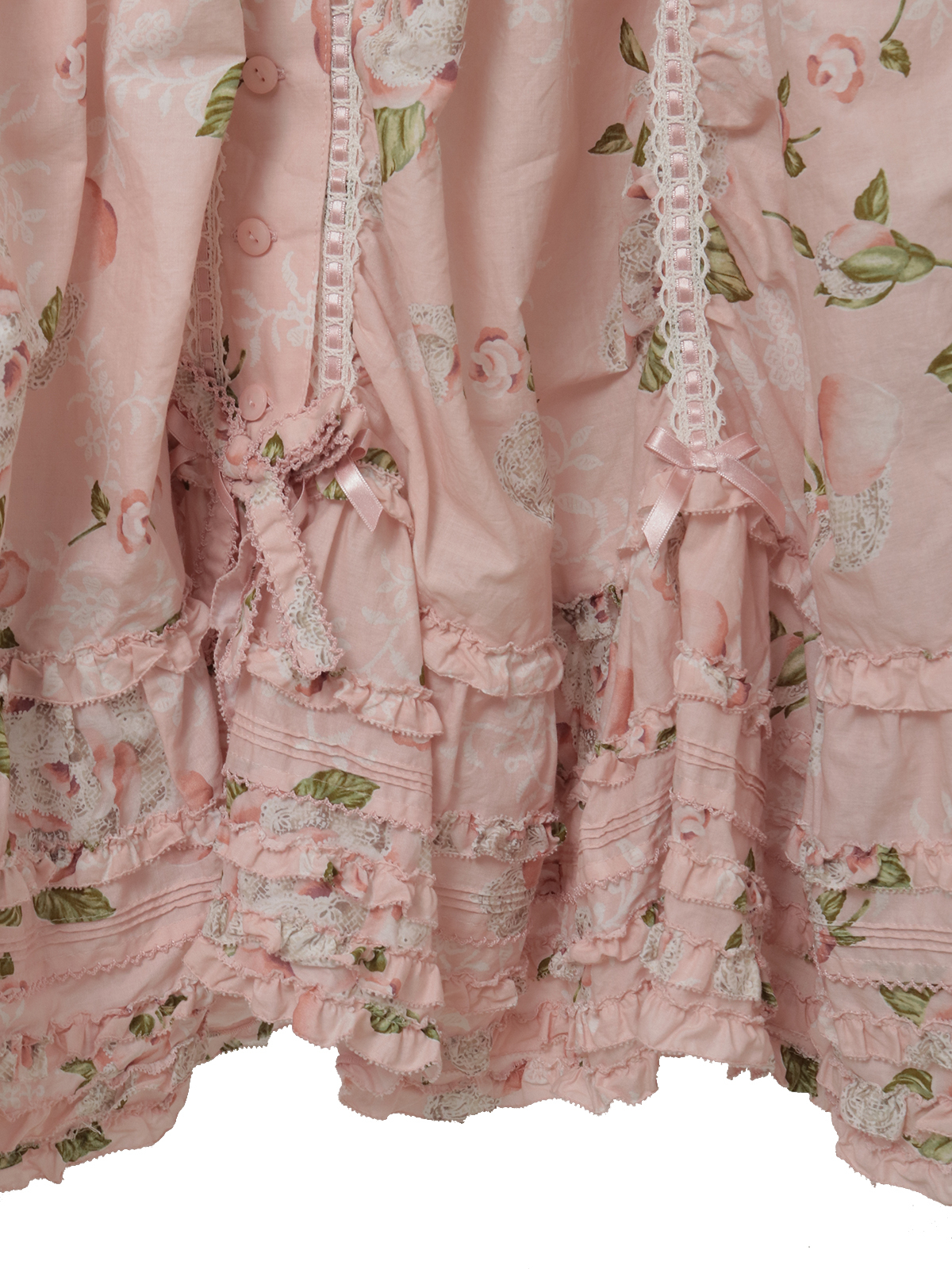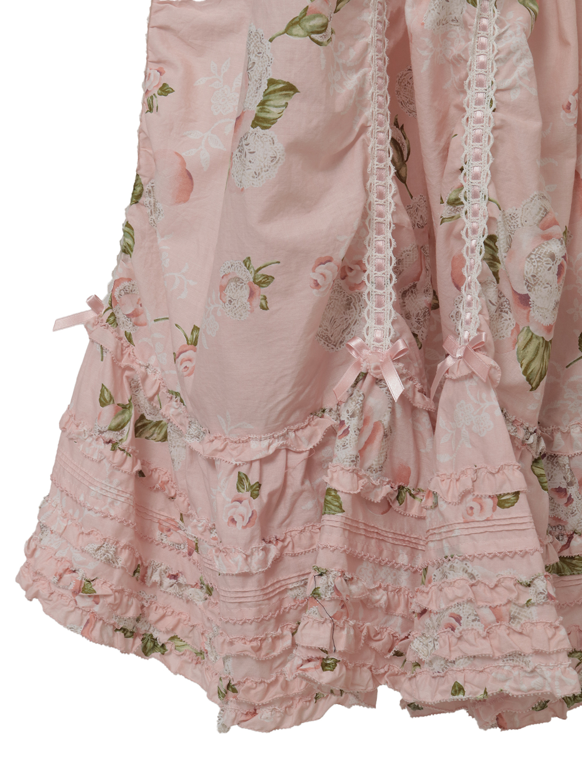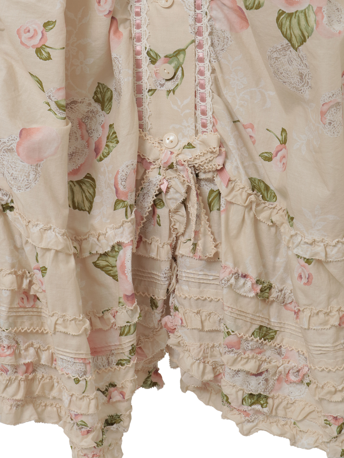 たくさんのパーツを剥ぎ合わせたフレアスカートのデザイン。さらに裾まわりのフリルとタックの装飾をあしらったふわっと広がるデティールがとても華やかです。