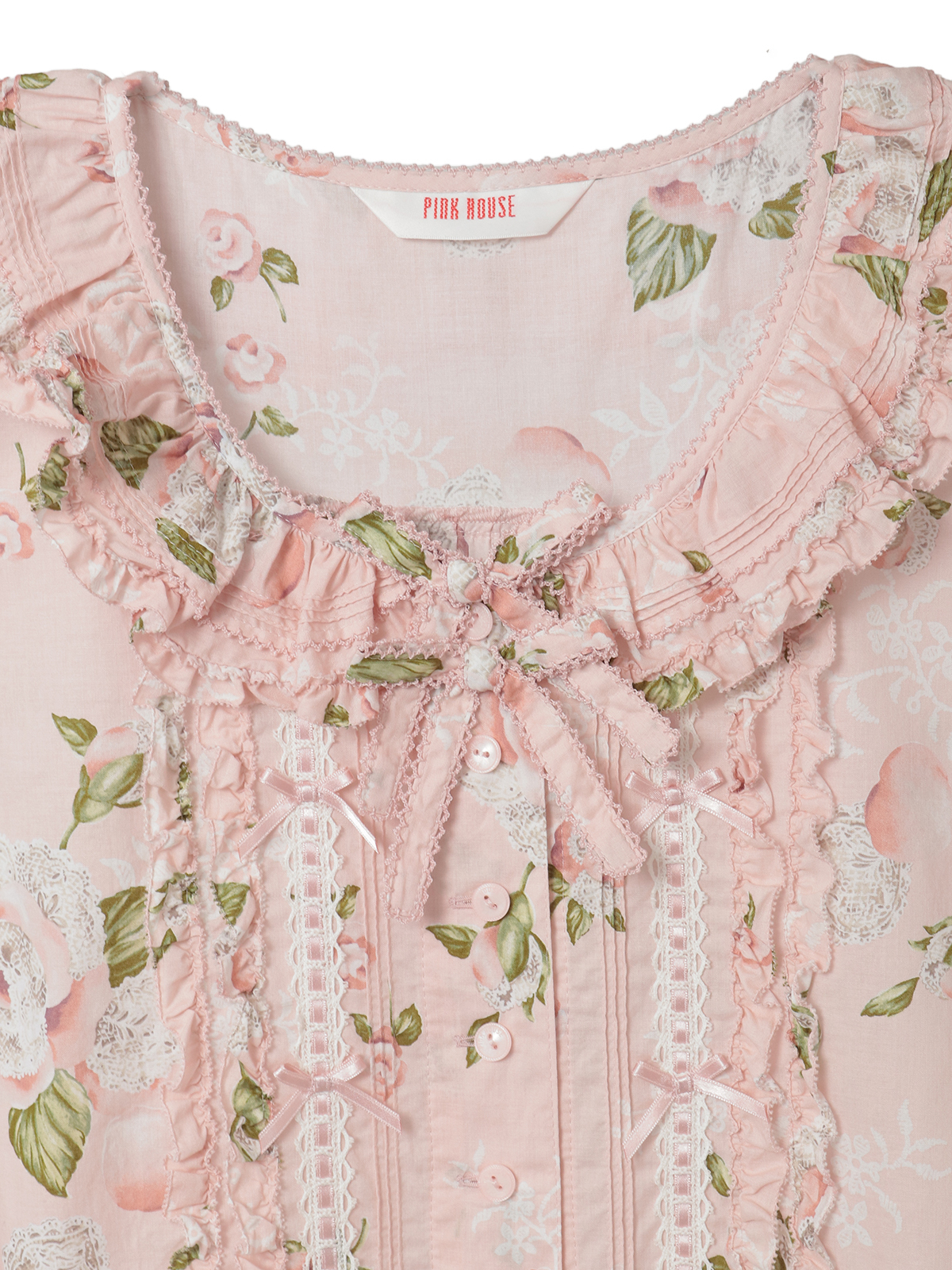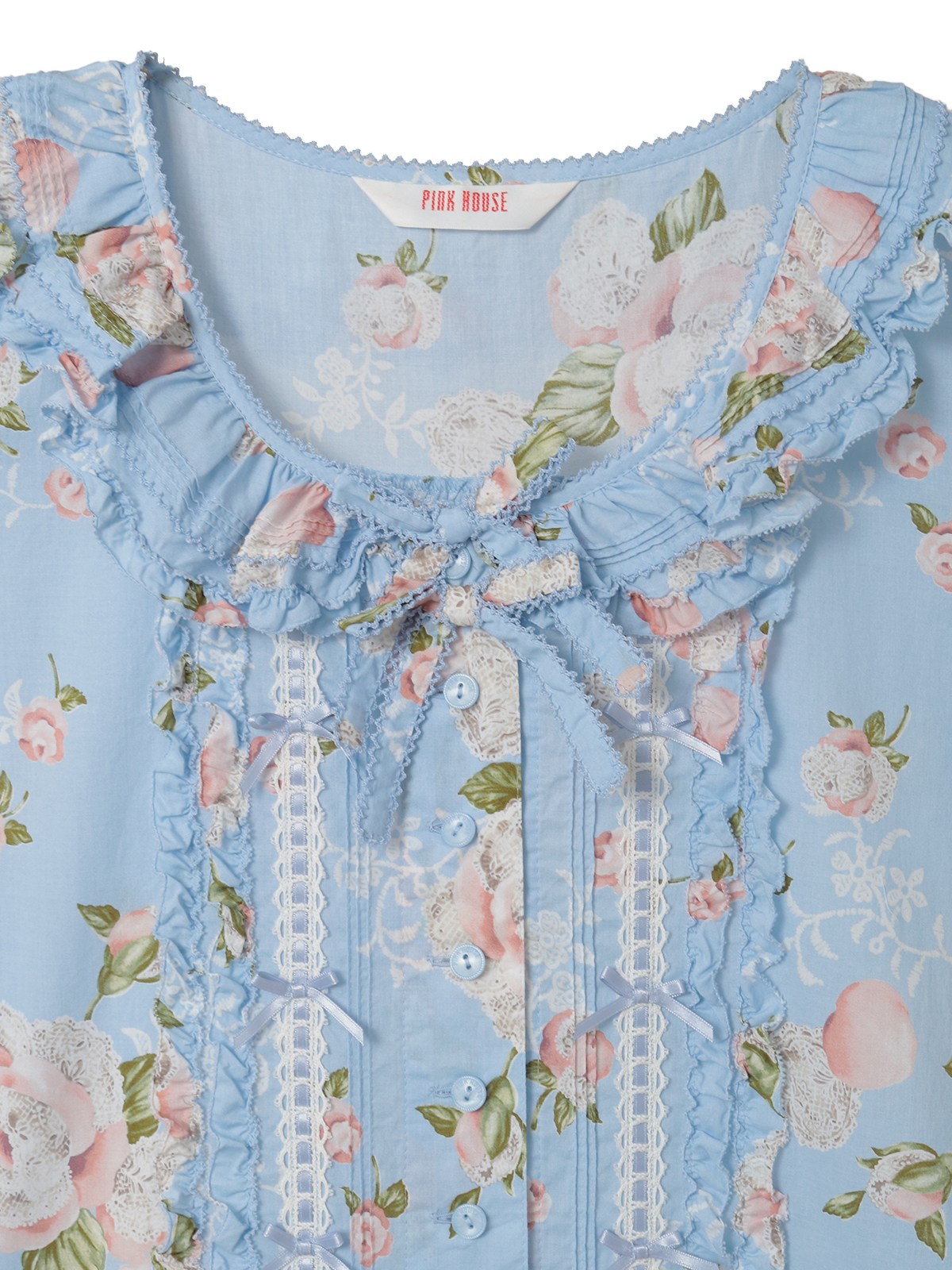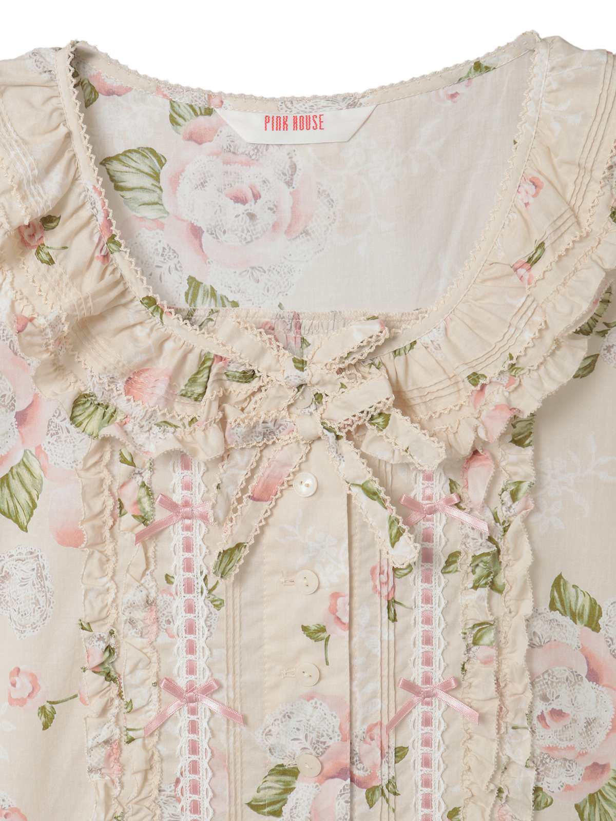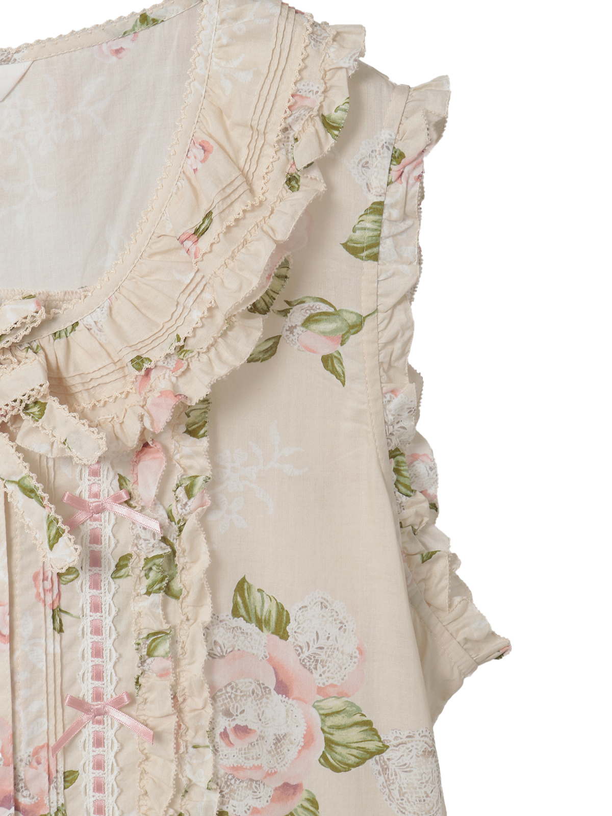 ハシゴレースにサテンリボンのデティールは、フロントまわりにも添えて華やかに。