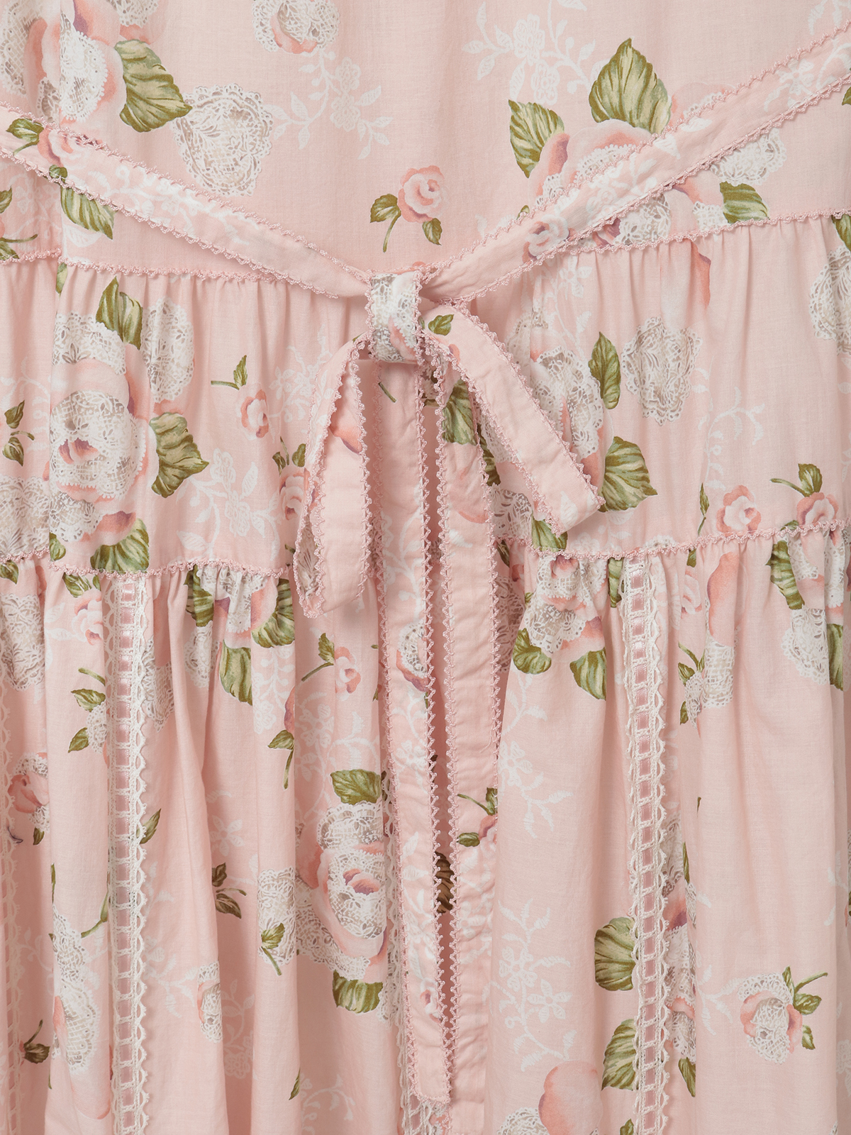 それぞれの剥ぎ合わせのところにはサテンリボンを通した華奢なハシゴレースのデティールをあしらって。縦のラインに走るデティールの連続がより華やかな仕上がりに。レースの先にはミニリボンを添えて。