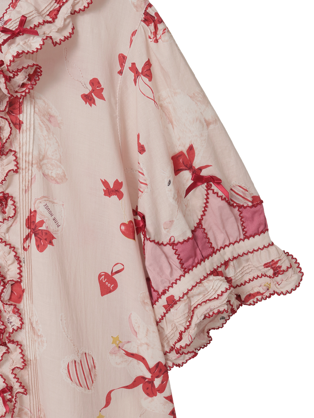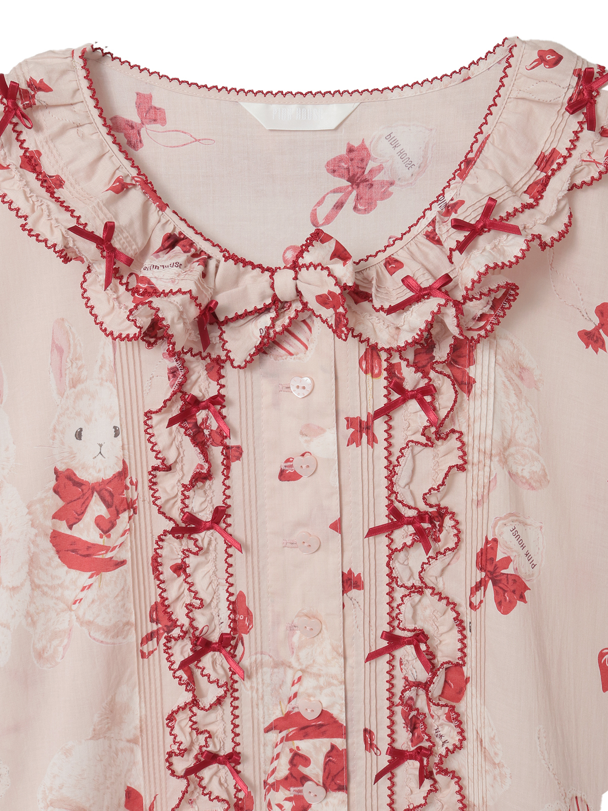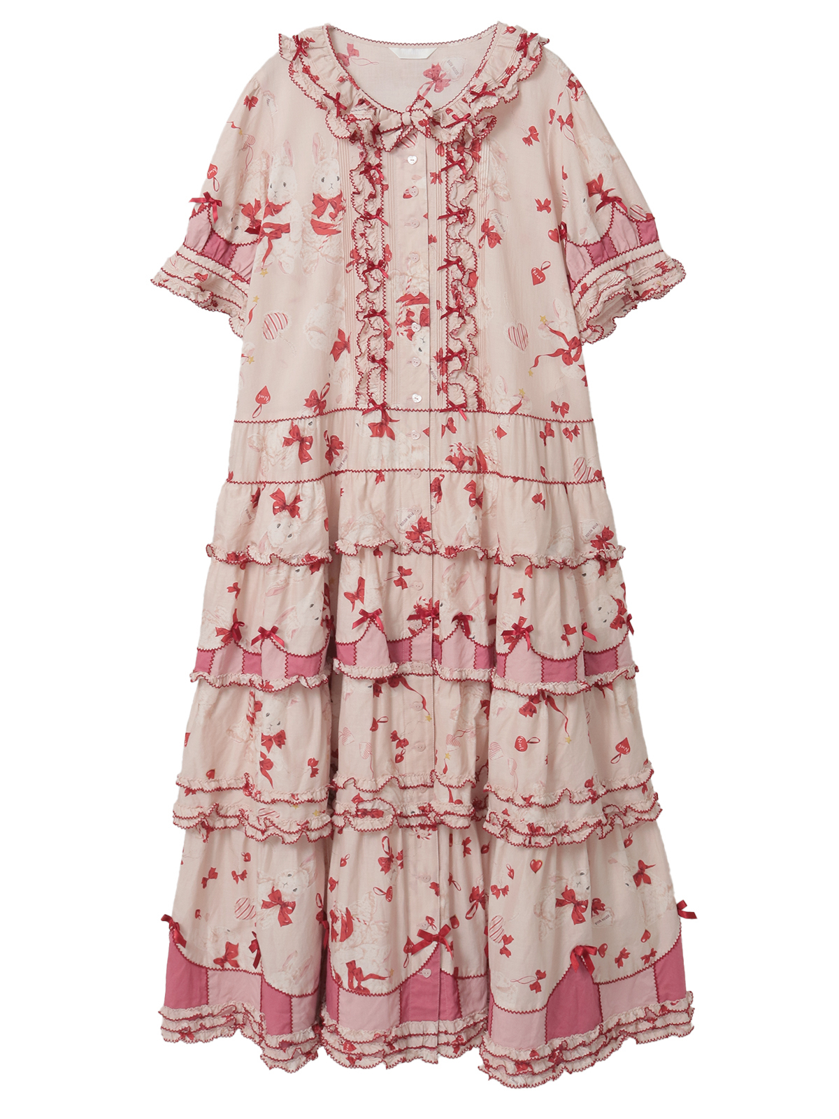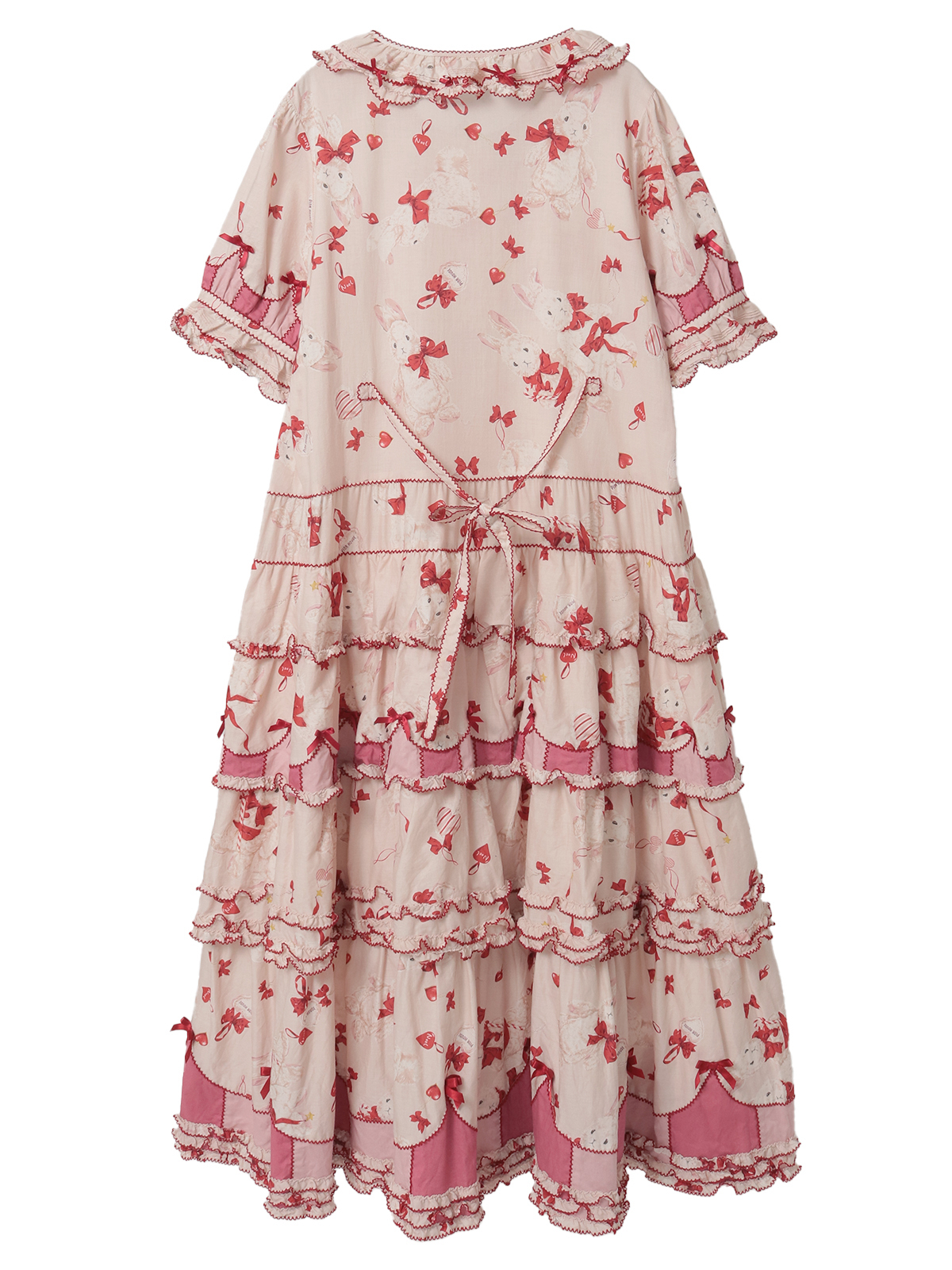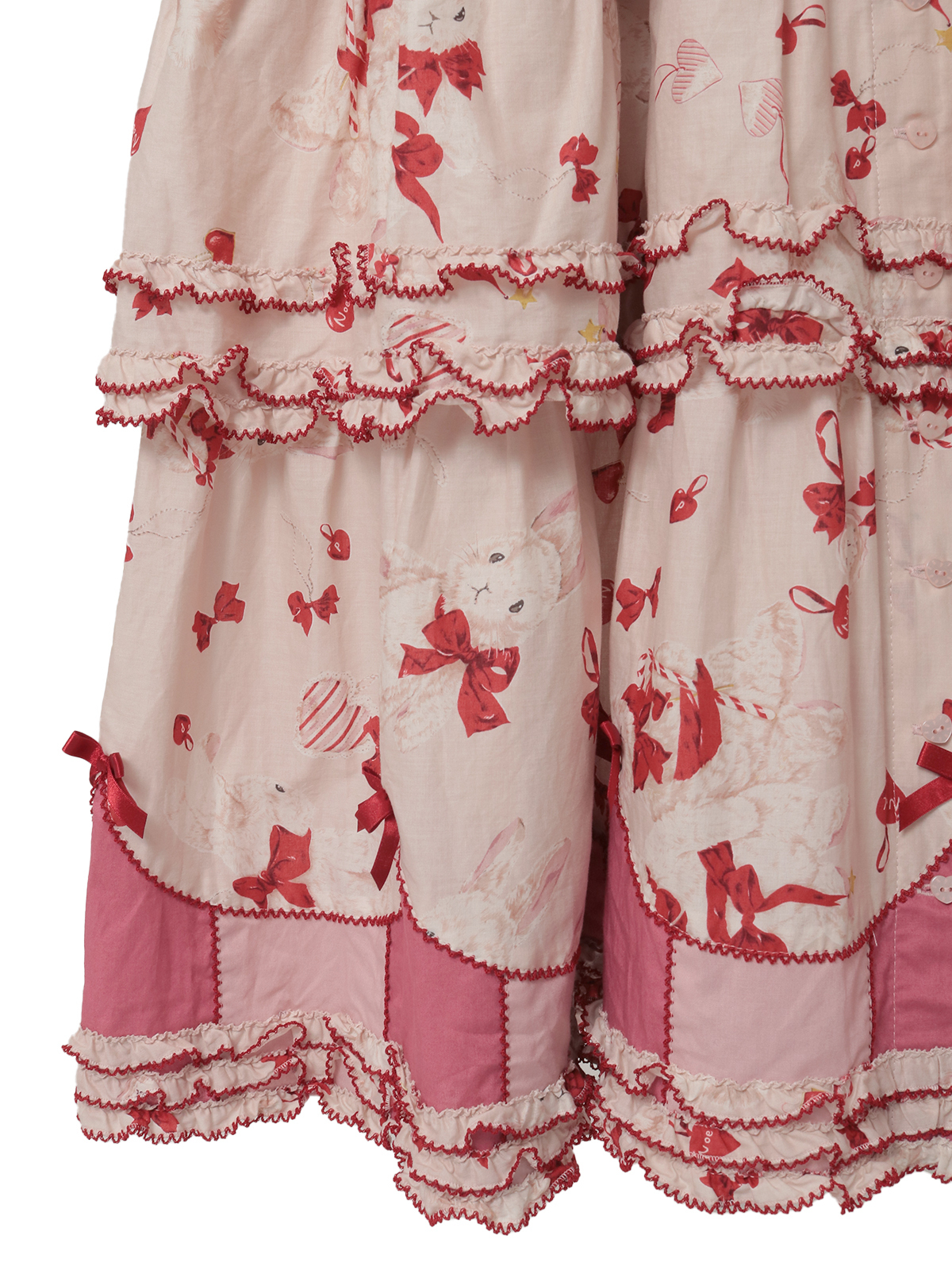 2匹の仲よしのラビットたちがとってもキュート。豪華で華やかな4段フリルのティアードワンピース。ところどころにラビットたちと同じ赤いミニサテンリボンを散りばめて彩りを添えています。袖まわりや裾まわりなどに飾られた濃淡、2色のピンク色の飾りがアクセントに。