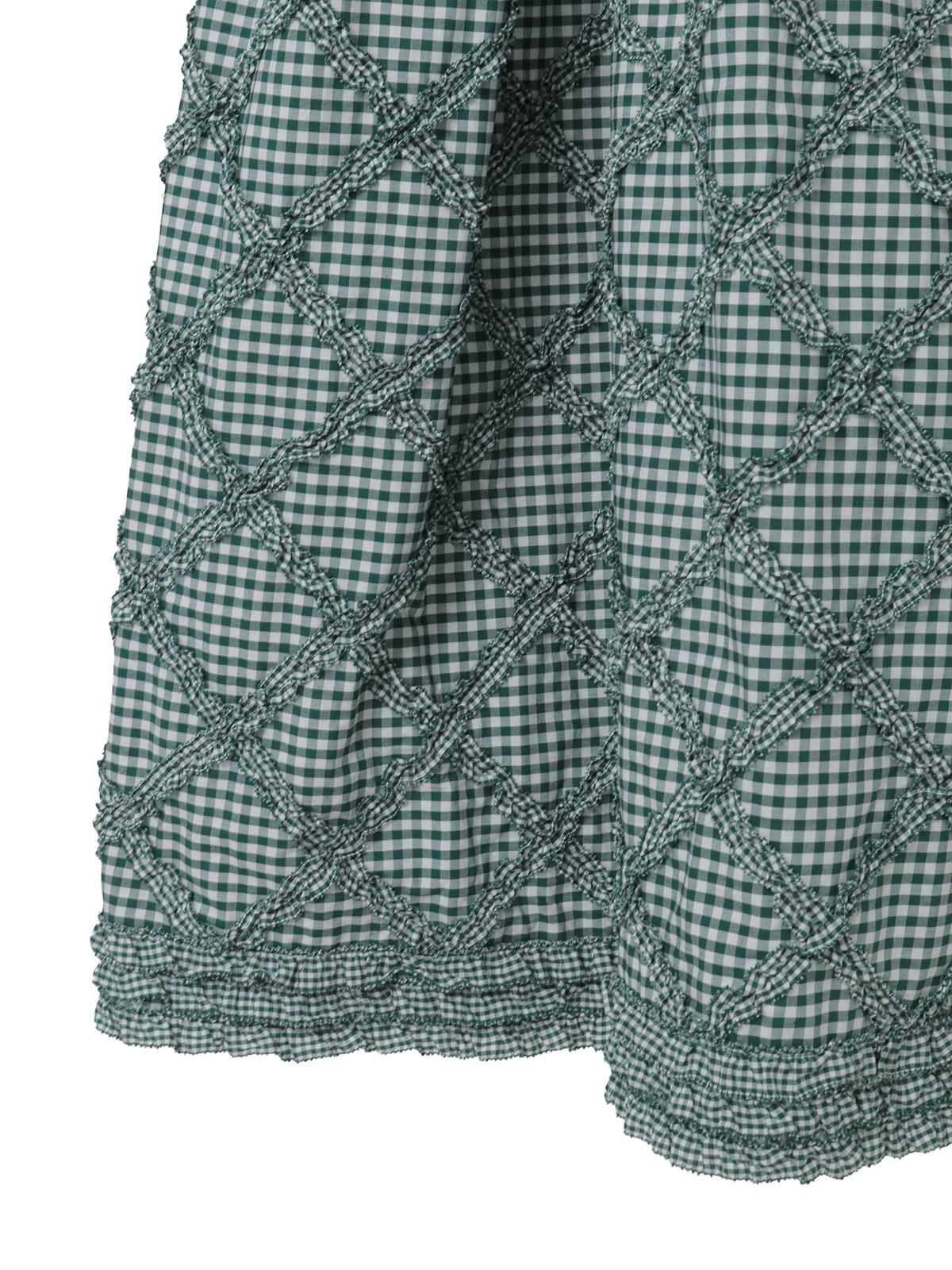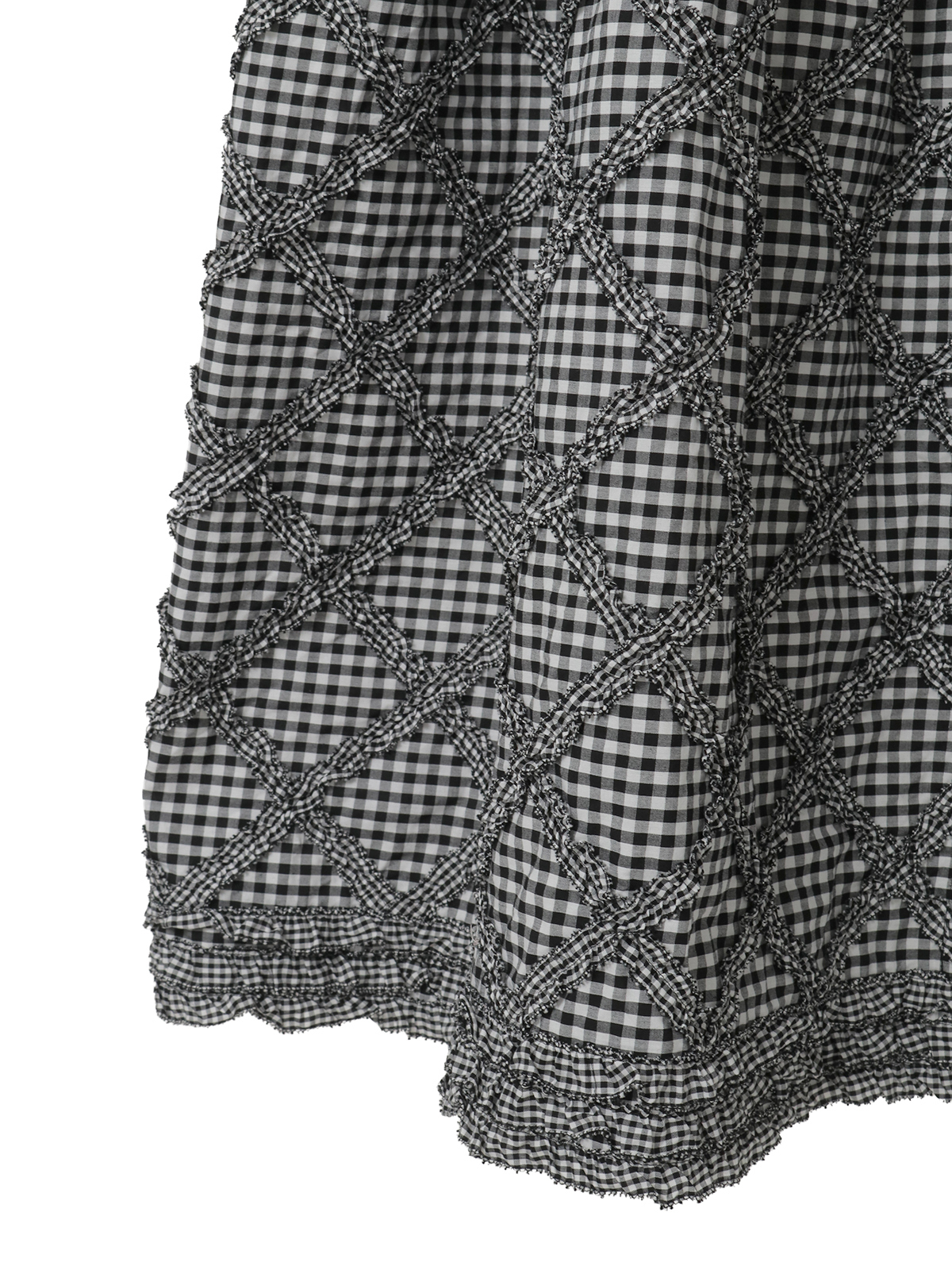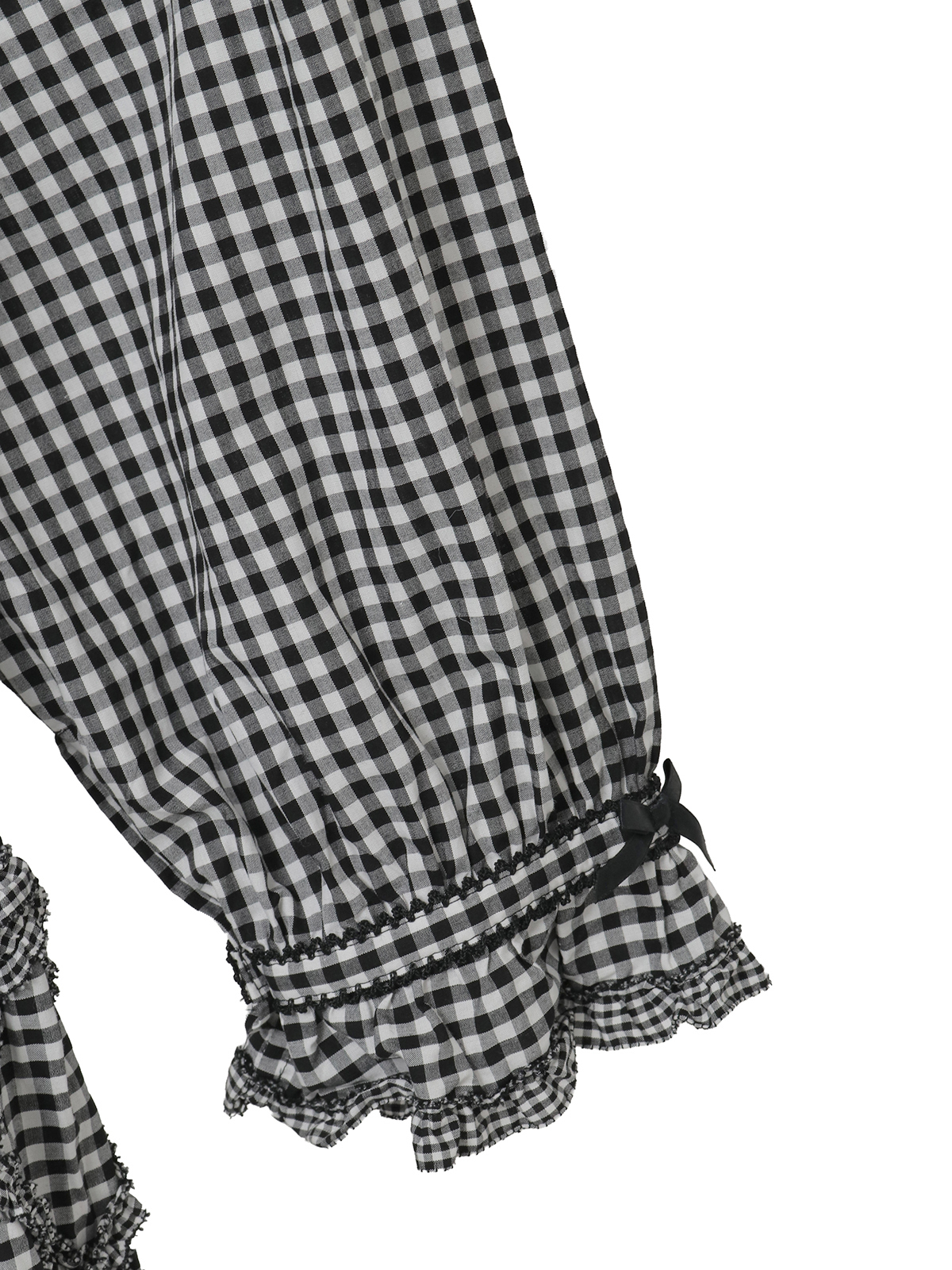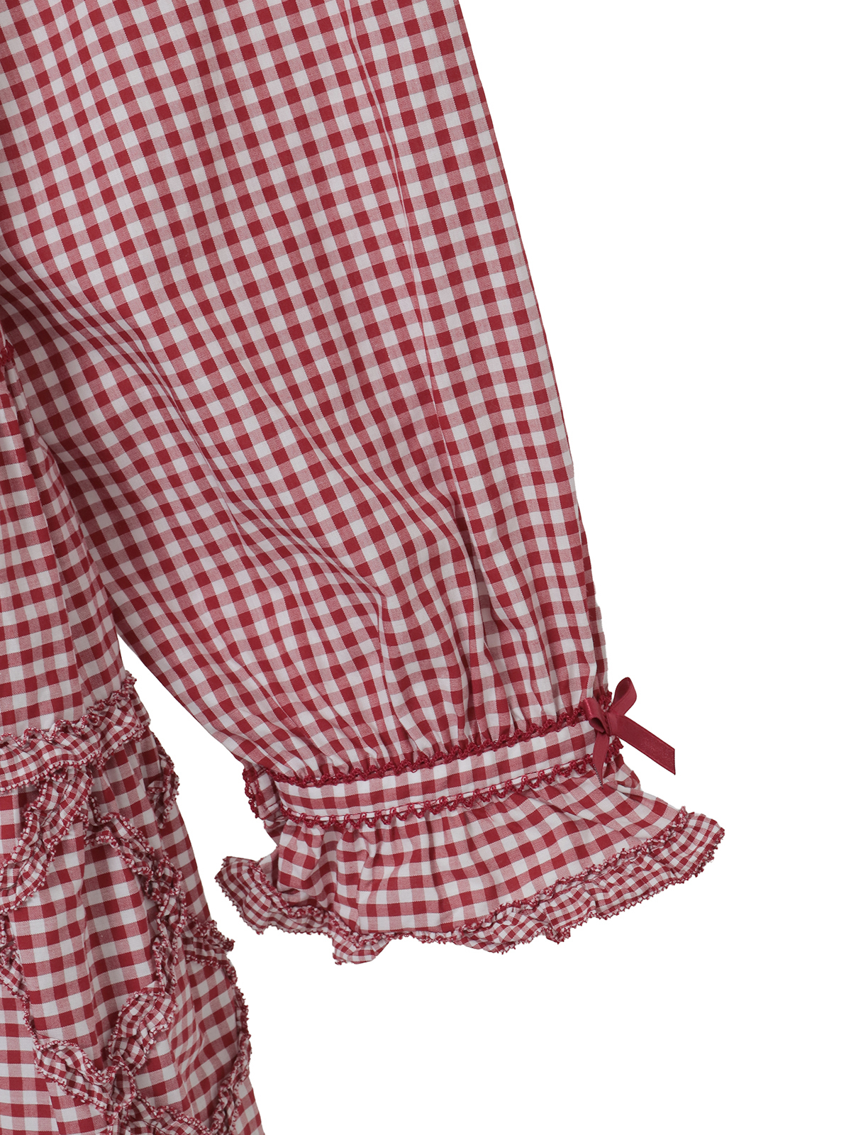 細かい格子の小ギンガムのフリルを部分使いにしたパッチワーク風のデザインが華やかな印象に。