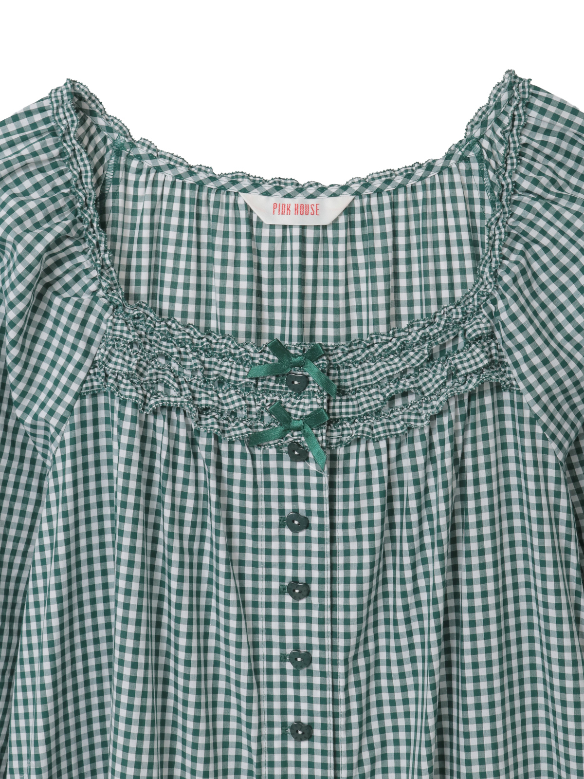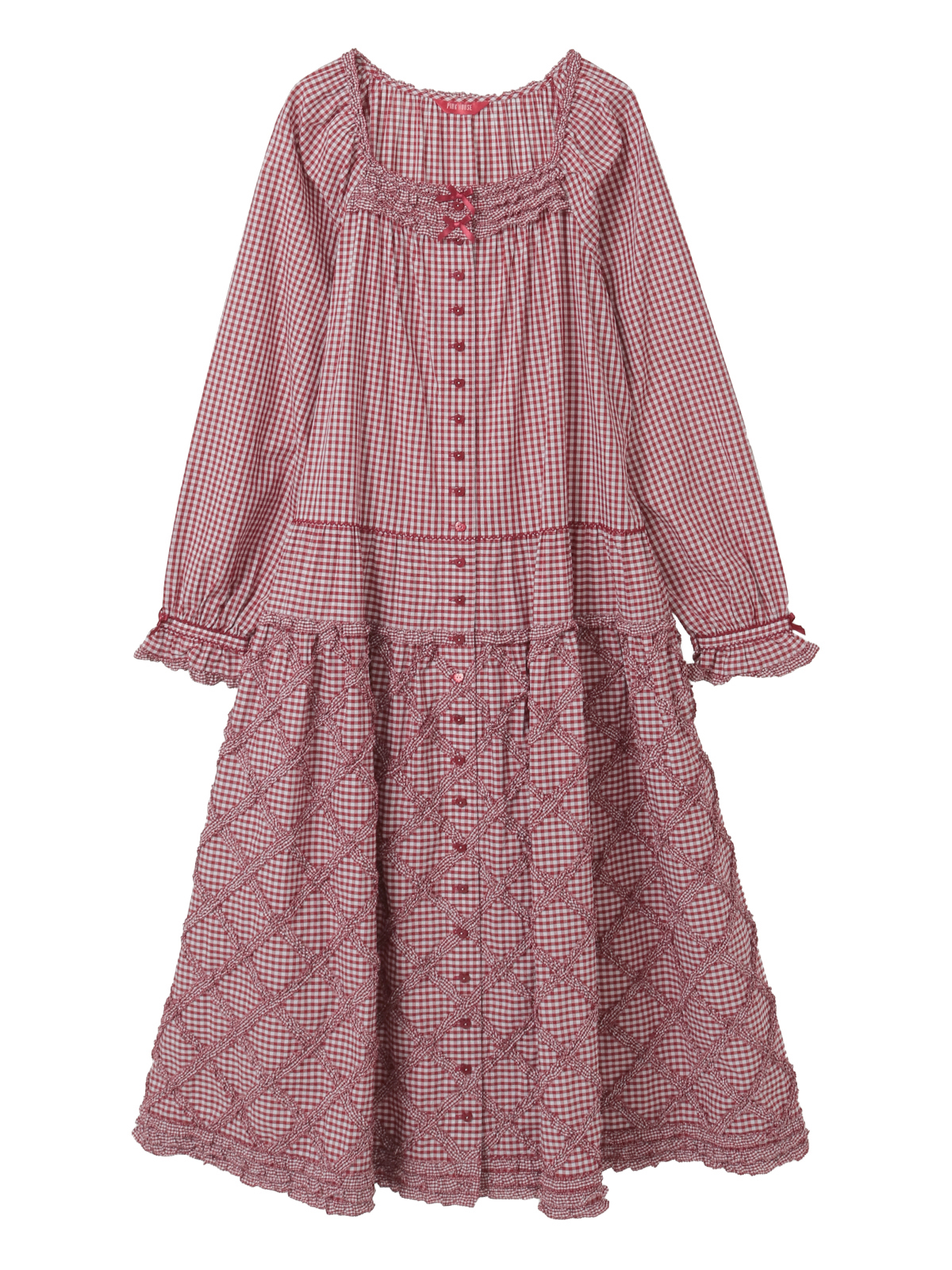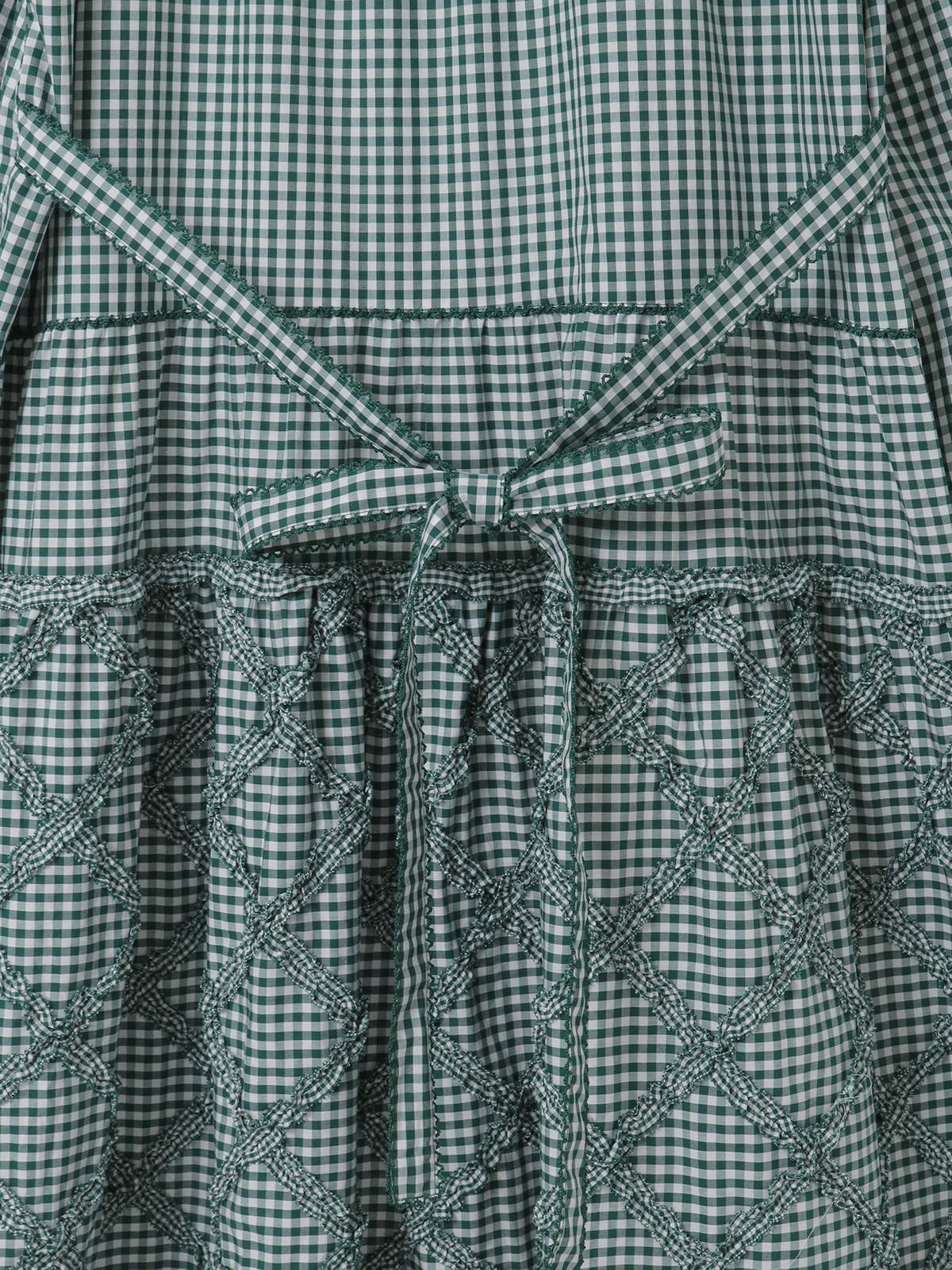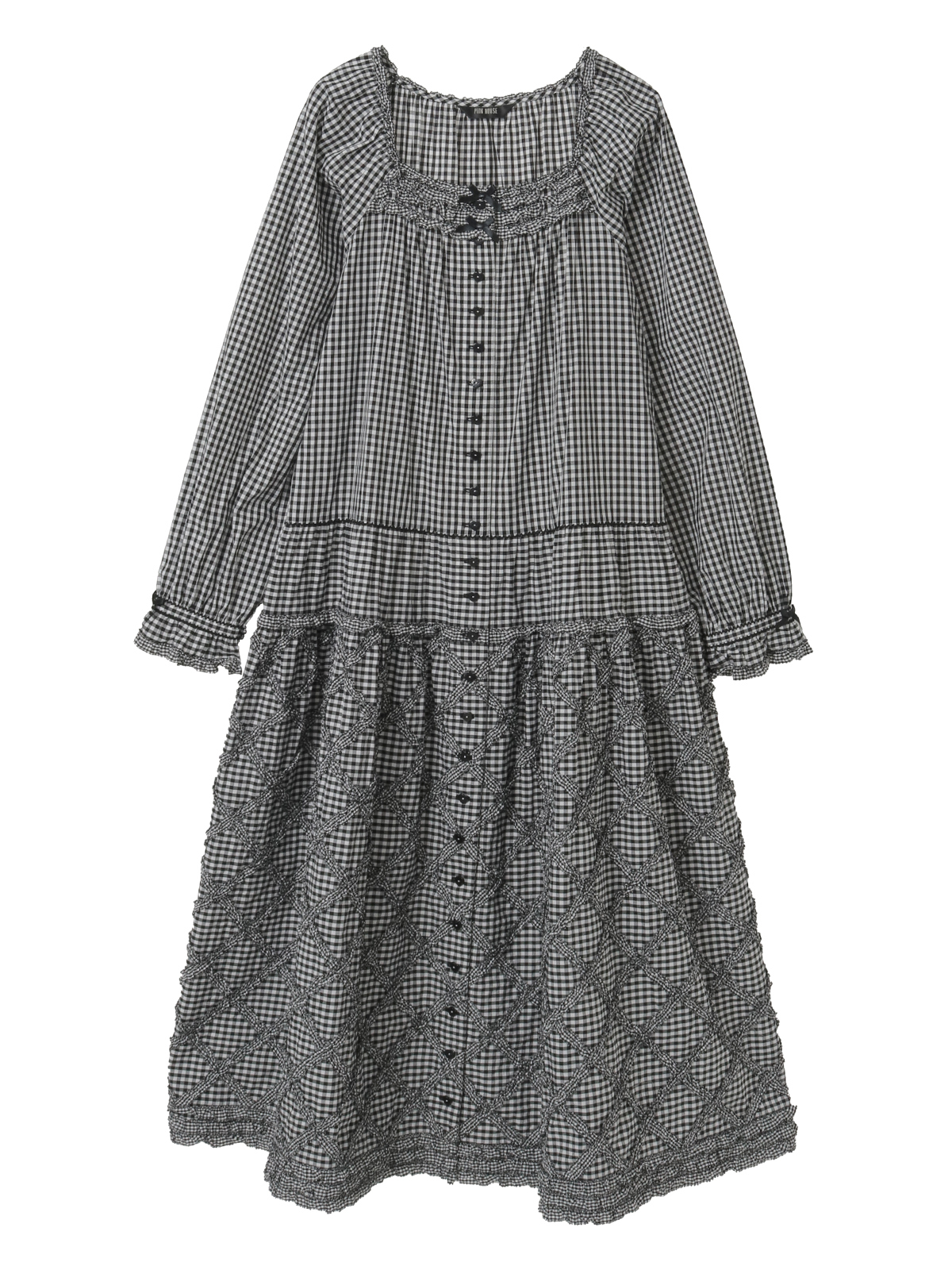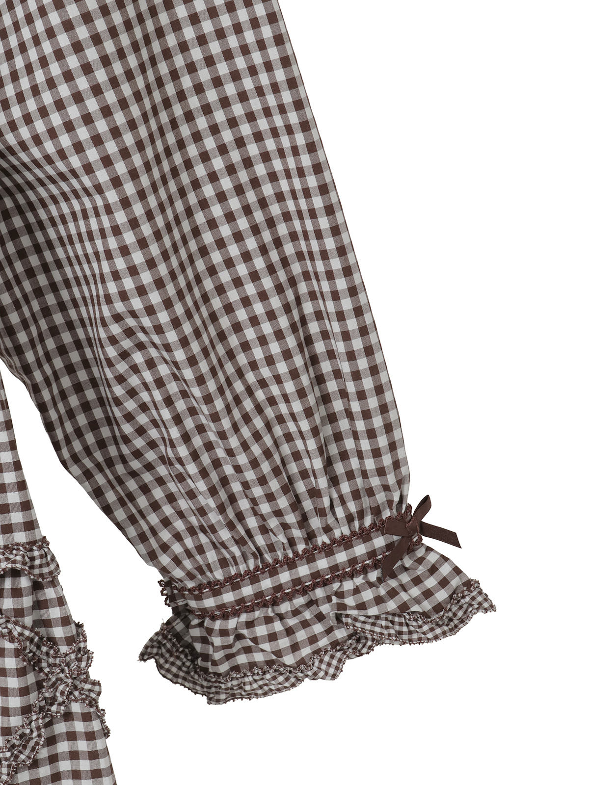 細かい格子の小ギンガムのフリルを部分使いにしたパッチワーク風のデザインが華やかな印象に。