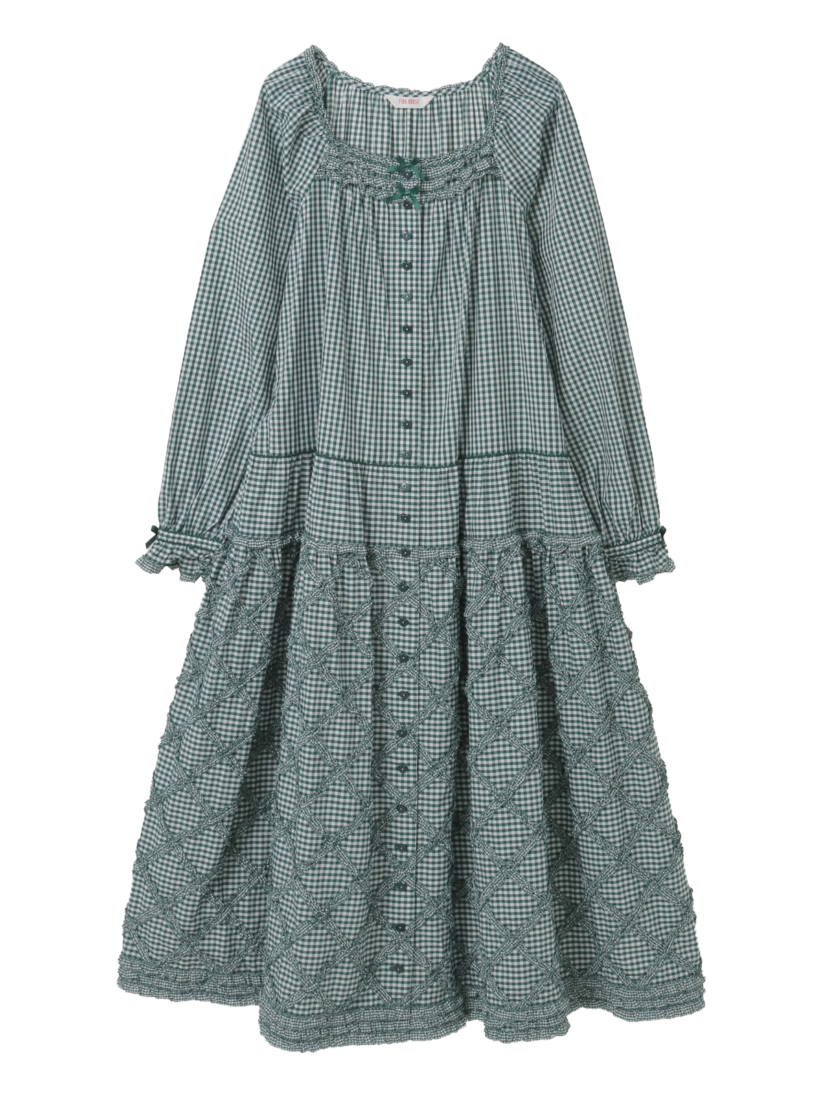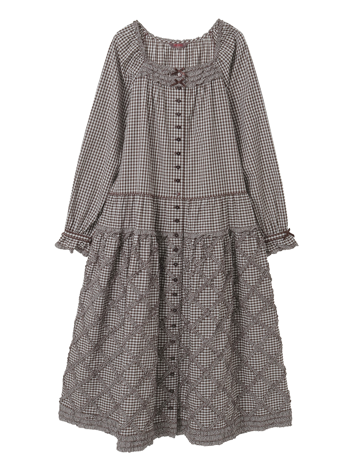 首まわりや袖まわりにあしらって。さらにはスカート部分に格子状に飾り立てて可愛らしく。