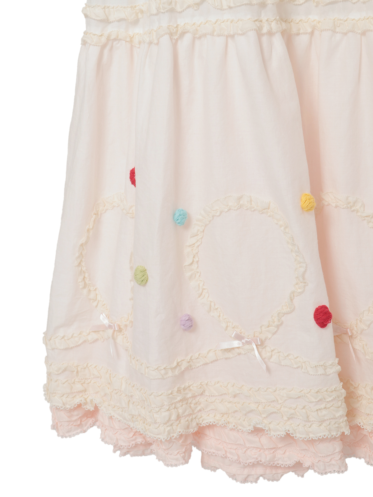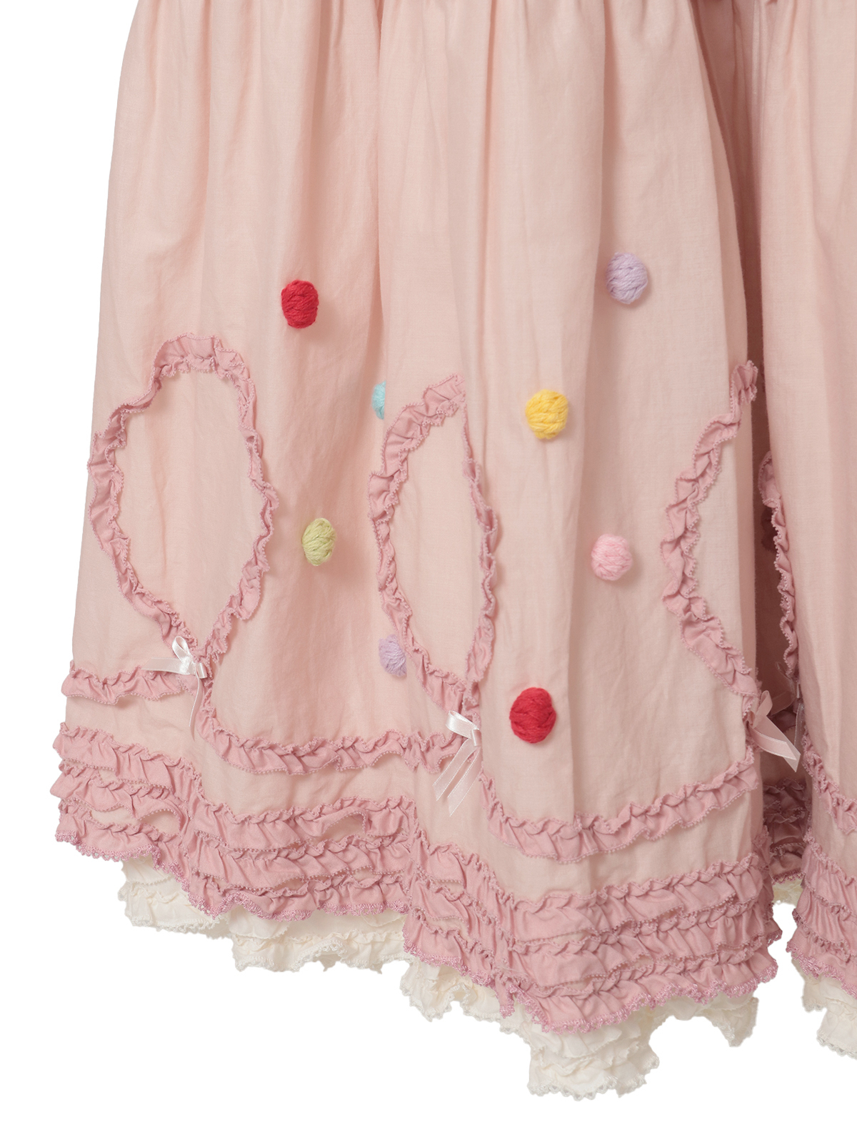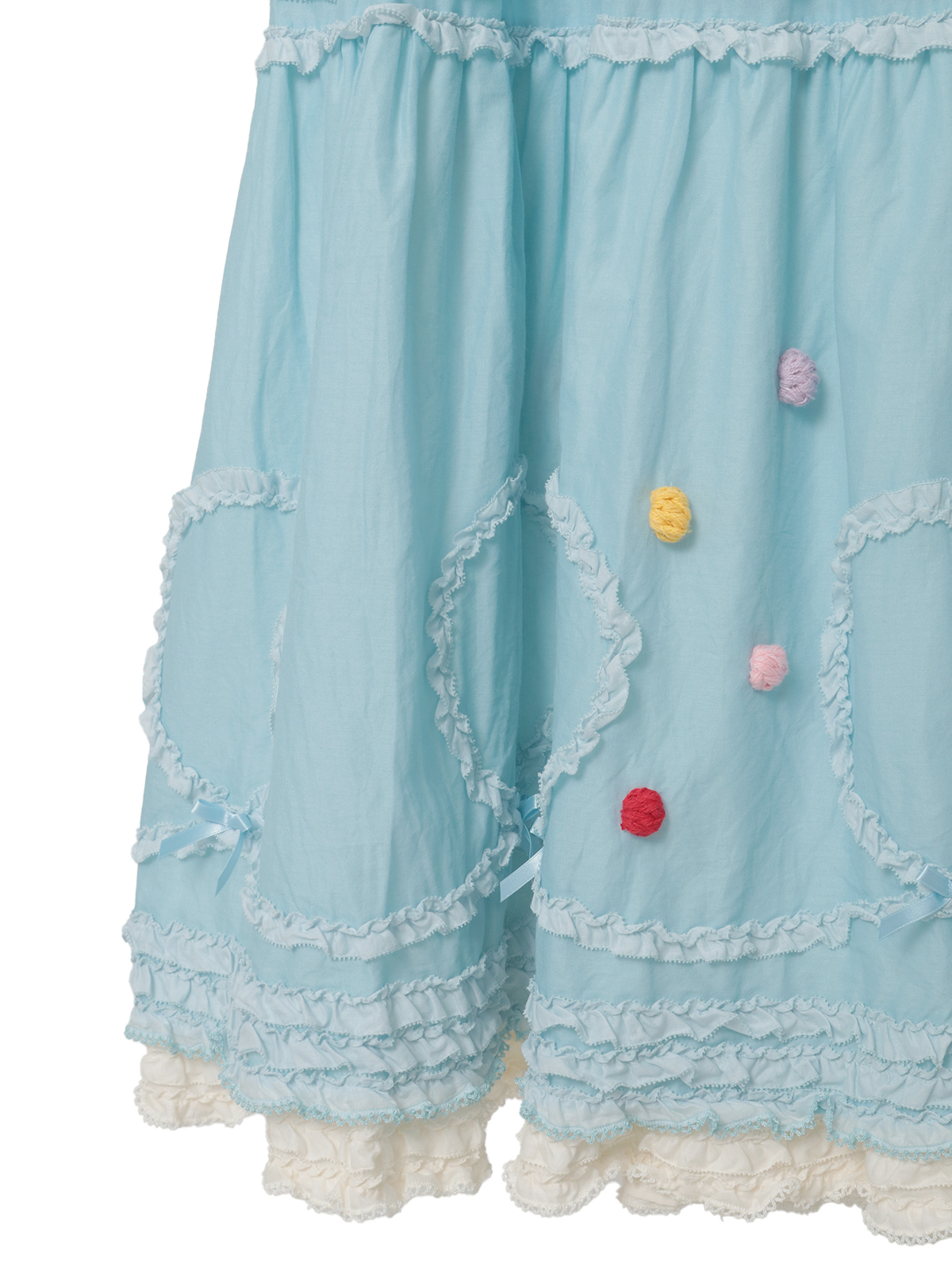 裾まわりの華やかなデティールの先にはローンのフリルをのぞかせて。ペチコートを重ねずに1枚で可愛いレイヤードスタイルが楽しめます。ローンのフリルはそれぞれのカラーに合わせて配色使いしているところもポイントに。