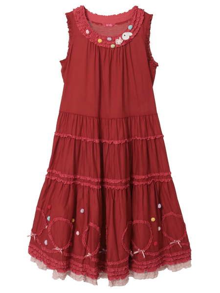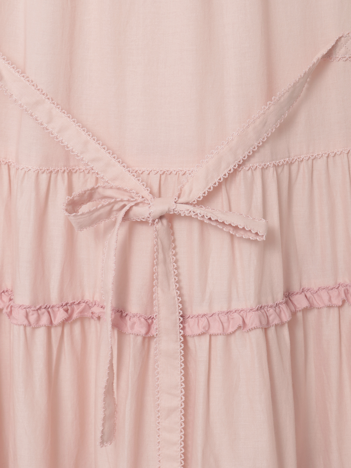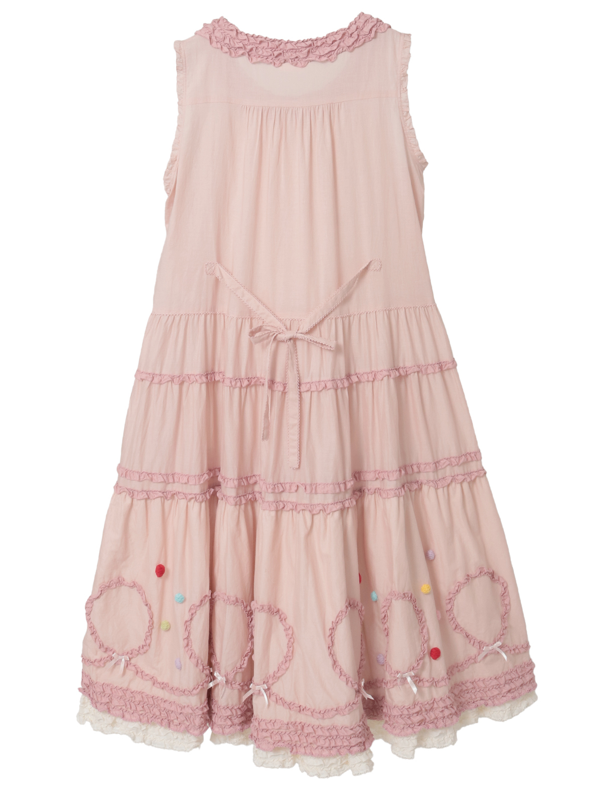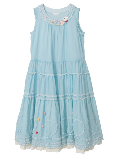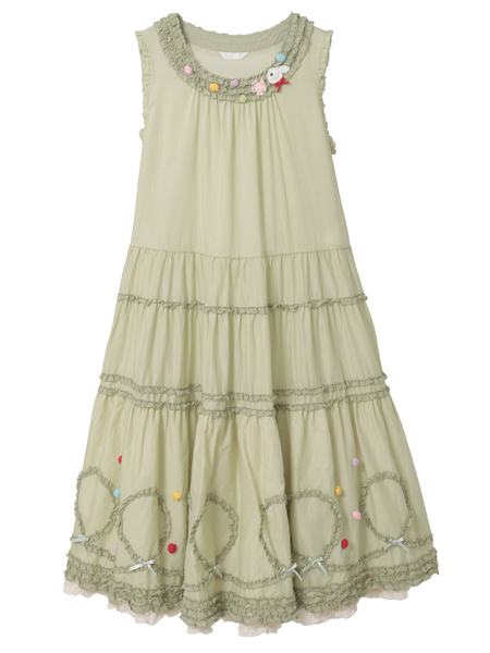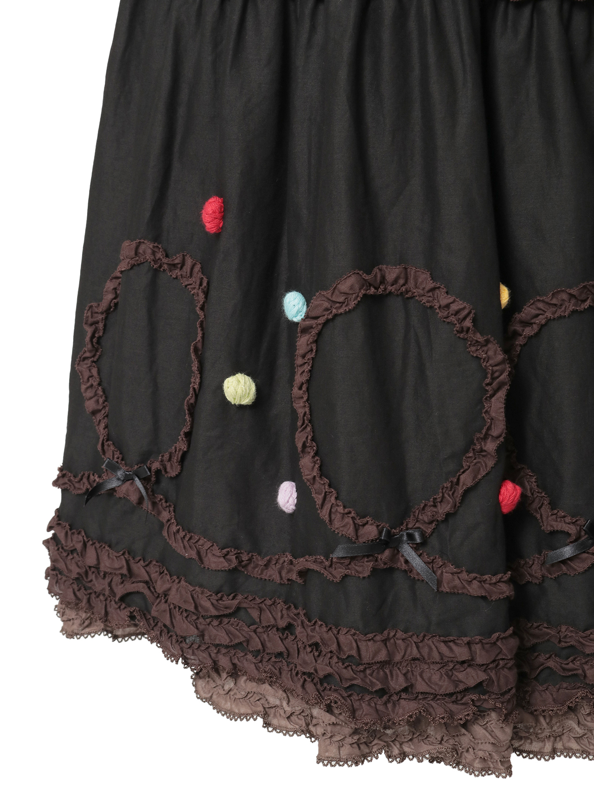裾まわりの華やかなデティールの先にはローンのフリルをのぞかせて。ペチコートを重ねずに1枚で可愛いレイヤードスタイルが楽しめます。ローンのフリルはそれぞれのカラーに合わせて配色使いしているところもポイントに。