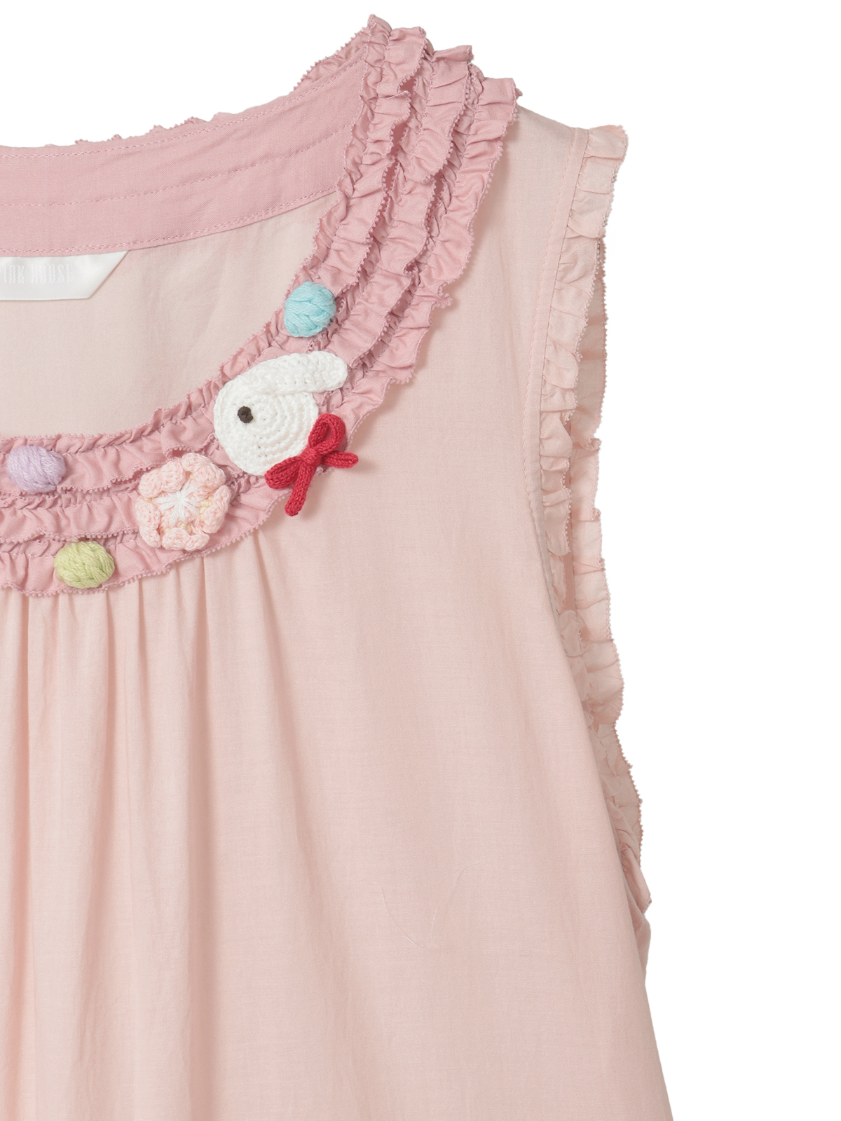 首まわりのフリルには、「おいり」をイメージしたカラフルなポップルをあしらって。さらにうさぎのモチーフと桜のモチーフも飾って可愛らしく。