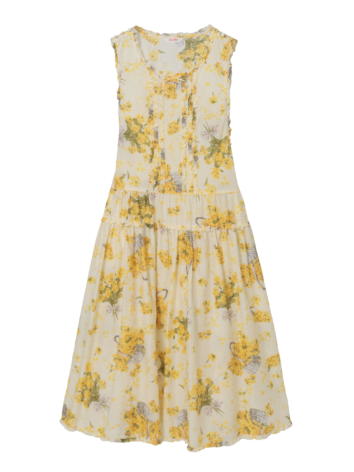 「なのはなプリント」のミディワンピースは、フロントにタックとフリルのデティールをあしらったキュートでフェミニンな装いに。