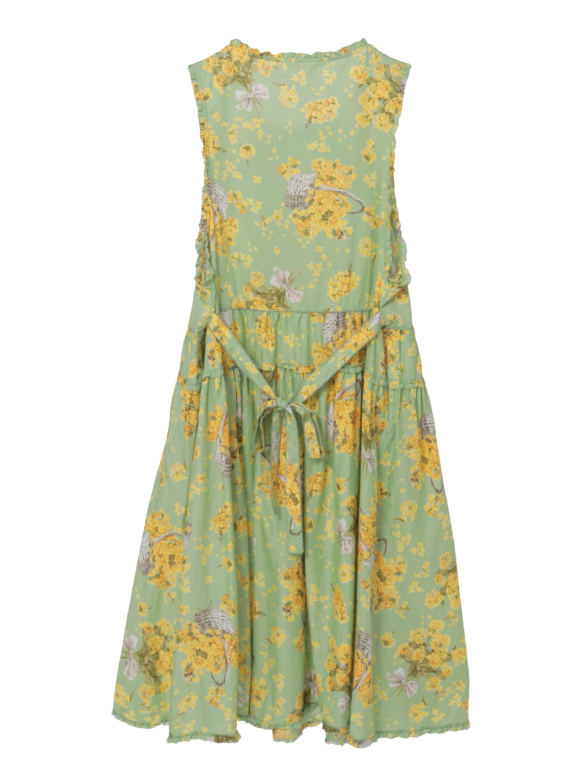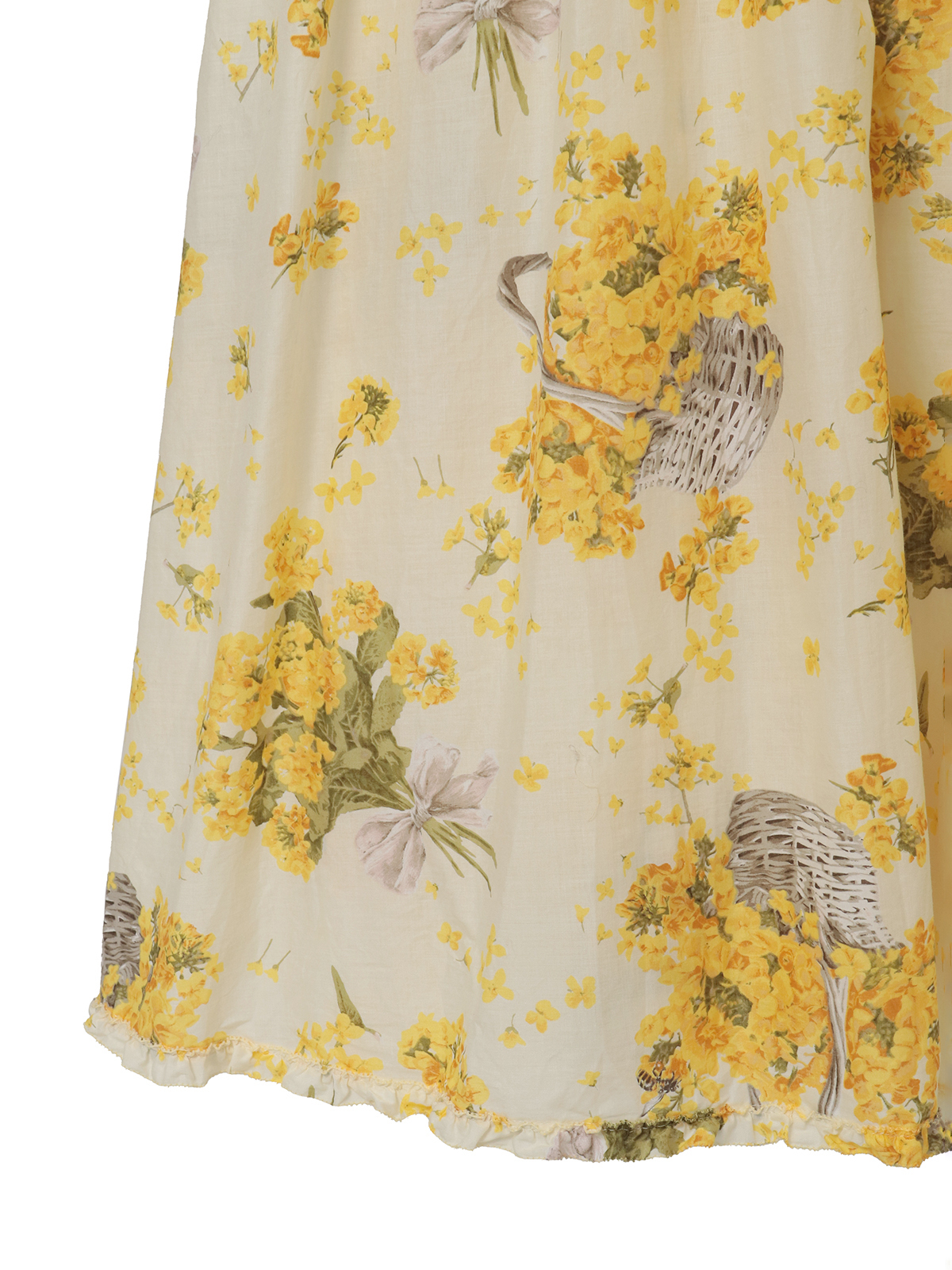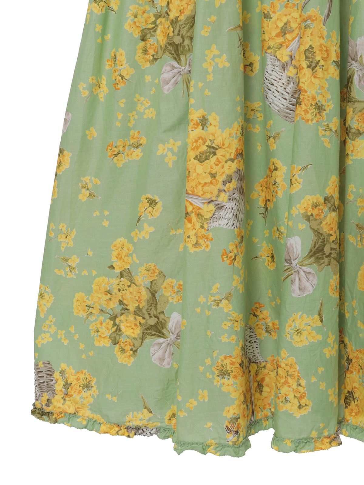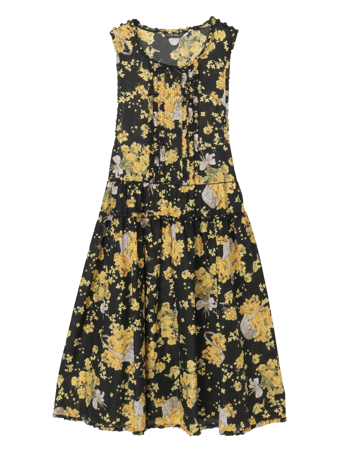 「なのはなプリント」のミディワンピースは、フロントにタックとフリルのデティールをあしらったキュートでフェミニンな装いに。