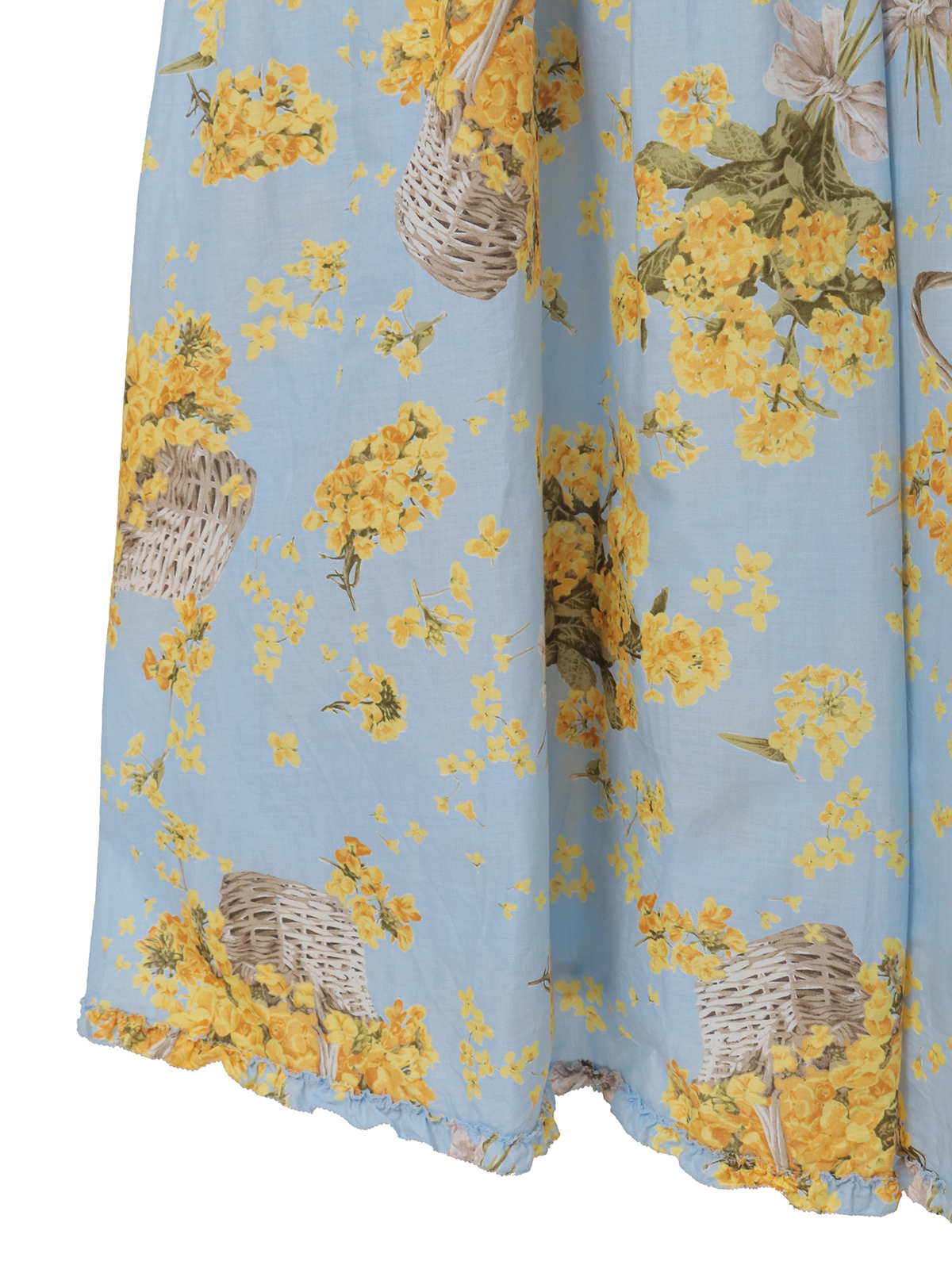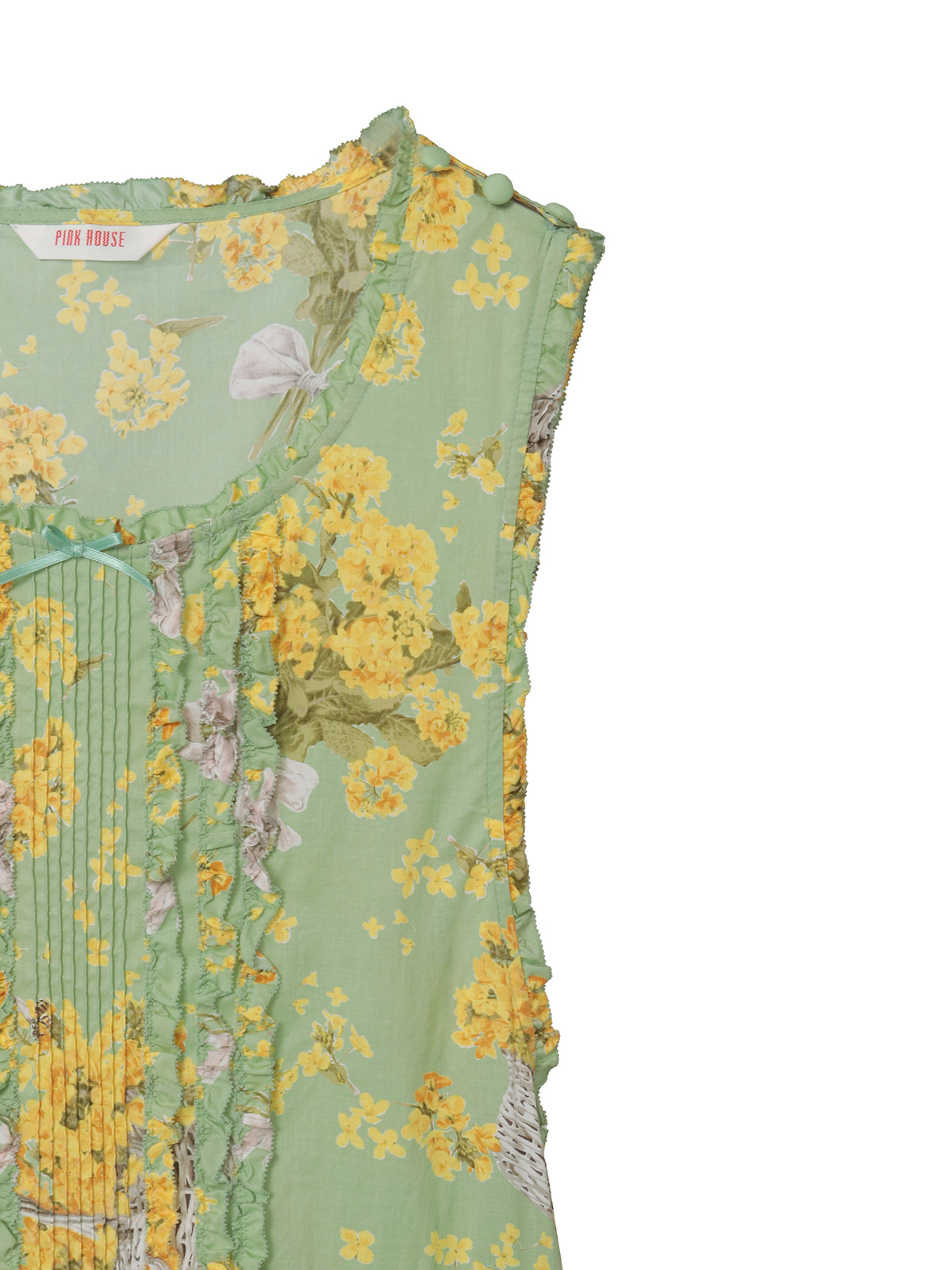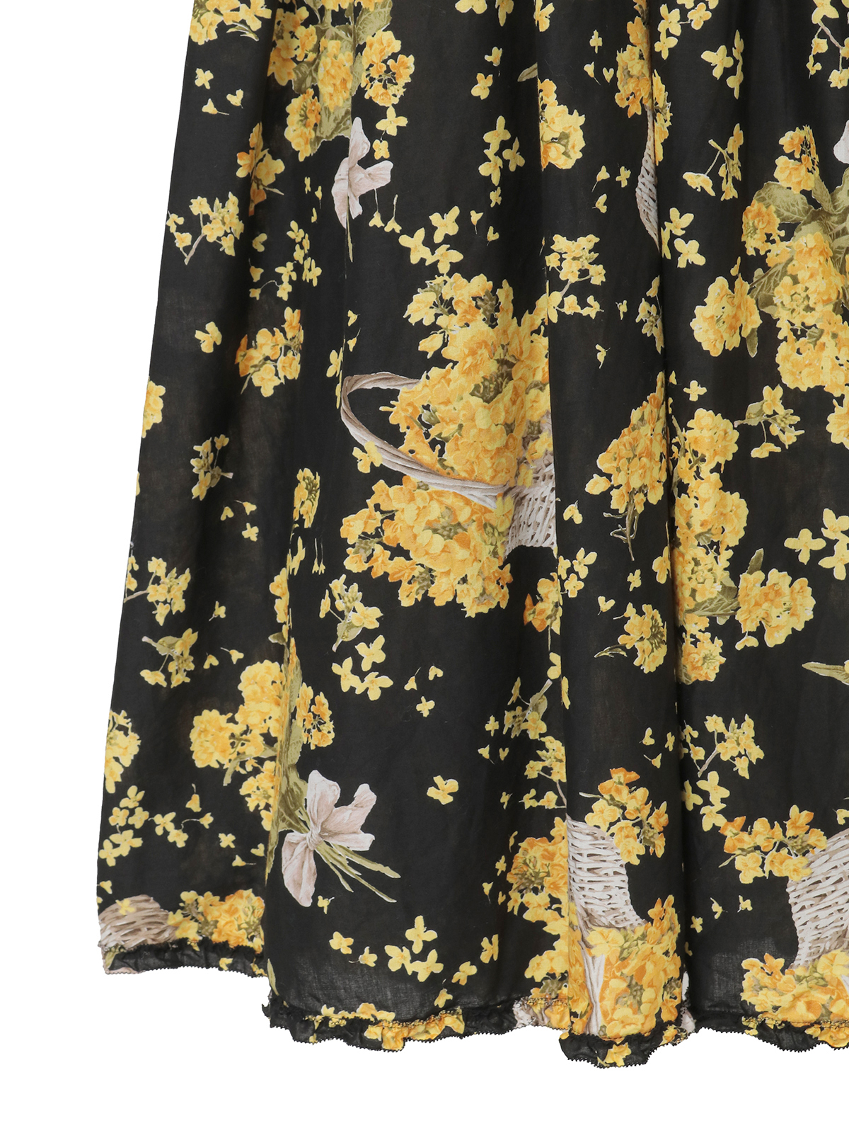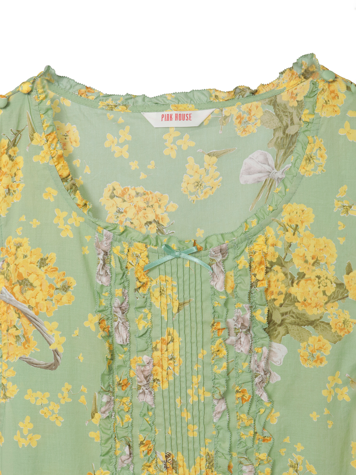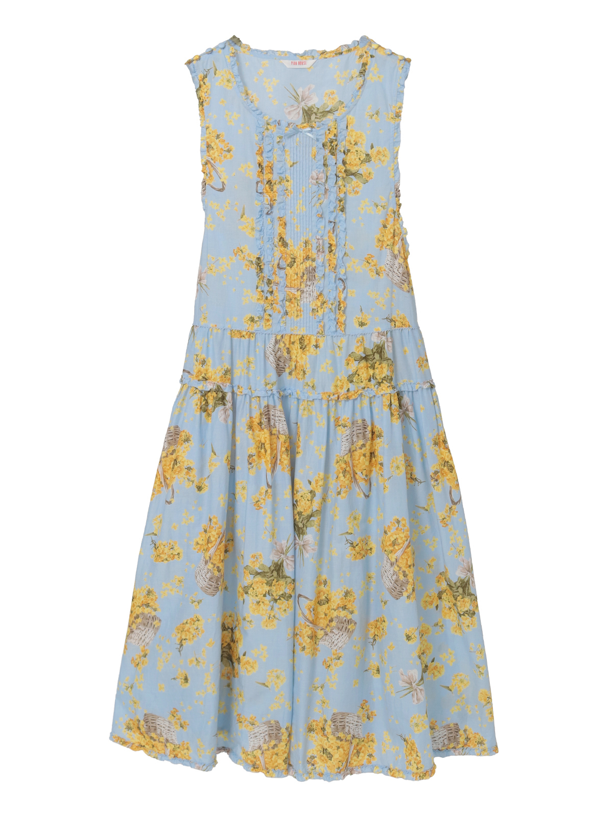 「なのはなプリント」のミディワンピースは、フロントにタックとフリルのデティールをあしらったキュートでフェミニンな装いに。