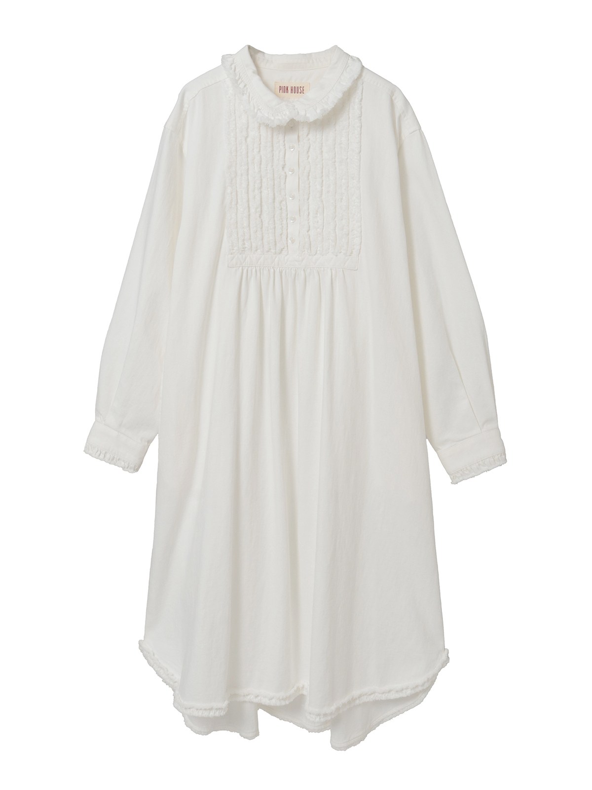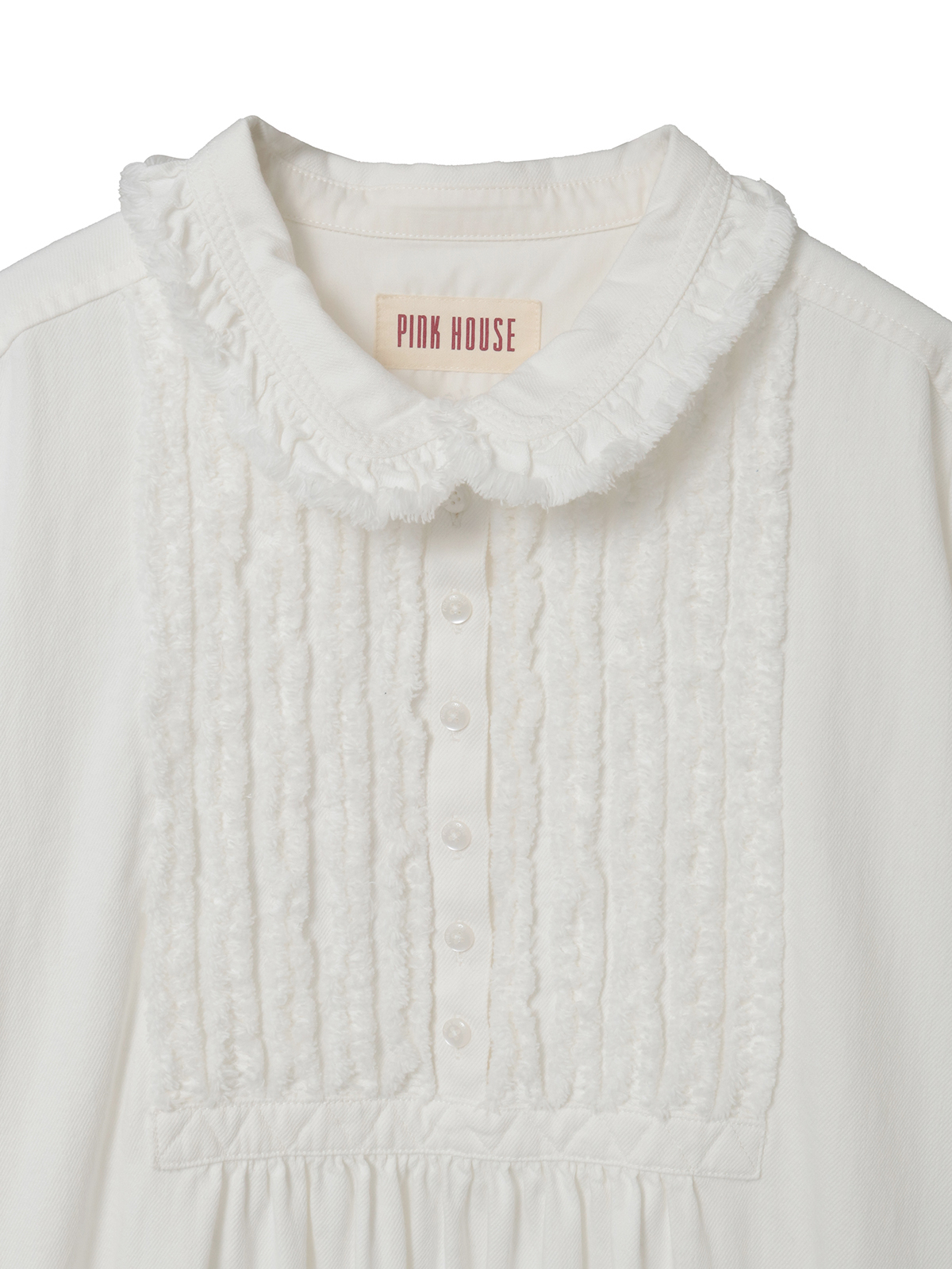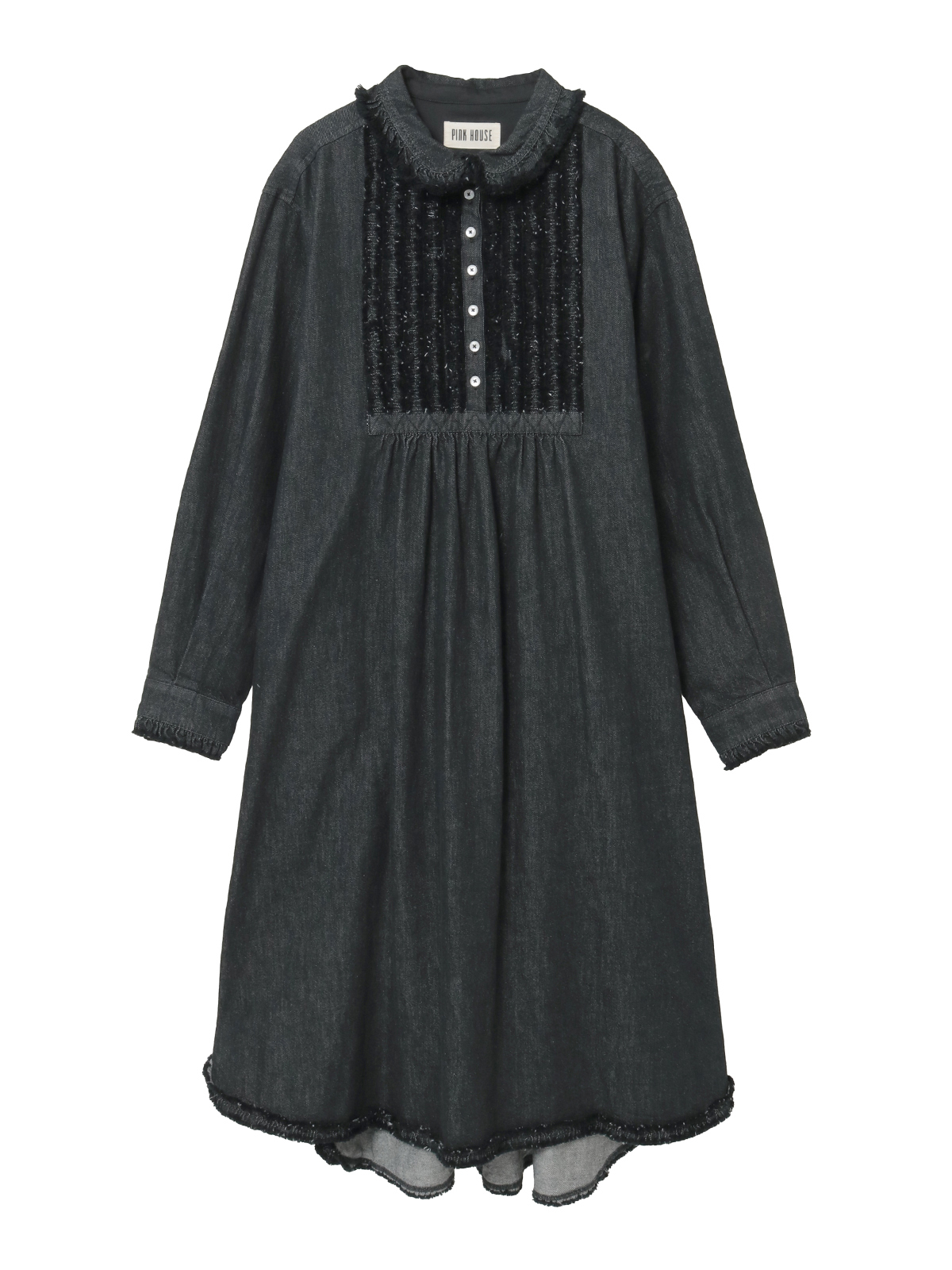 フリンジ加工を施した共布のフリルをフロント部分にあしらって華やかに。衿と裾まわりにもフリンジ加工を施した華やかなフリルの縁取りを添えてアクセントにしています。