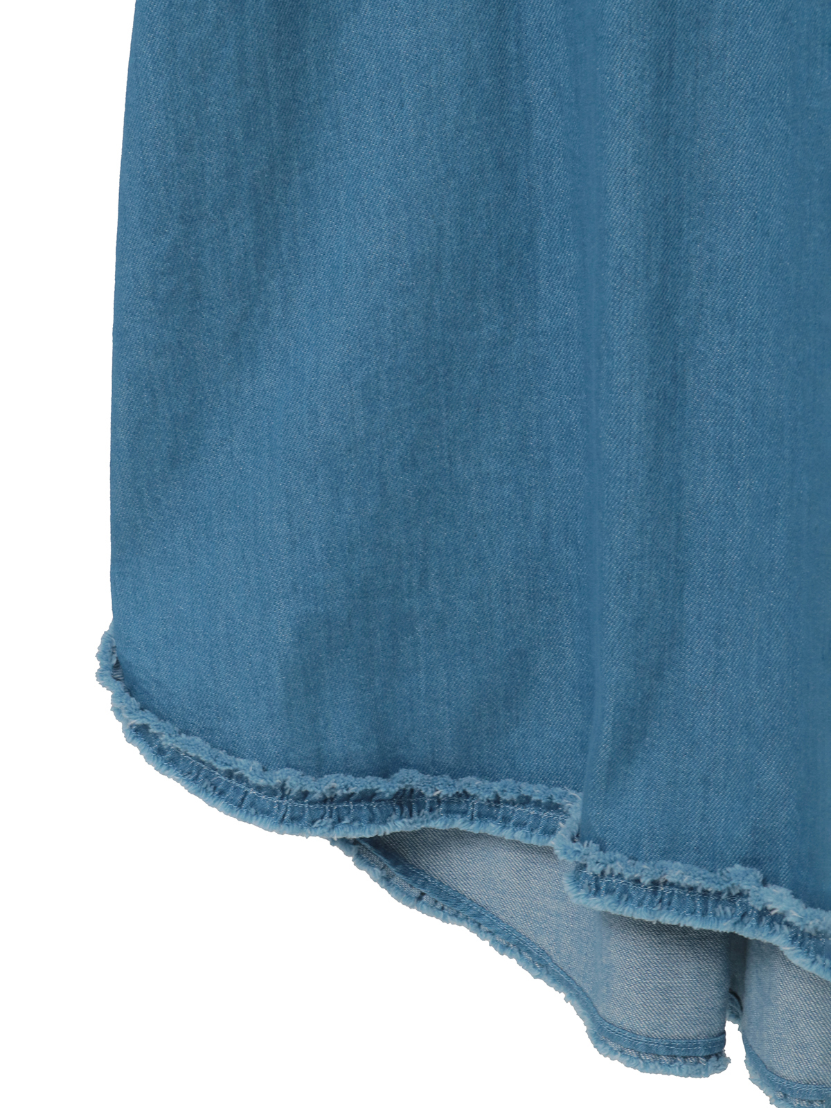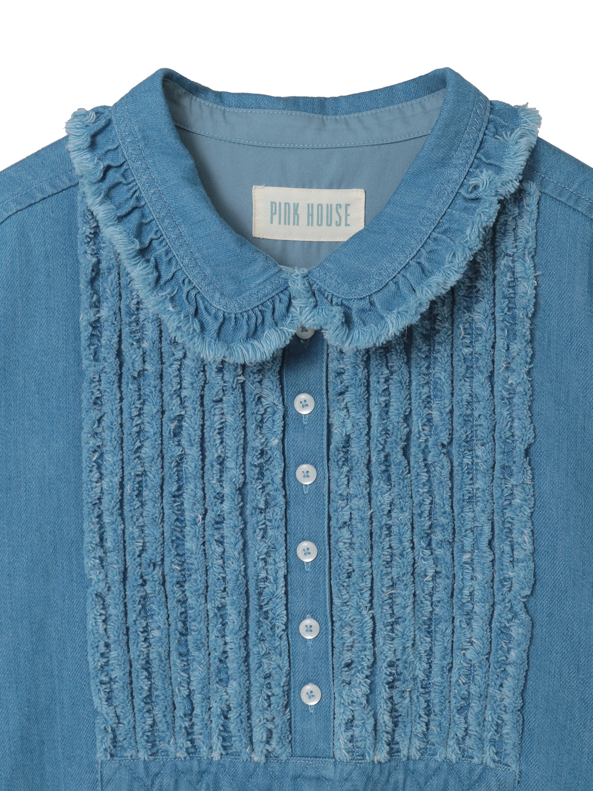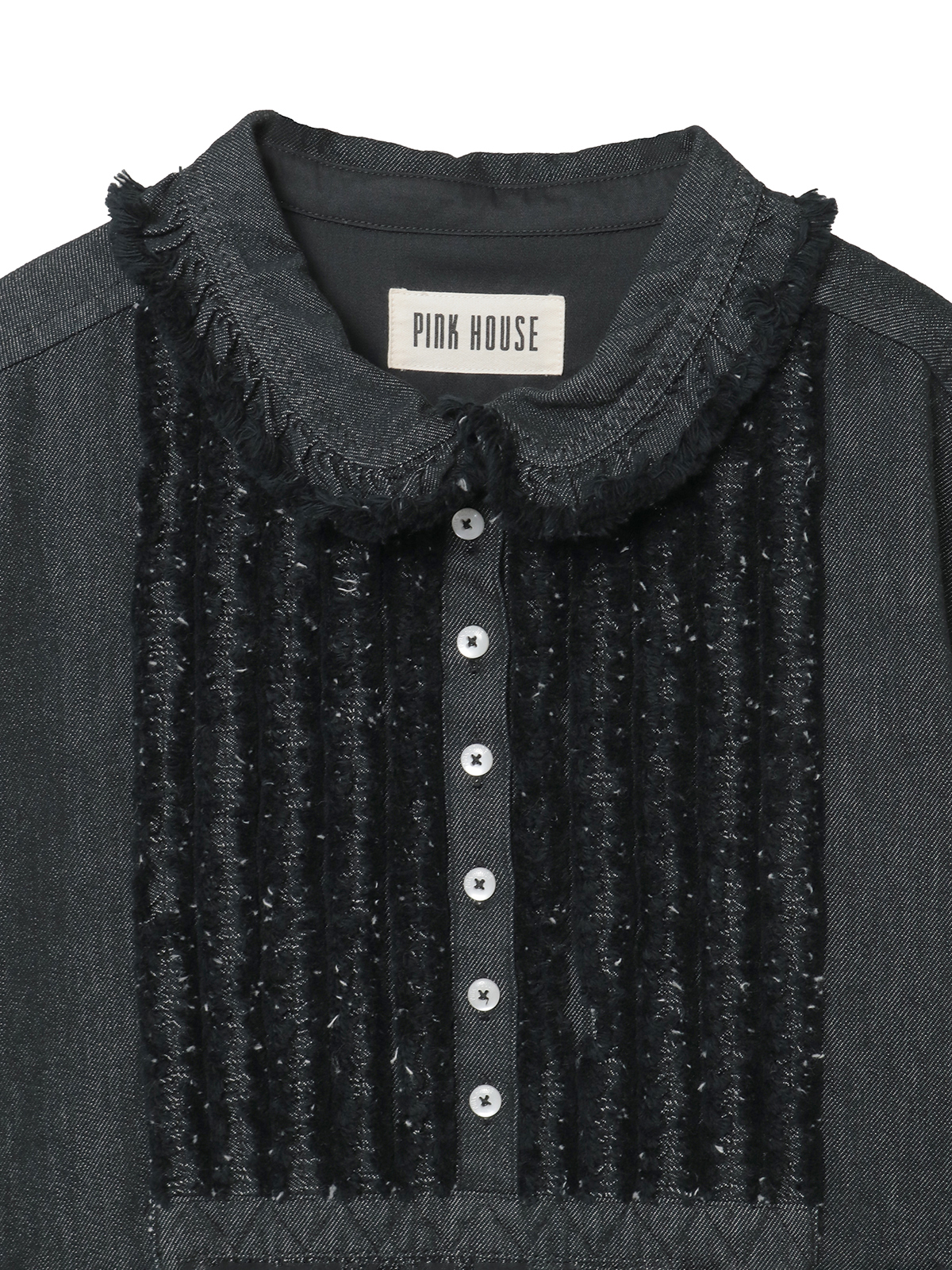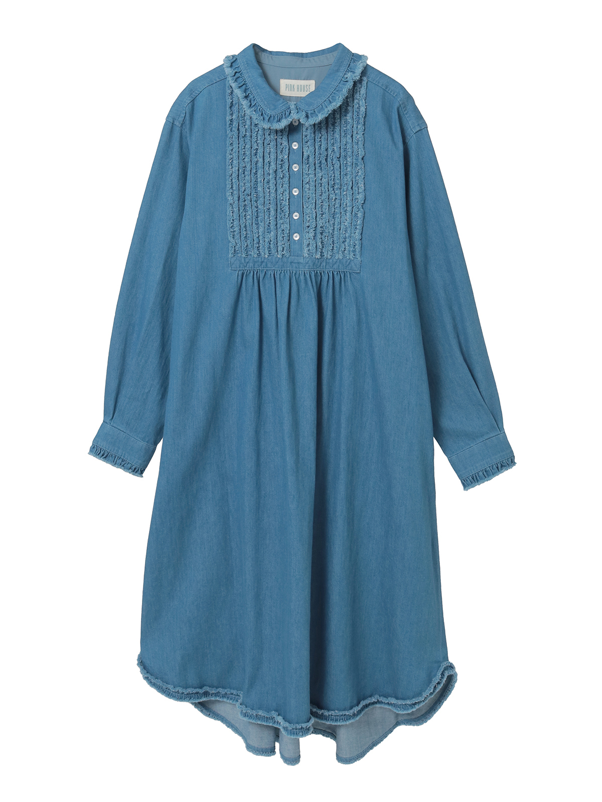 フリンジ加工を施した共布のフリルをフロント部分にあしらって華やかに。衿と裾まわりにもフリンジ加工を施した華やかなフリルの縁取りを添えてアクセントにしています。