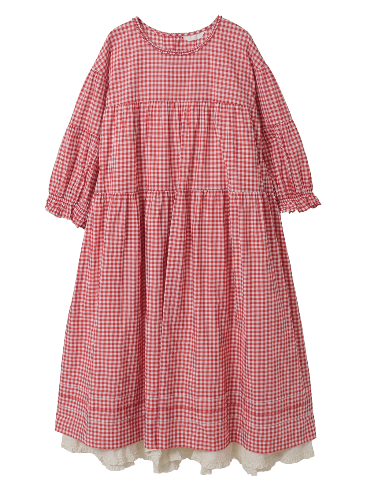 ギンガムチェックのティアードワンピースの裾から無地のフリルをのぞかせて、1枚でなかにペチコートを重ねてる風な着こなしが楽しめるレイヤードワンピース。