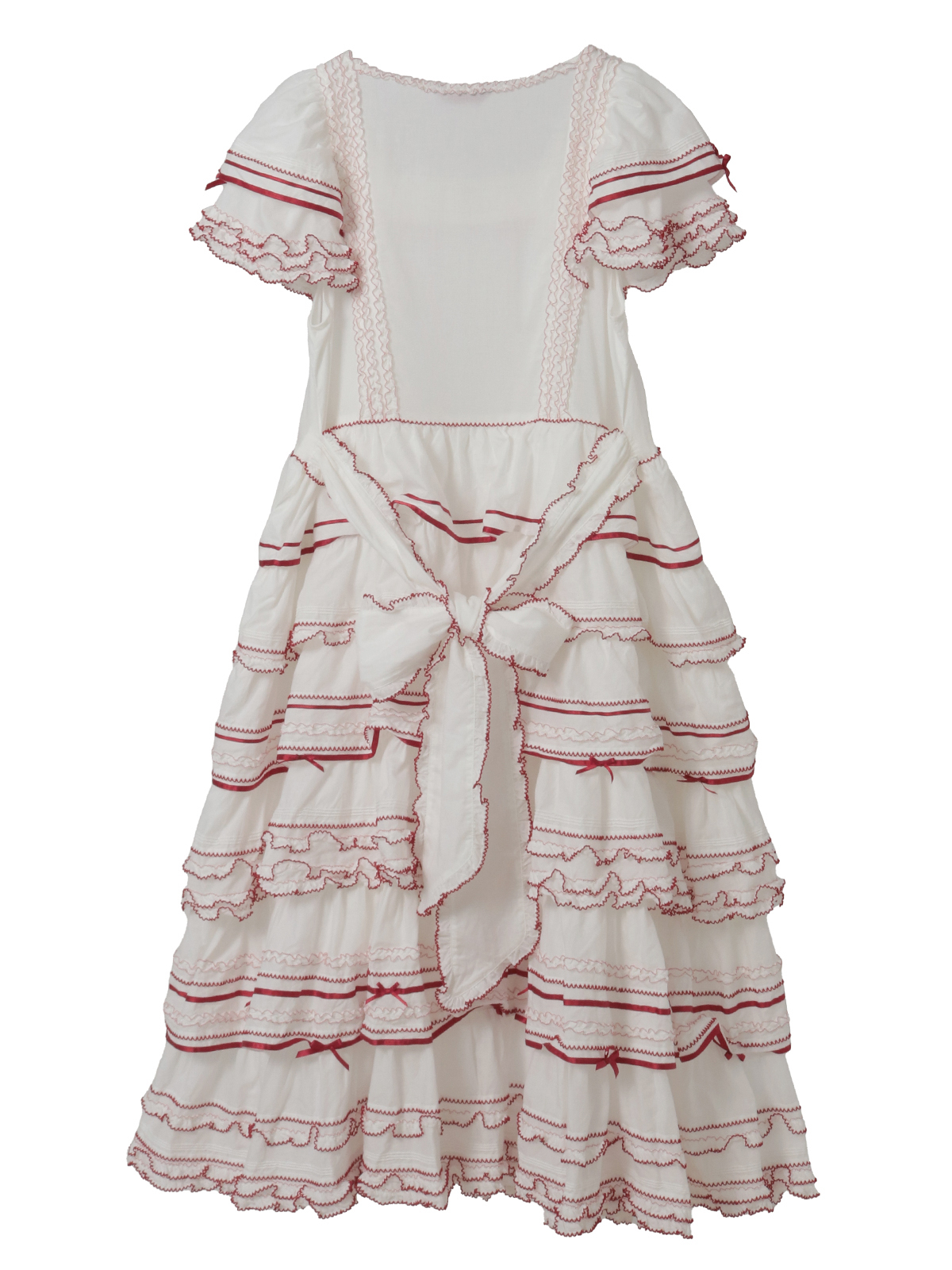 細幅のサテンリボンと交互にあしらってワンピースを可愛く飾り立てて豪華で華やかな仕上がりに。
