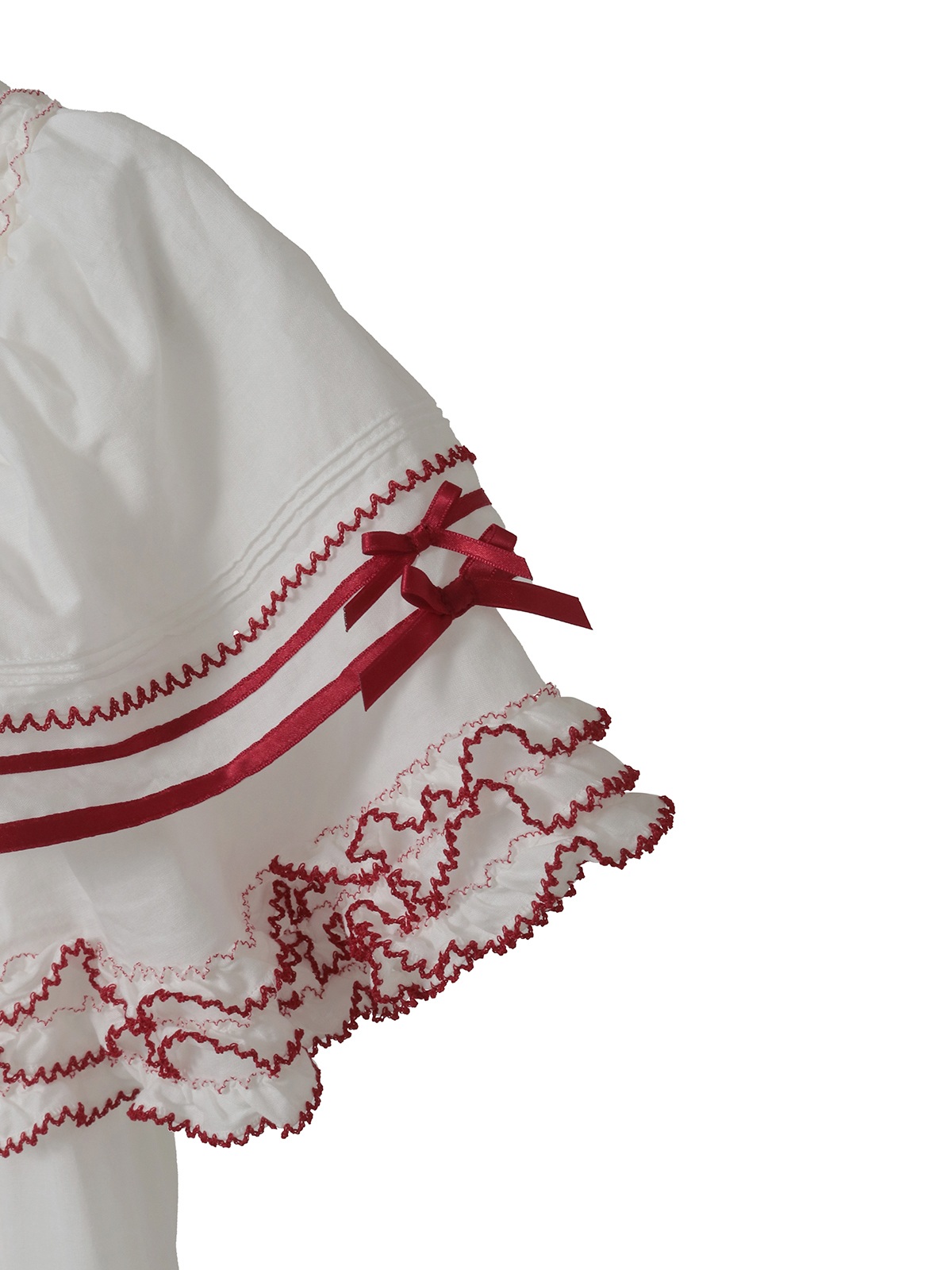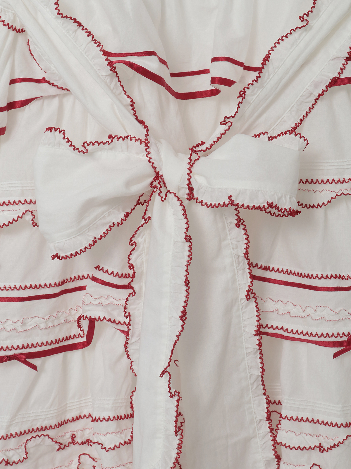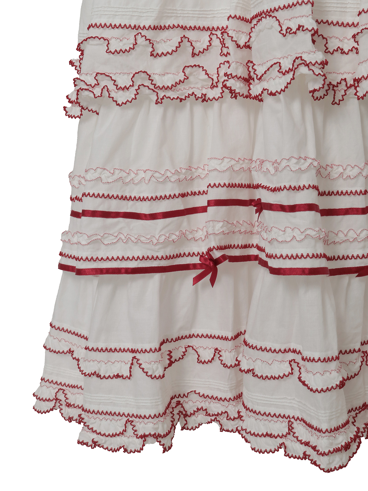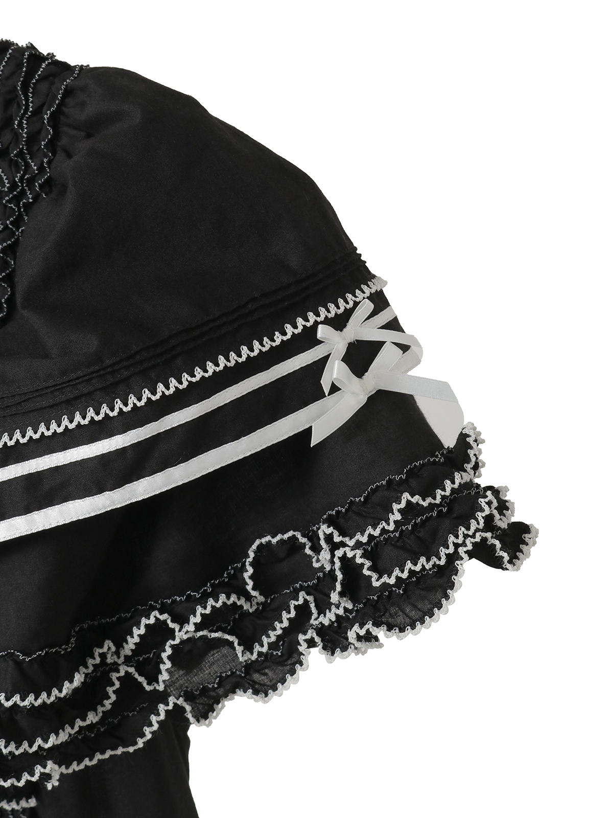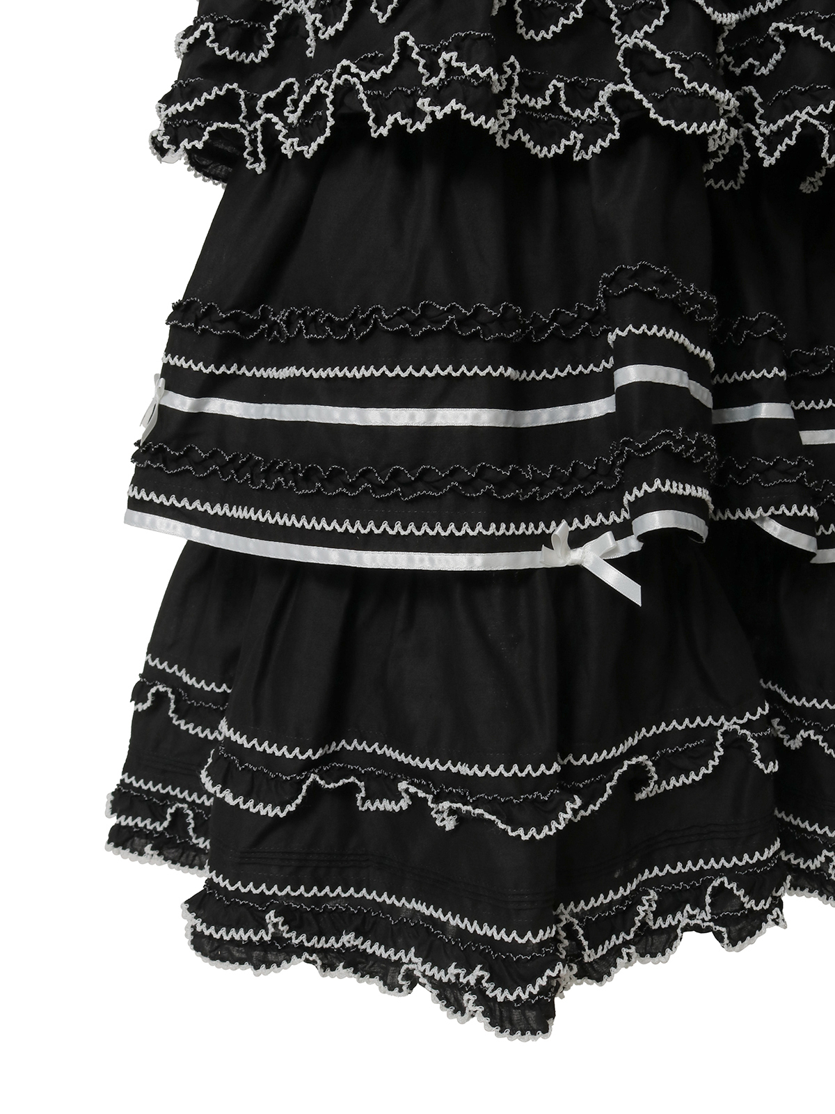 切り替えのところや裾まわりにあしらったフリルの先になどに、ピコット刺繍をあしらって。刺繍の糸は、クロにはシロ、シロにはアカを配色使いにしてきかせてアクセントに。