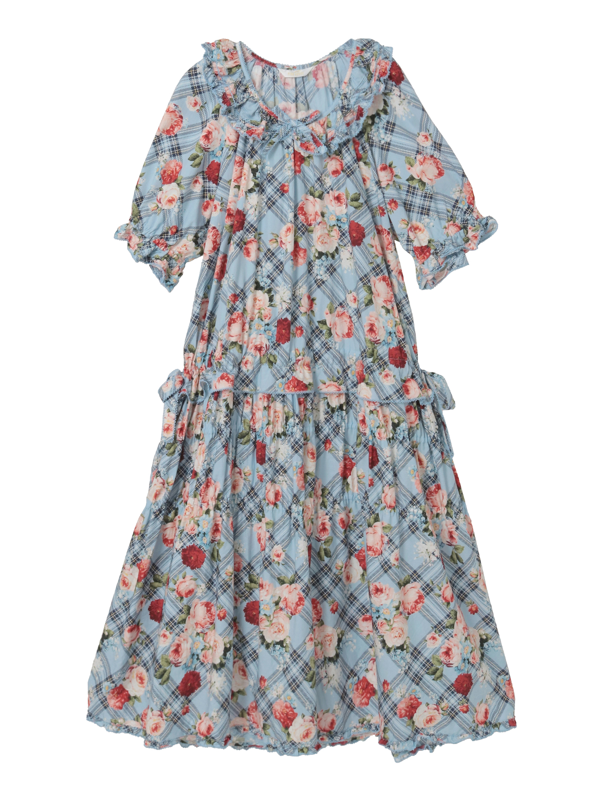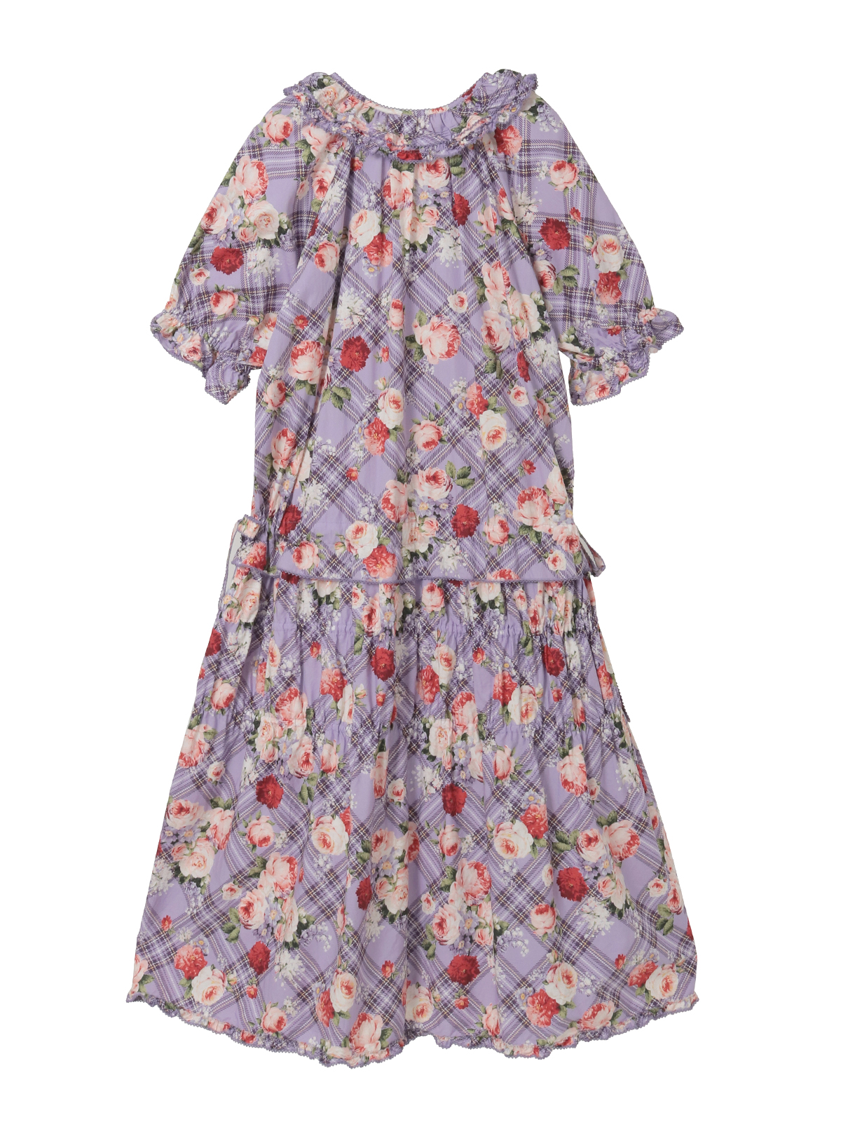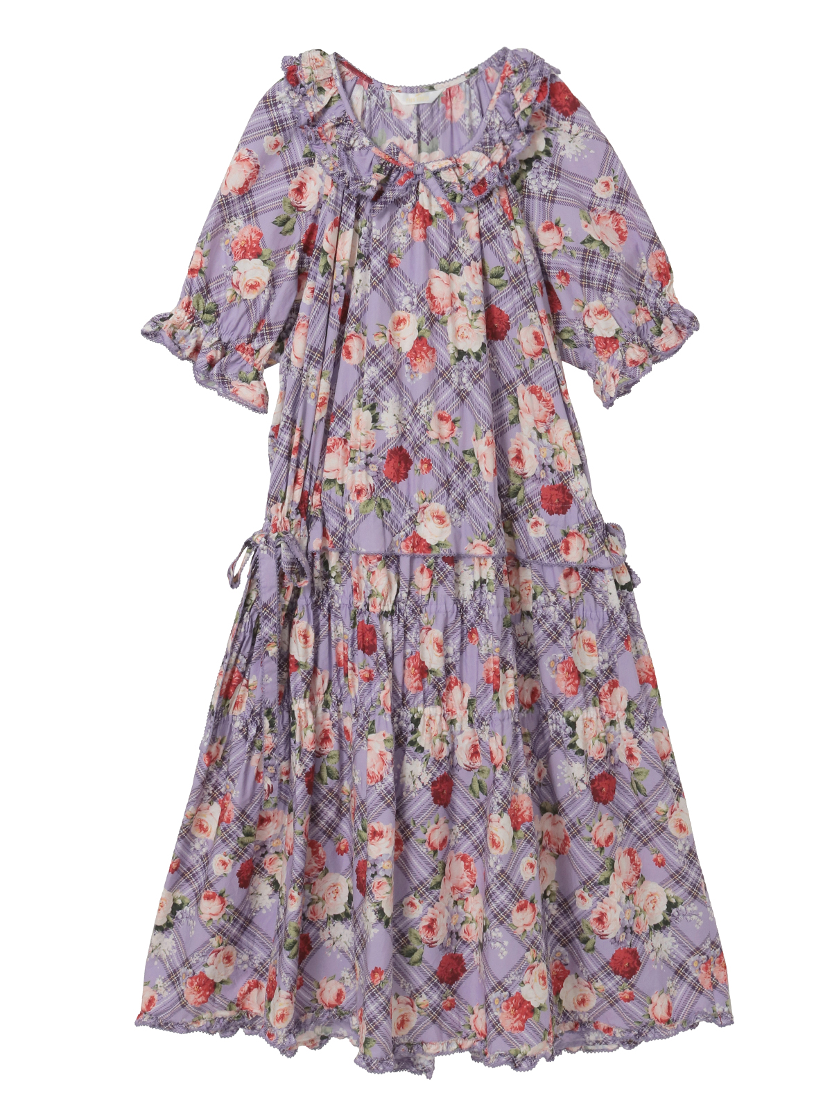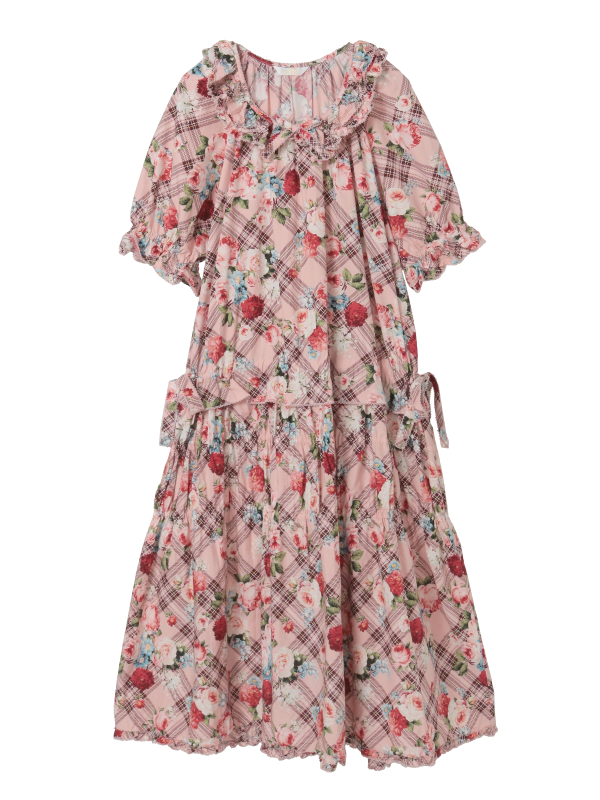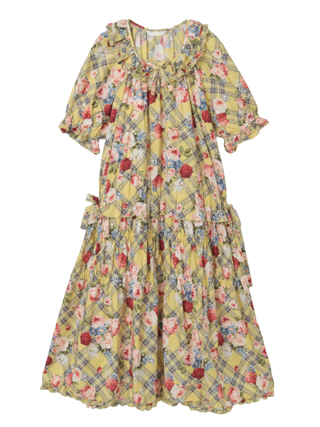 「フラワーチェックプリント」のミディ丈のワンピースは、軽めのパフスリーブにティアードシルエットで、1枚でも可愛く着られます。