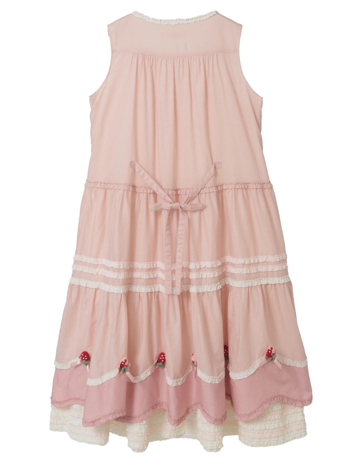 ピンク色のリボンと苺モチーフは、裾まわりのスカラップフリルのデザインのところにもあしらって華やかに。