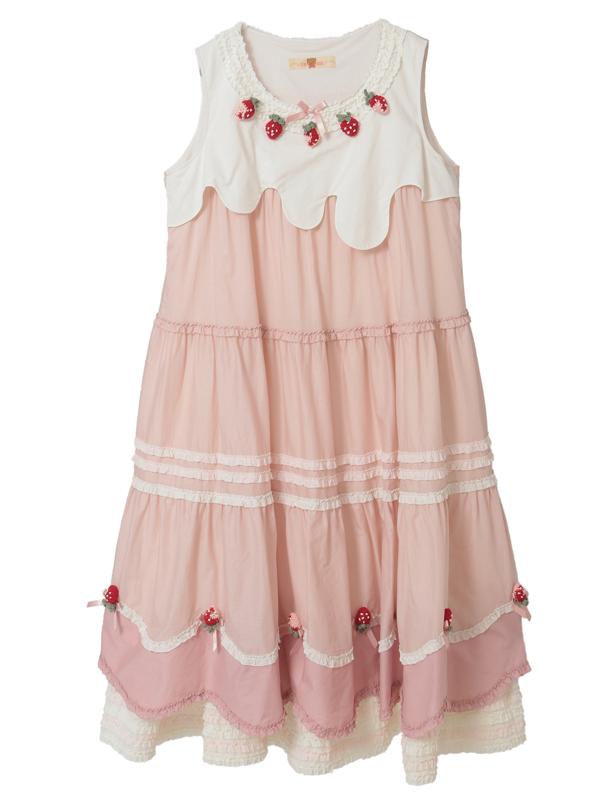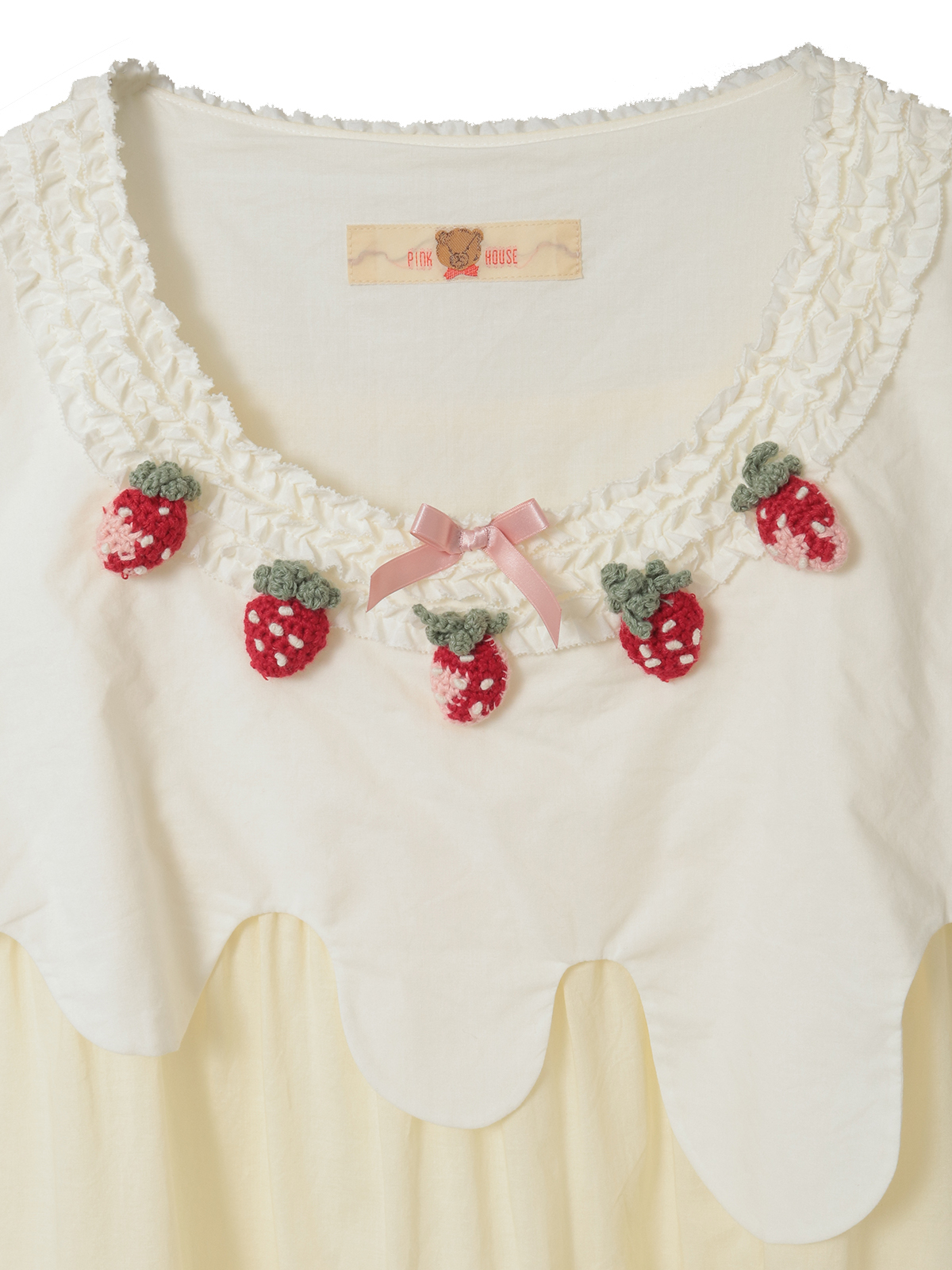 トップスの部分は、上からホイップクリームをかけているようなイメージ。首まわりにあしらったフリルのうえには、苺のニットモチーフをな5つ並べてトッピング。さらに首もとには、ピンク色のサテンリボンを添えて可愛らしく。