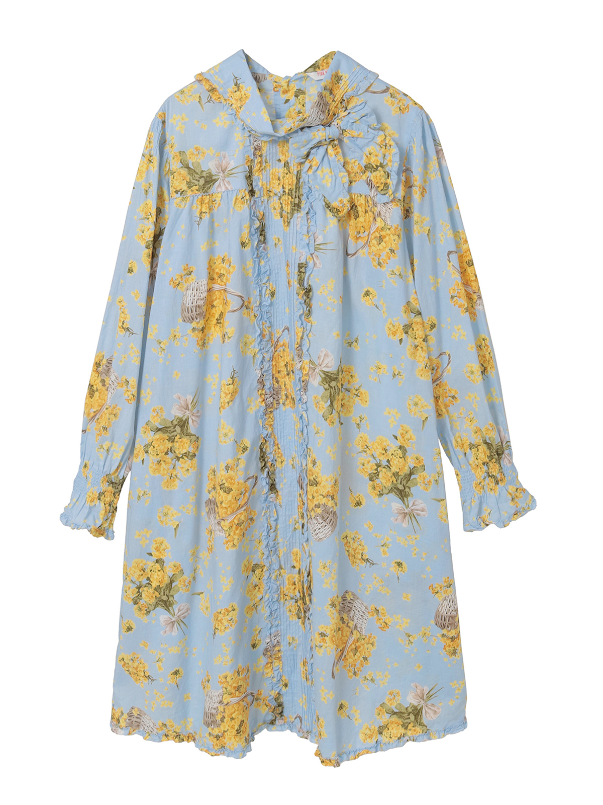 「なのはなプリント」のチュニックブラウスは、フロントにタックとフリルのデティールをあしらったキュートでフェミニンな装いに。