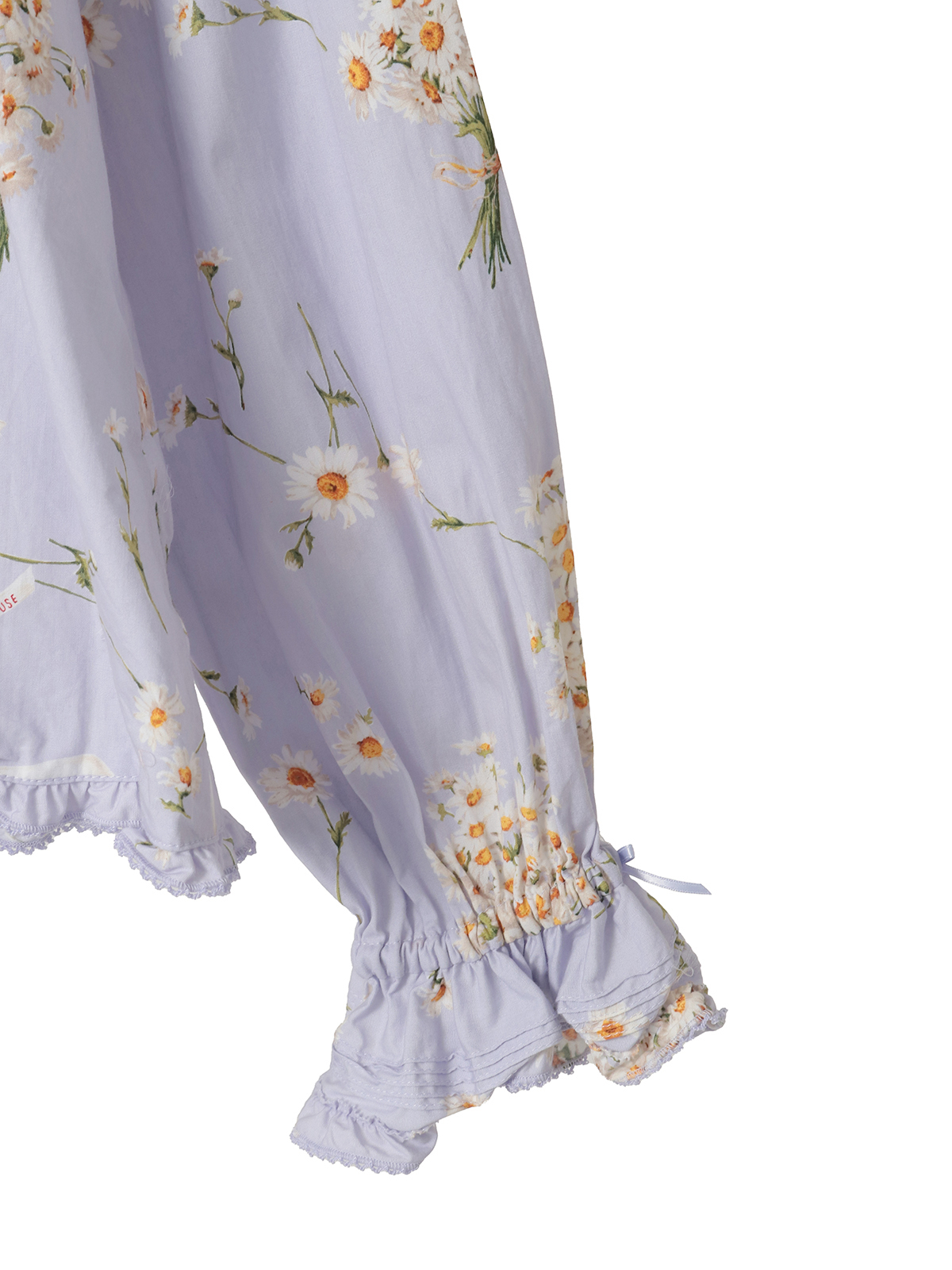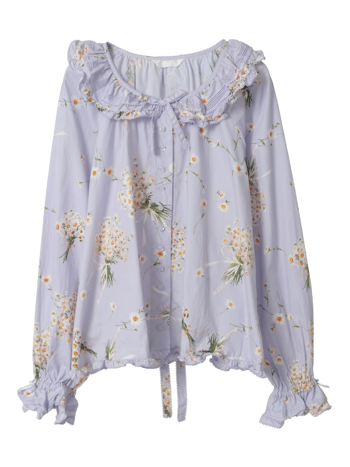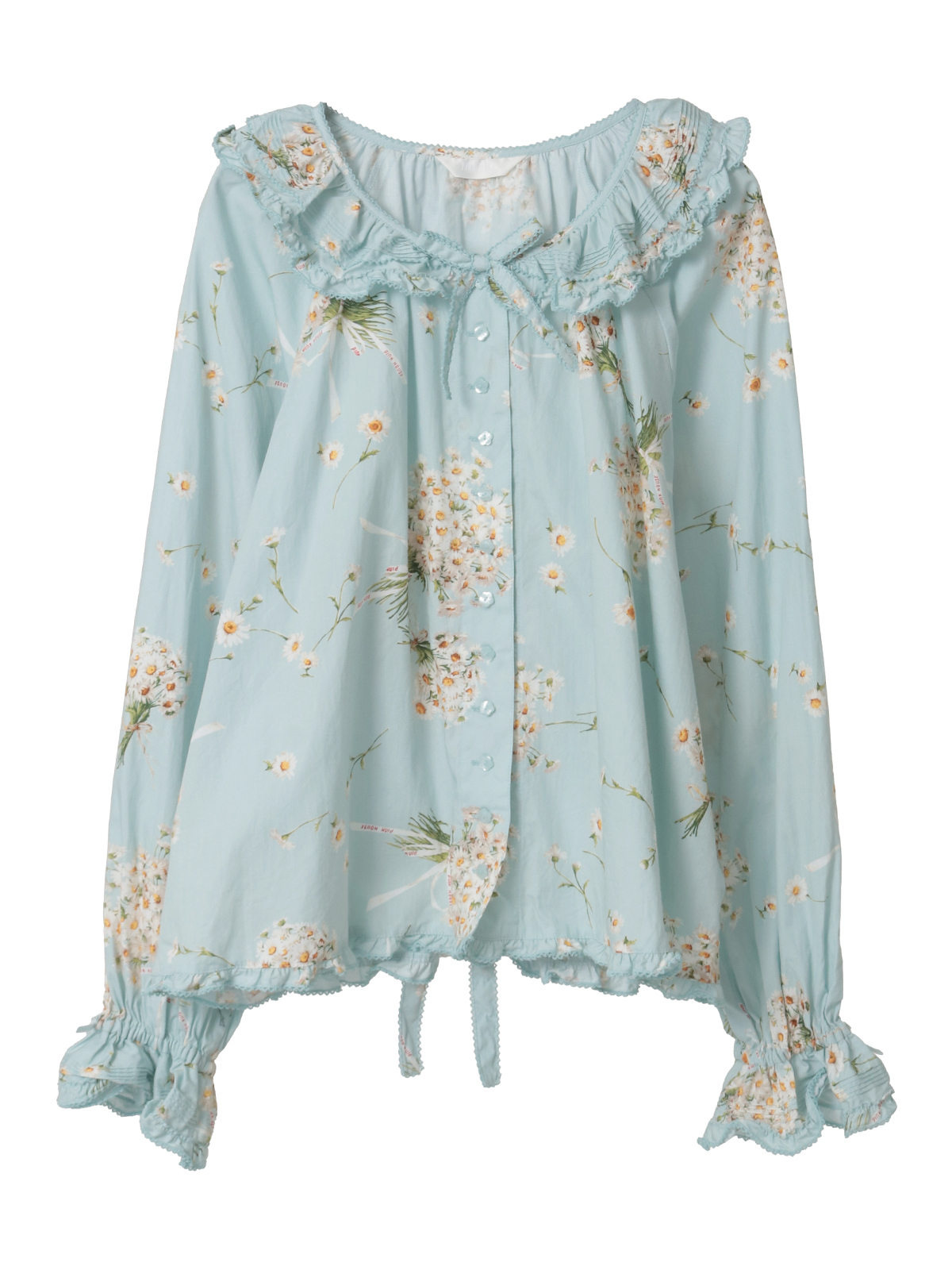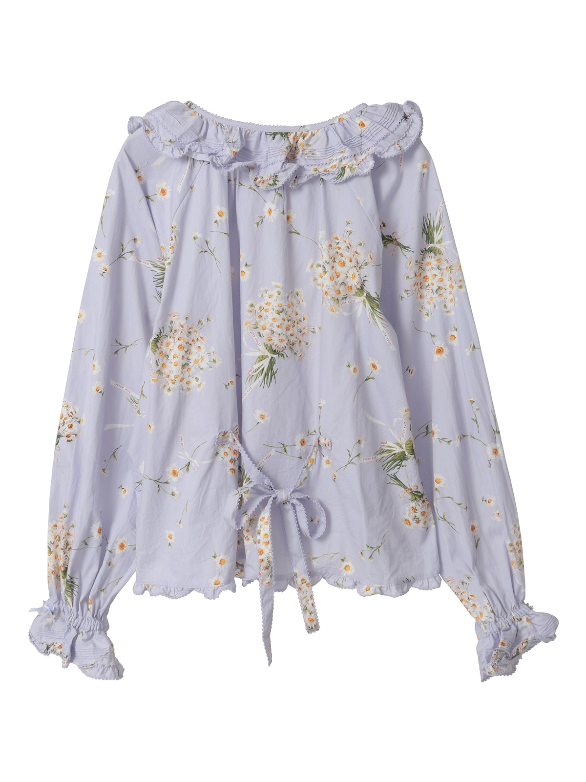 プリントのブラウスは、ピコフリルで縁取りした控えめな襟の付いた長袖で前開きのタイプ。