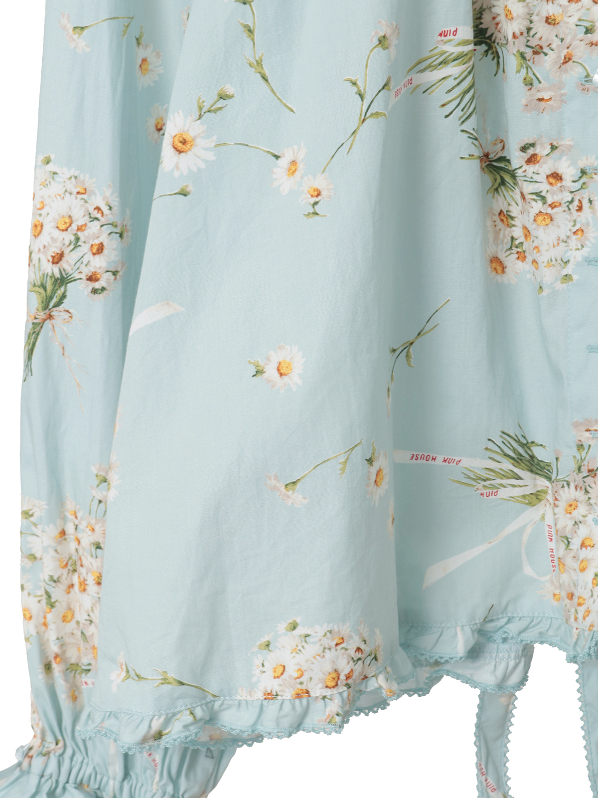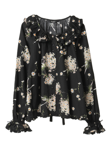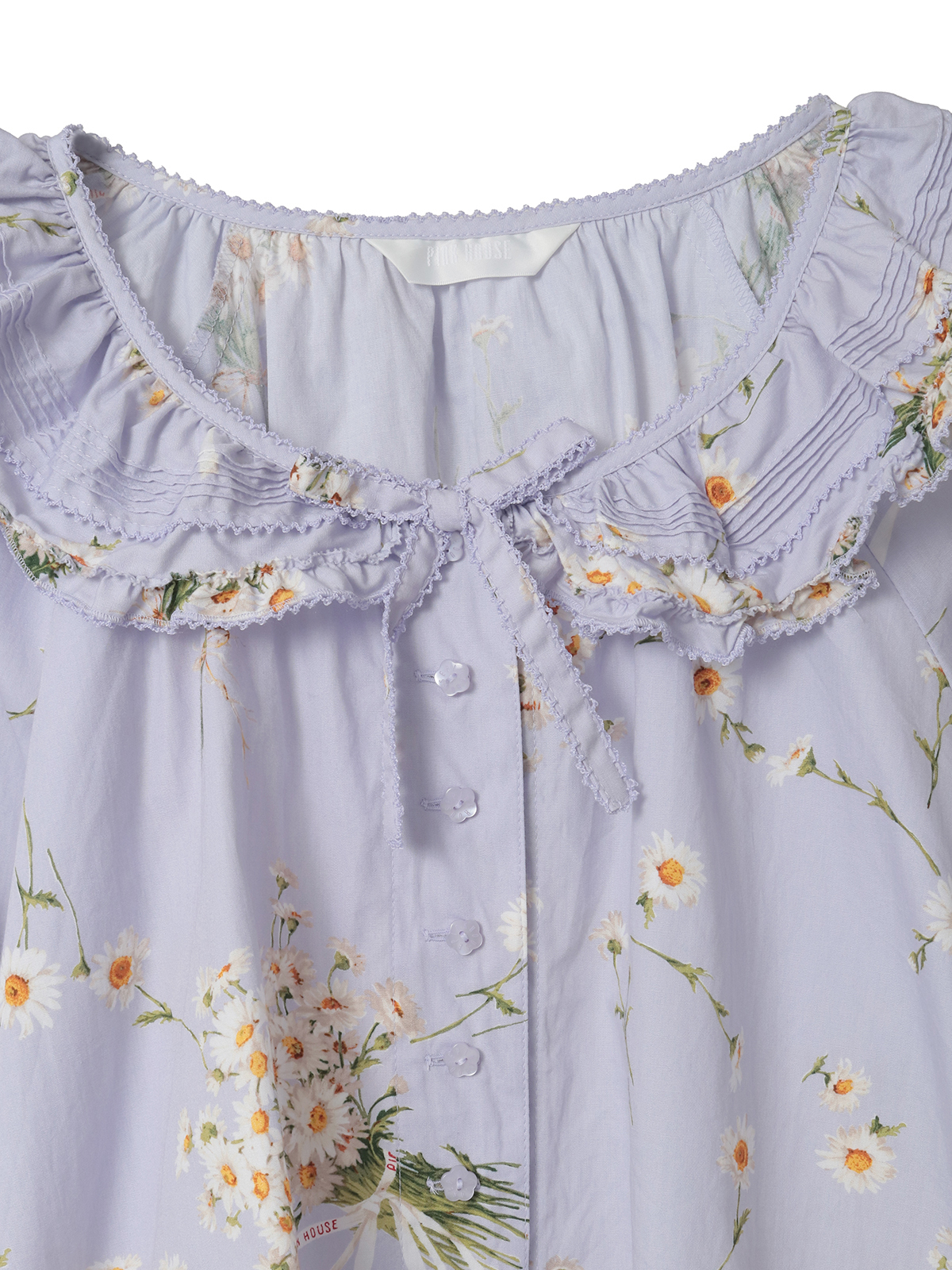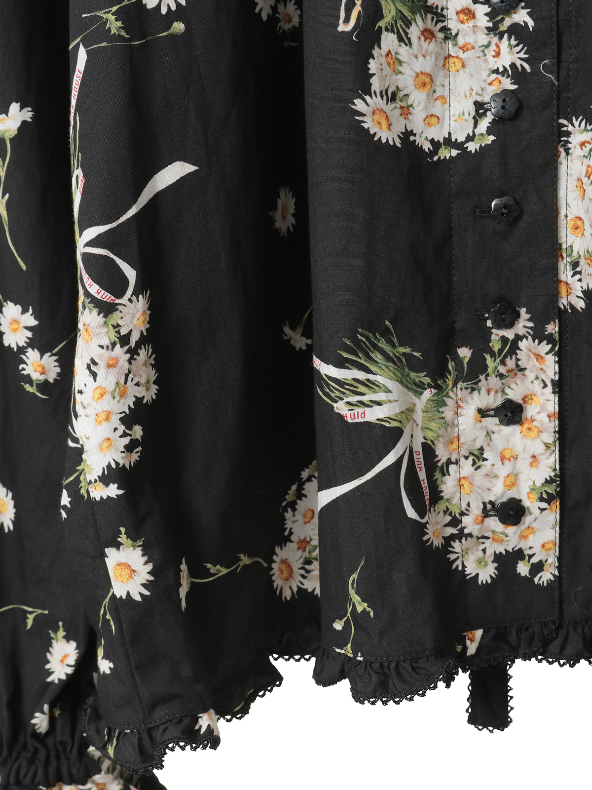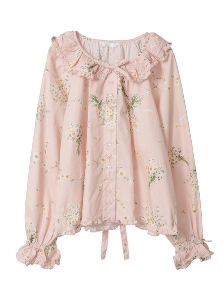 プリントのブラウスは、ピコフリルで縁取りした控えめな襟の付いた長袖で前開きのタイプ。