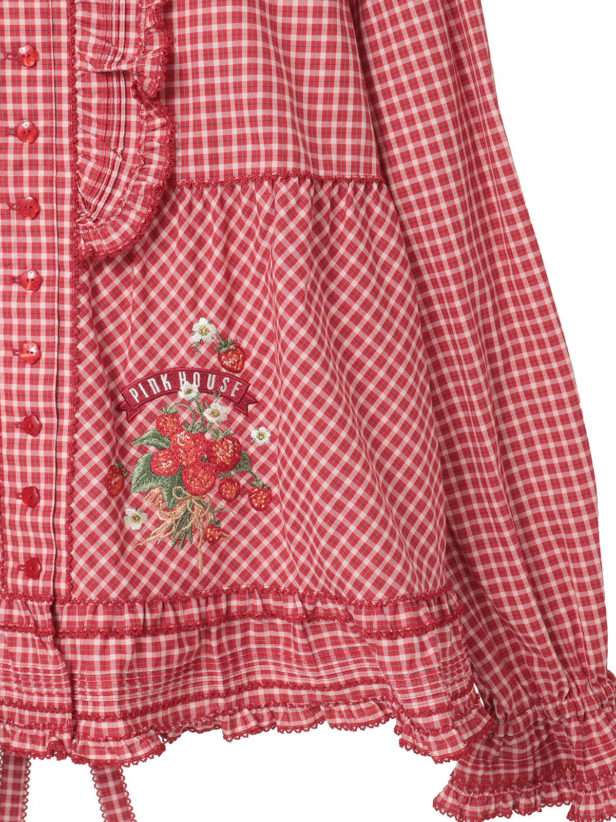 ピコフリルにピンタックをあしらった華やかなデティール使いは、襟はもろん、前たての横まわりや袖ぐち、そして裾まわりにもあしらって。