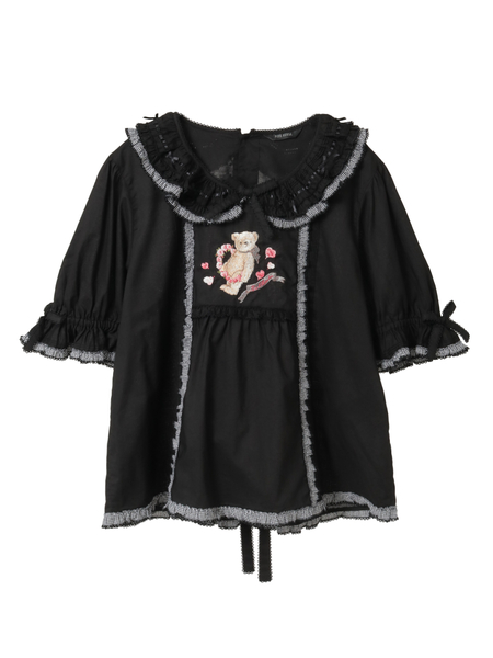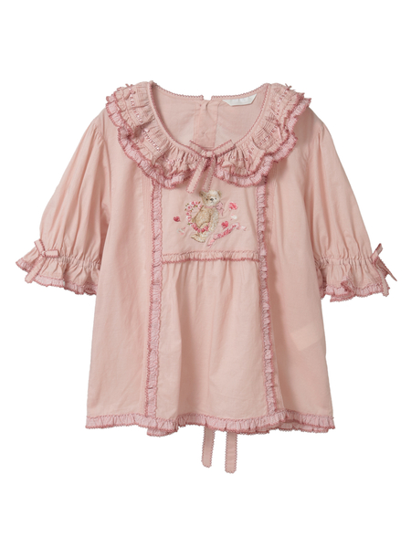 「テディローズプリント」に描かれた、幸せなローズ色に輝く薔薇の花たちと、穏やかな陽だまりのように優しく微笑むテディベアをモチーフに、フロントに繊細な刺繍をあしらった綿ローンのブラウス。