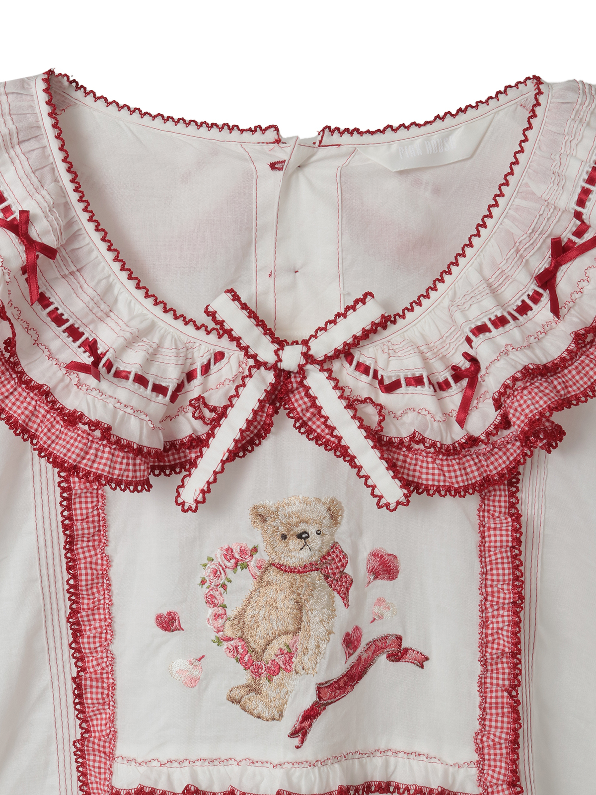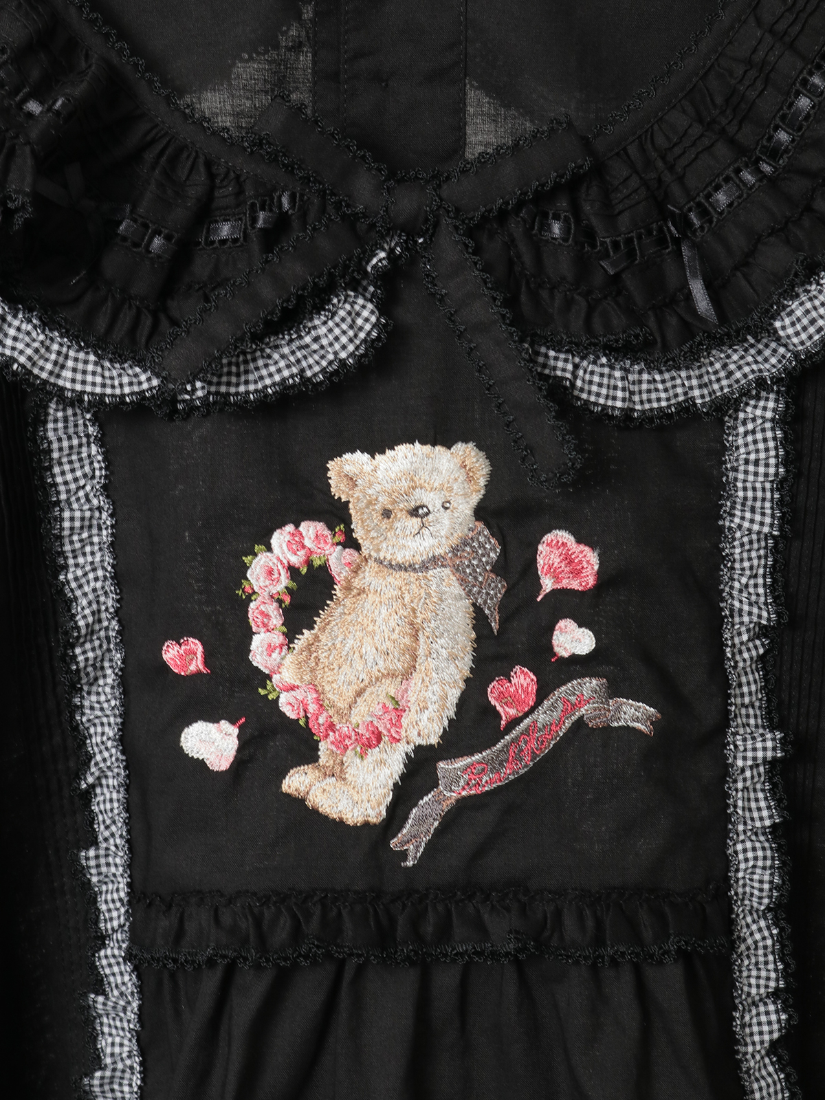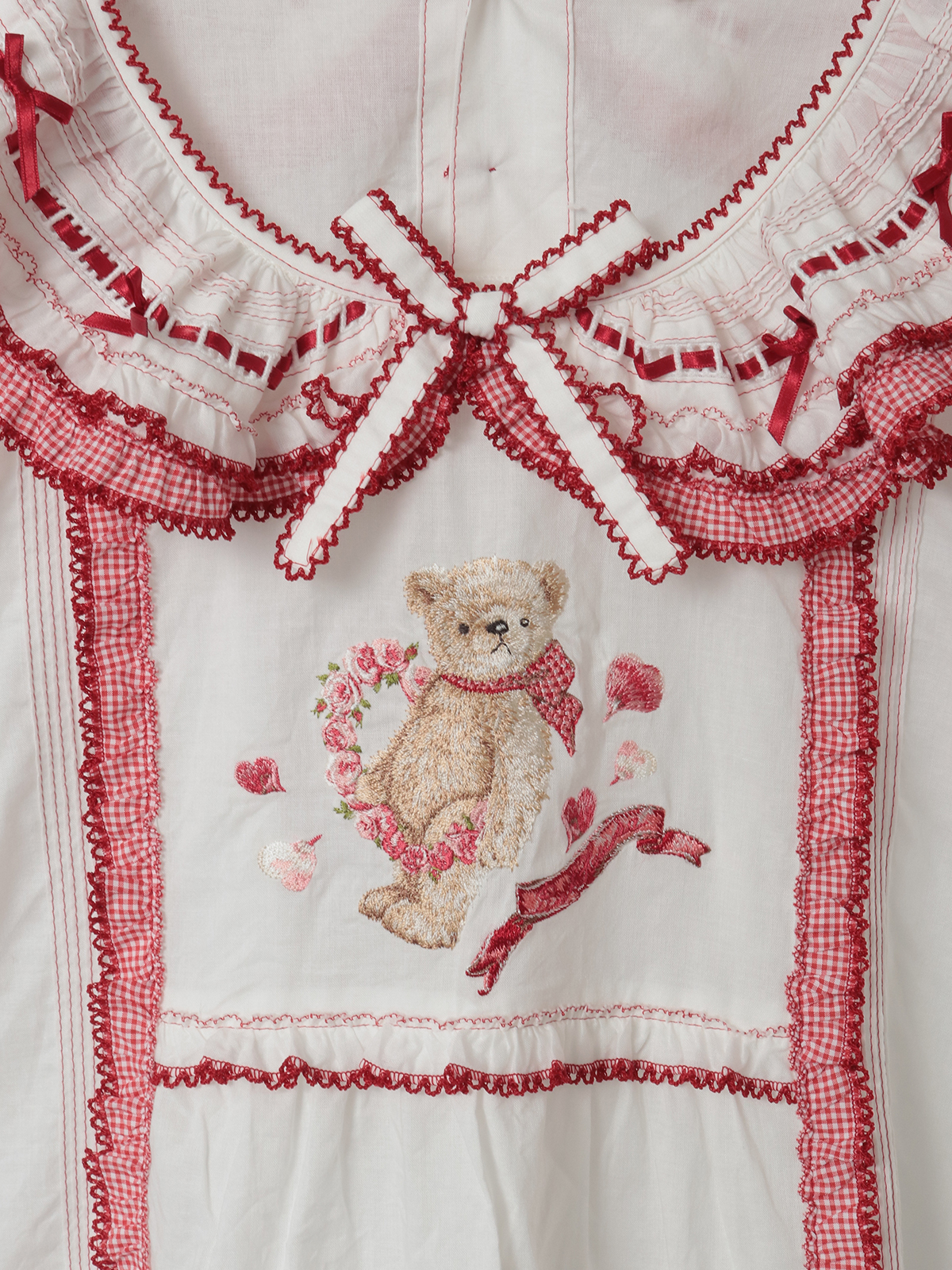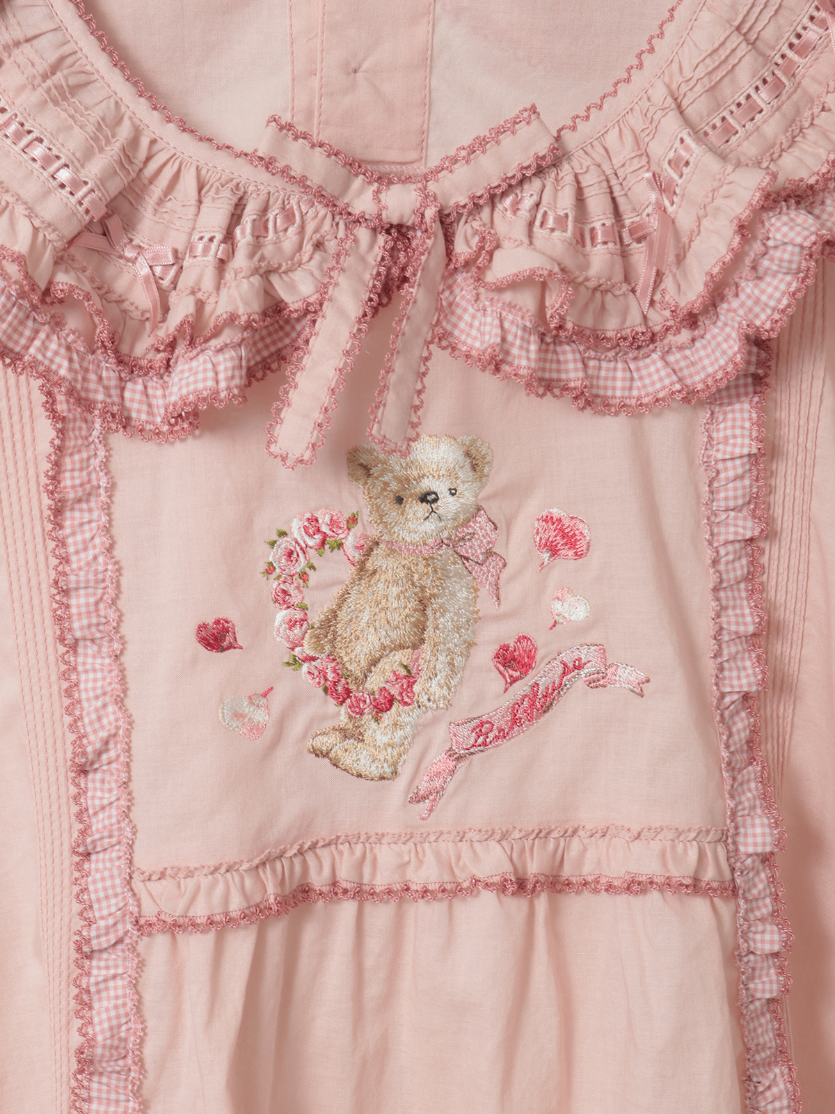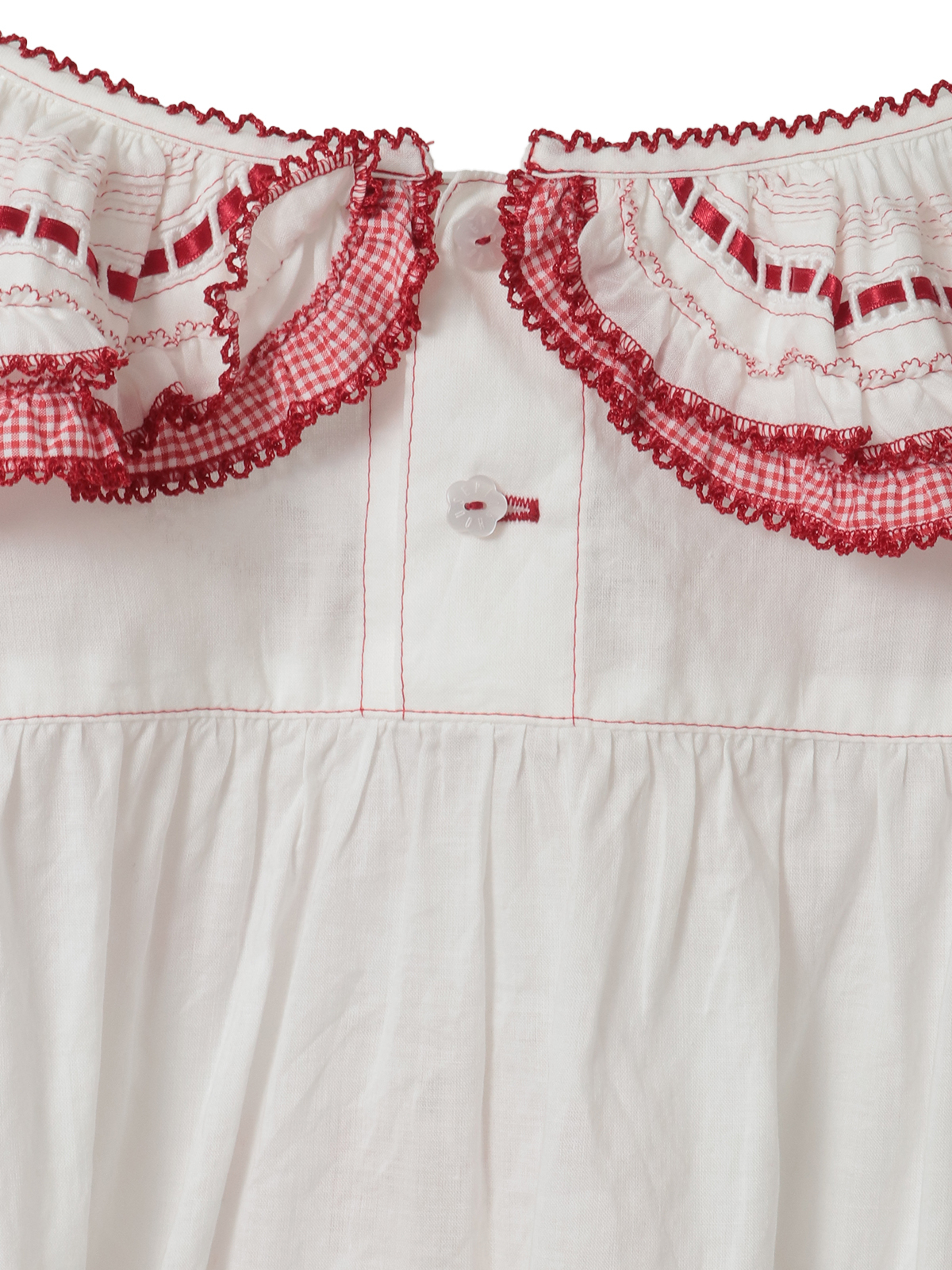 襟のところには、ギンガムチェックのフリルとさらにサテンリボンを通したはしごレースもあしらって。レースのうえにはところどころにミニリボンのトッピングも添えて可愛らしく。