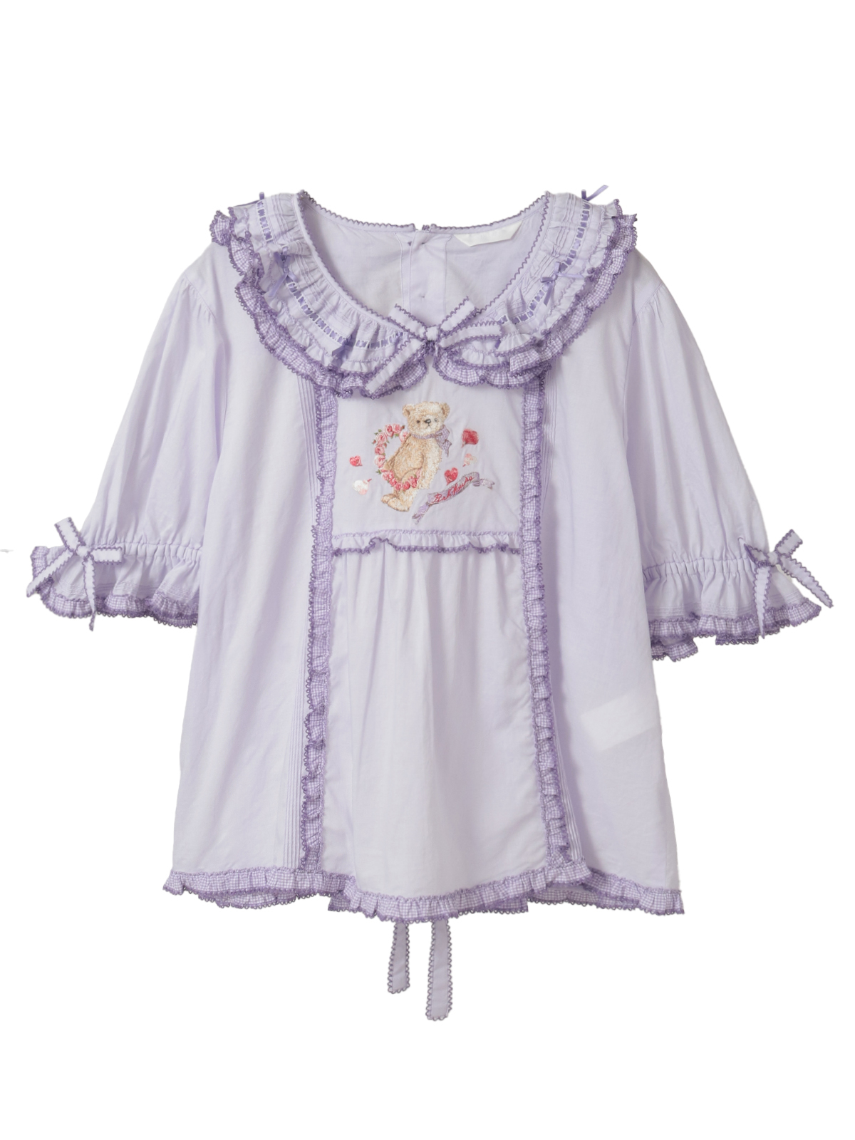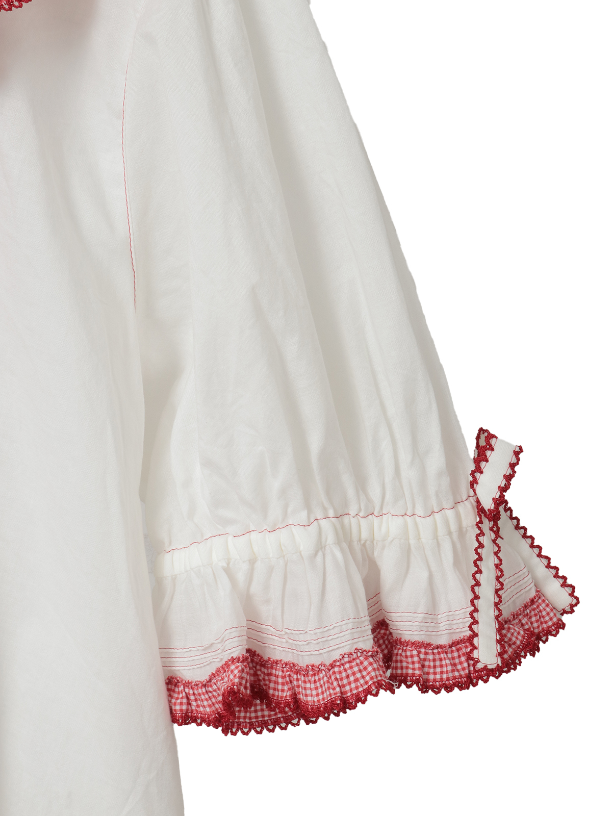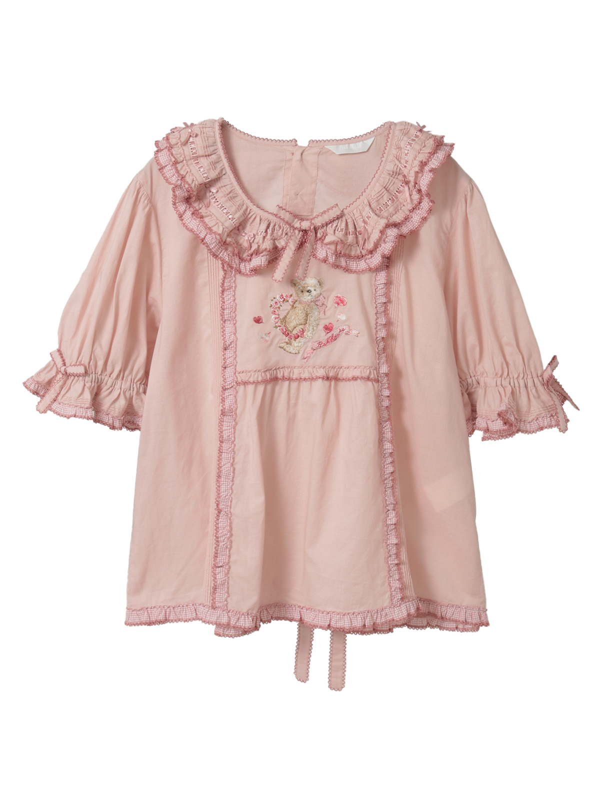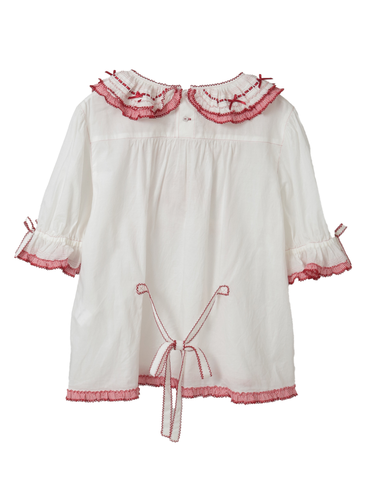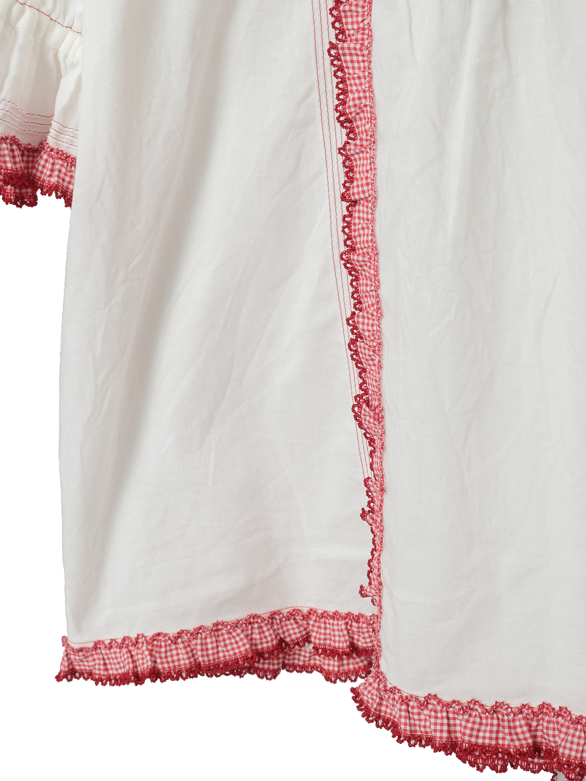 襟のところには、ギンガムチェックのフリルとさらにサテンリボンを通したはしごレースもあしらって。レースのうえにはところどころにミニリボンのトッピングも添えて可愛らしく。