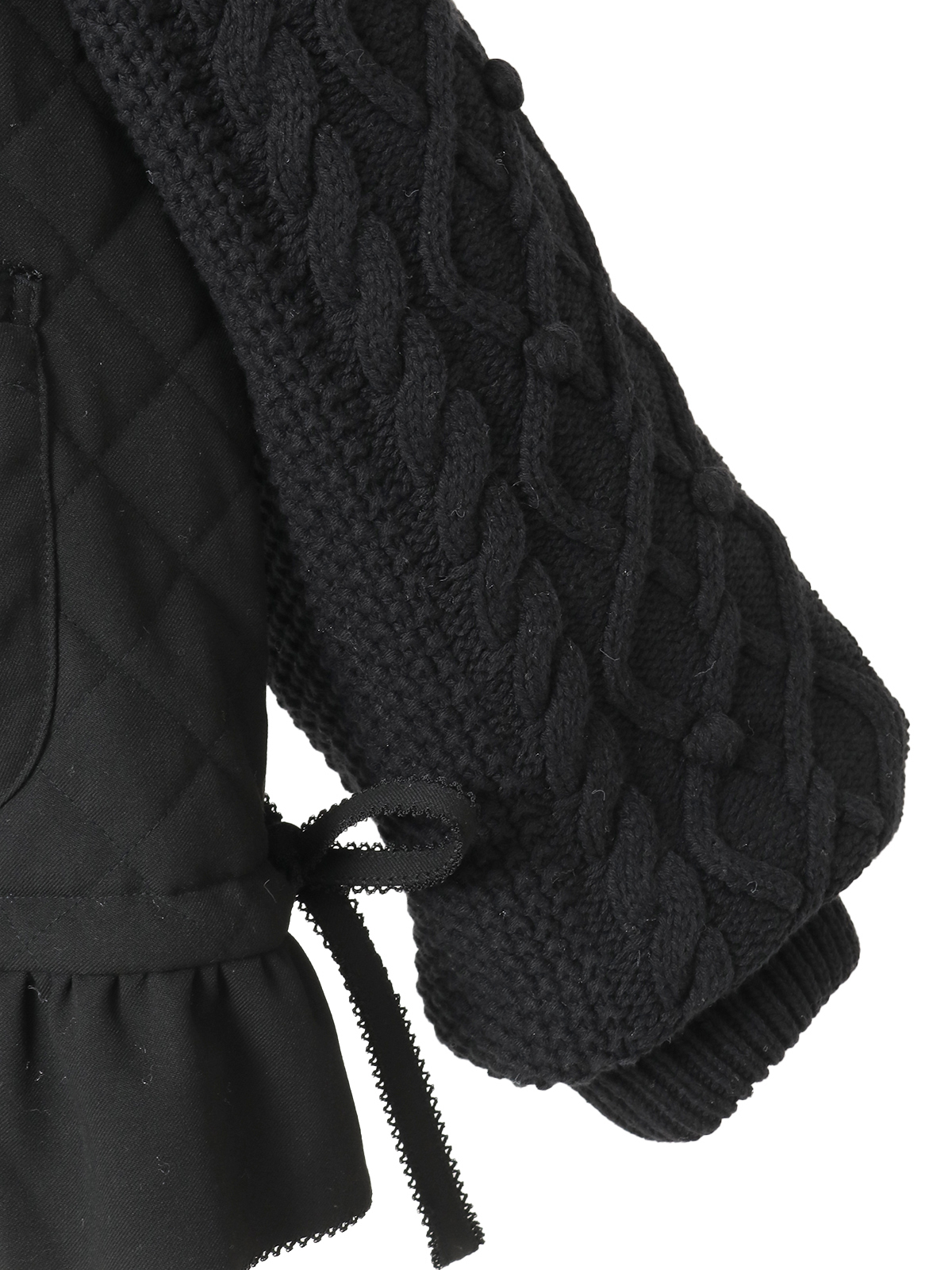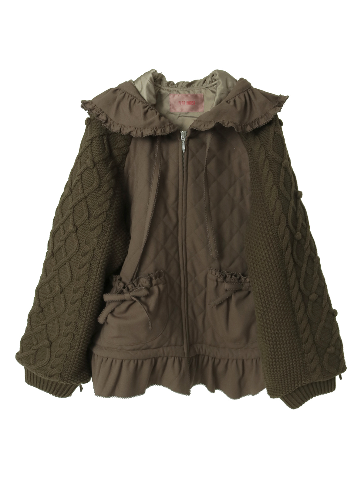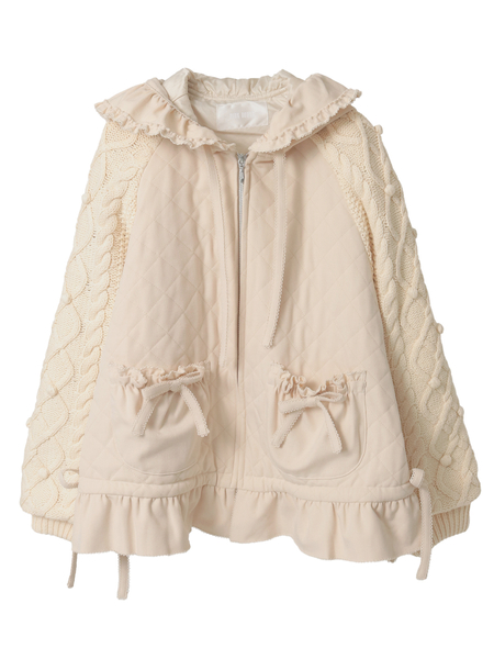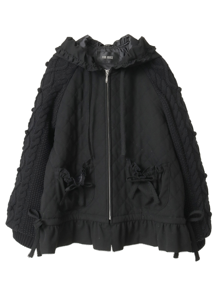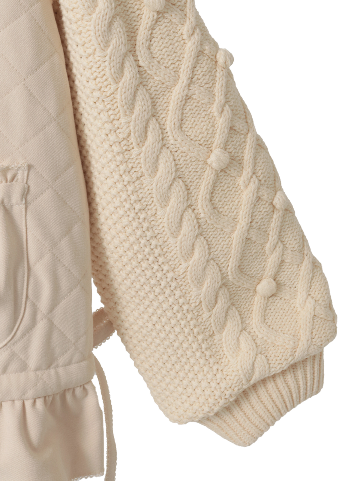 ケーブル編みにポップルをところどころに付けたニット袖の付いたキルティングブルゾン。