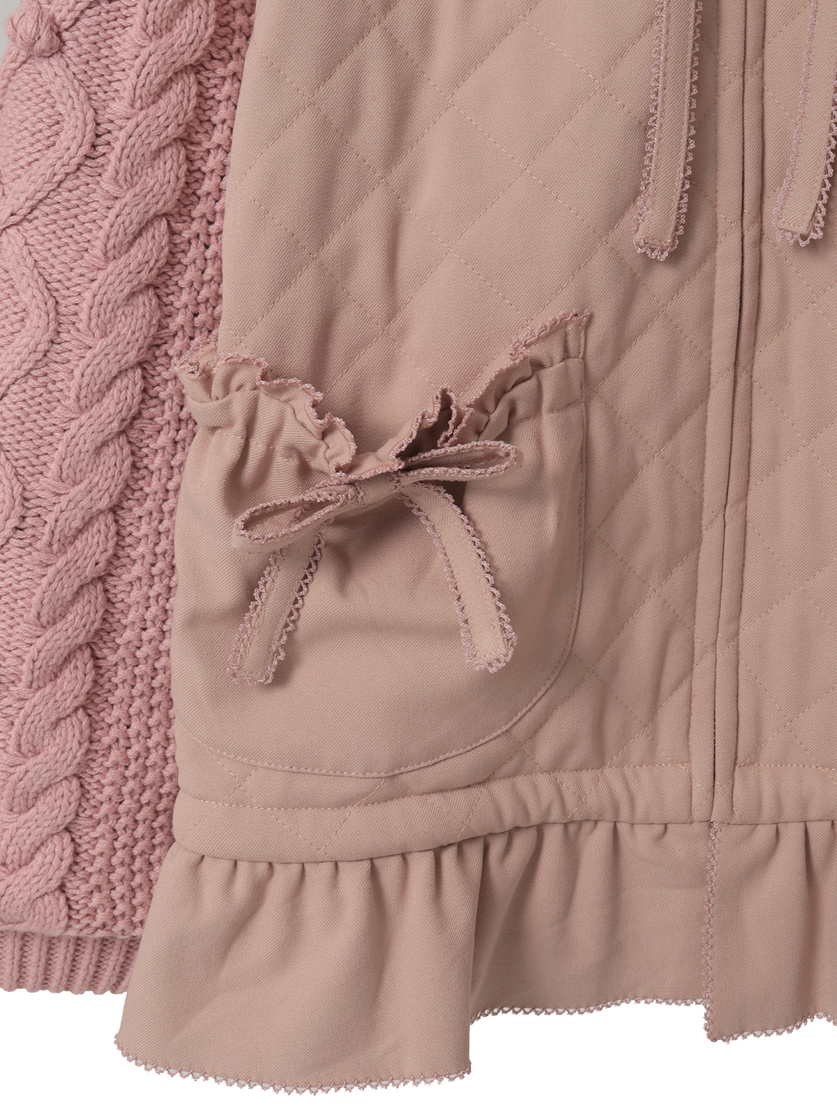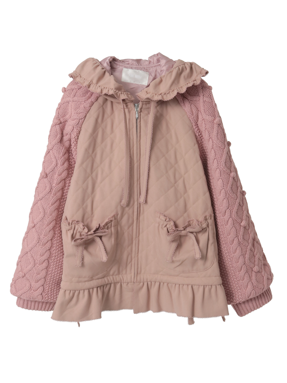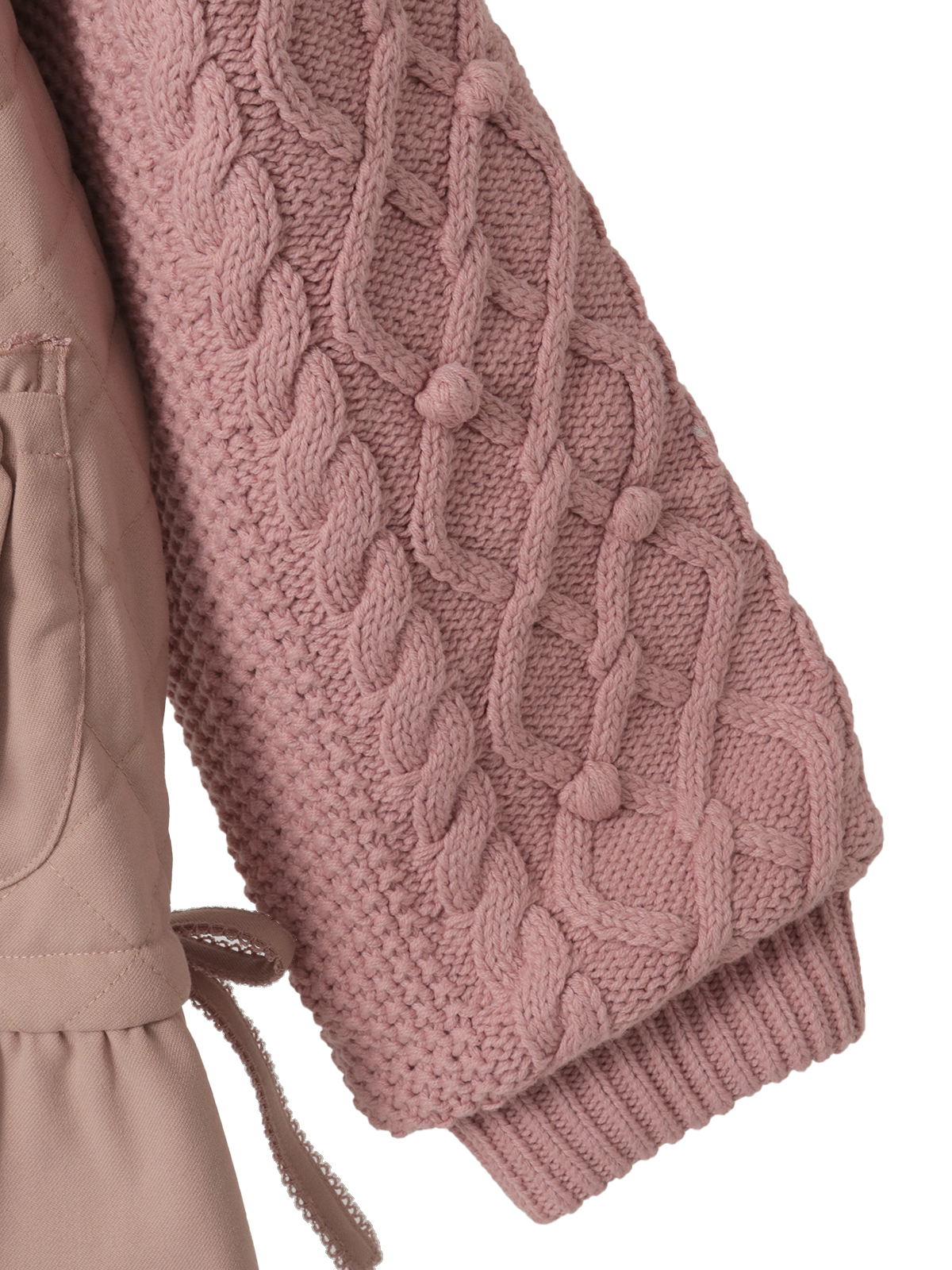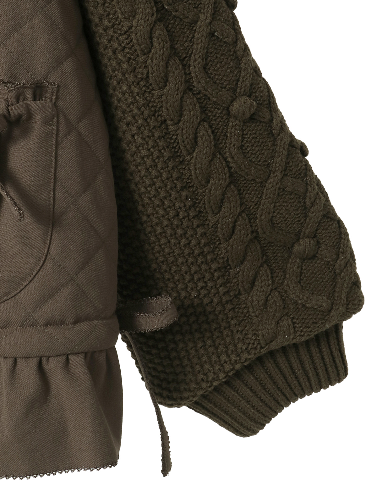 ケーブル編みにポップルをところどころに付けたニット袖の付いたキルティングブルゾン。