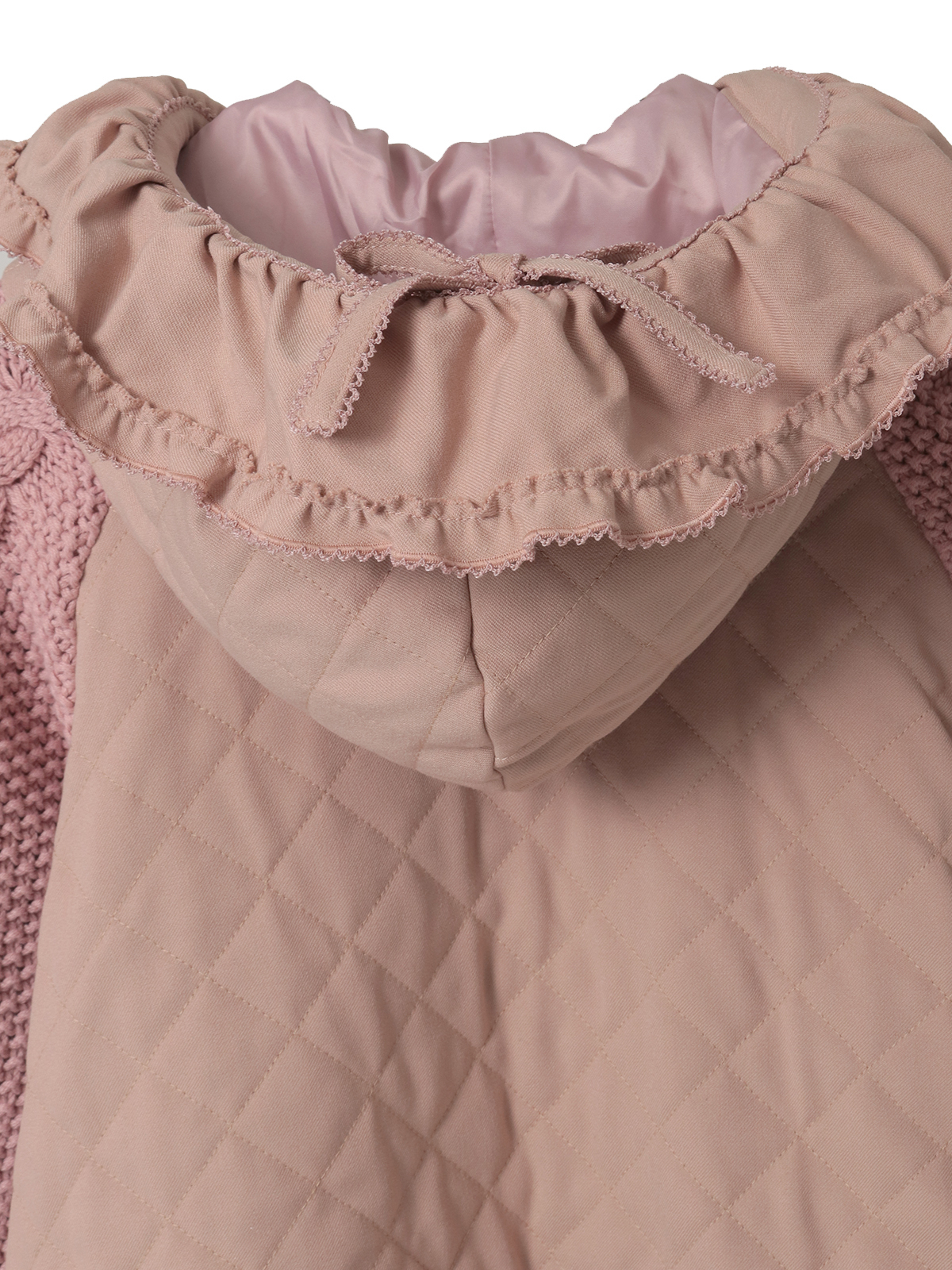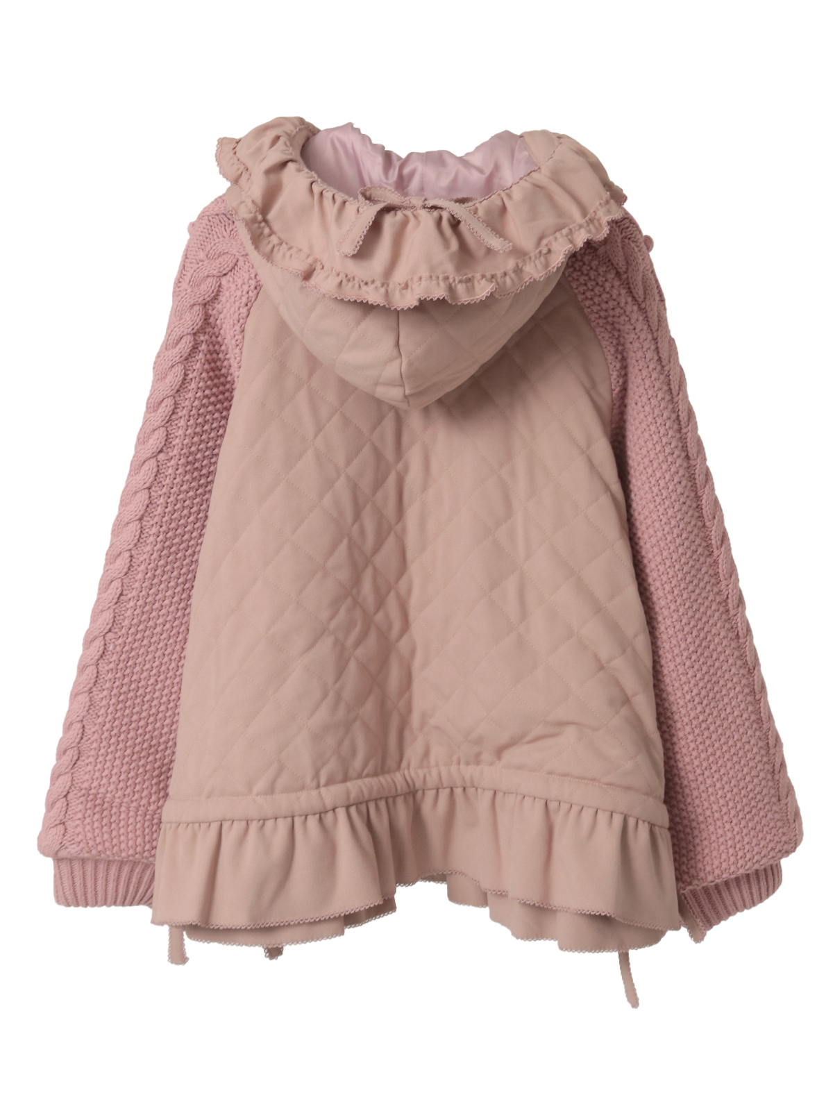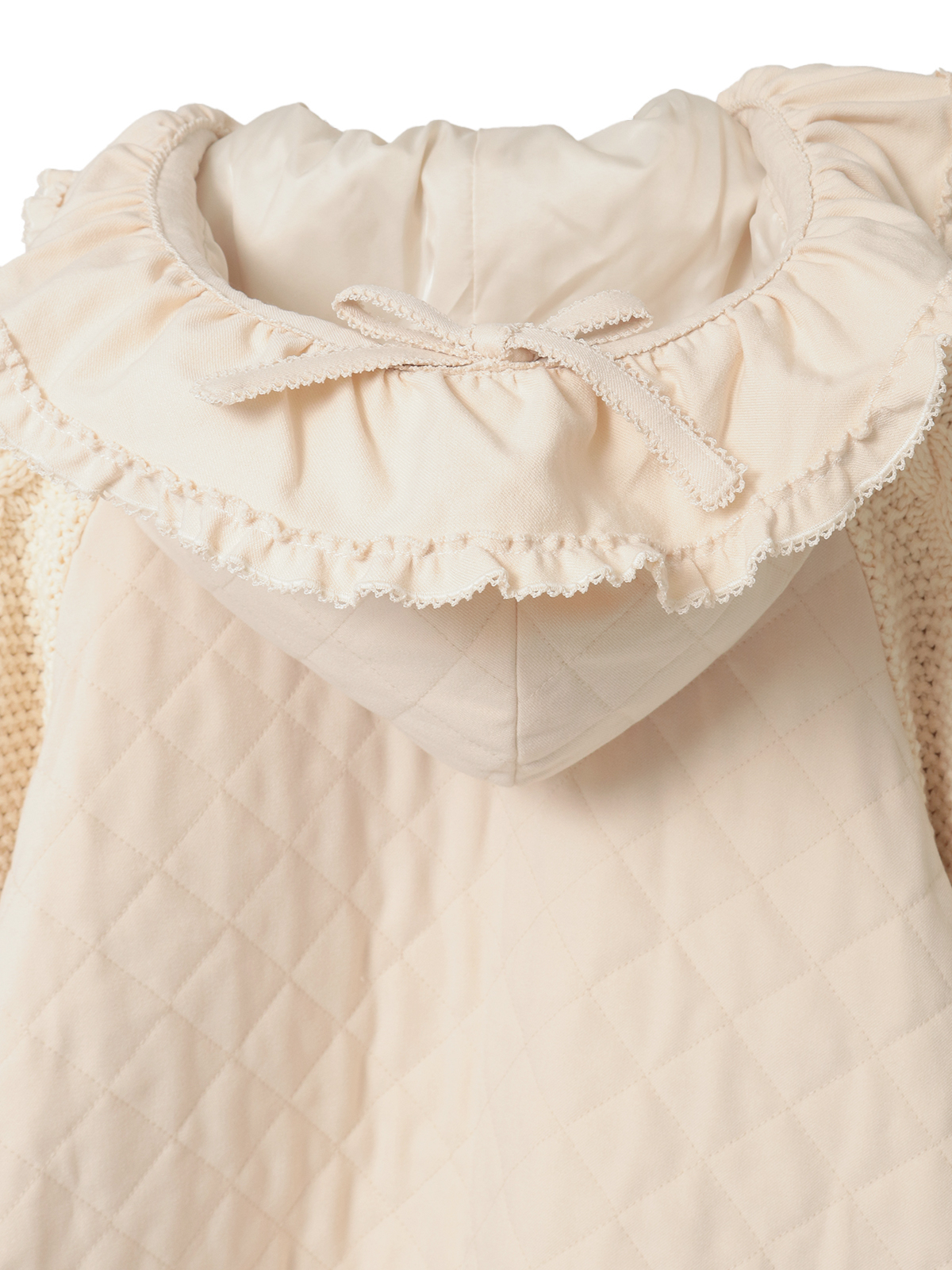 ケーブル編みにポップルをところどころに付けたニット袖の付いたキルティングブルゾン。