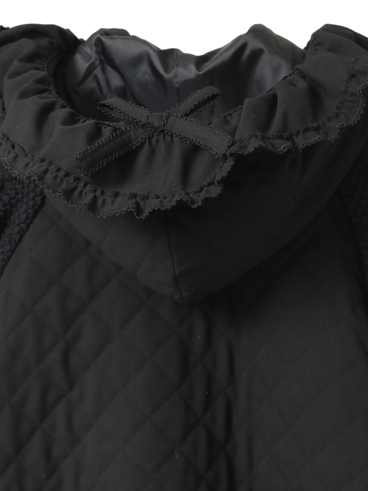 フリルの縁取りを施したフードや、左右にリボンモチーフの付いた外ポケットが付いていたり、両サイドにはストリングスで表情を付けてナチュラルな可愛らしさを演出しています。