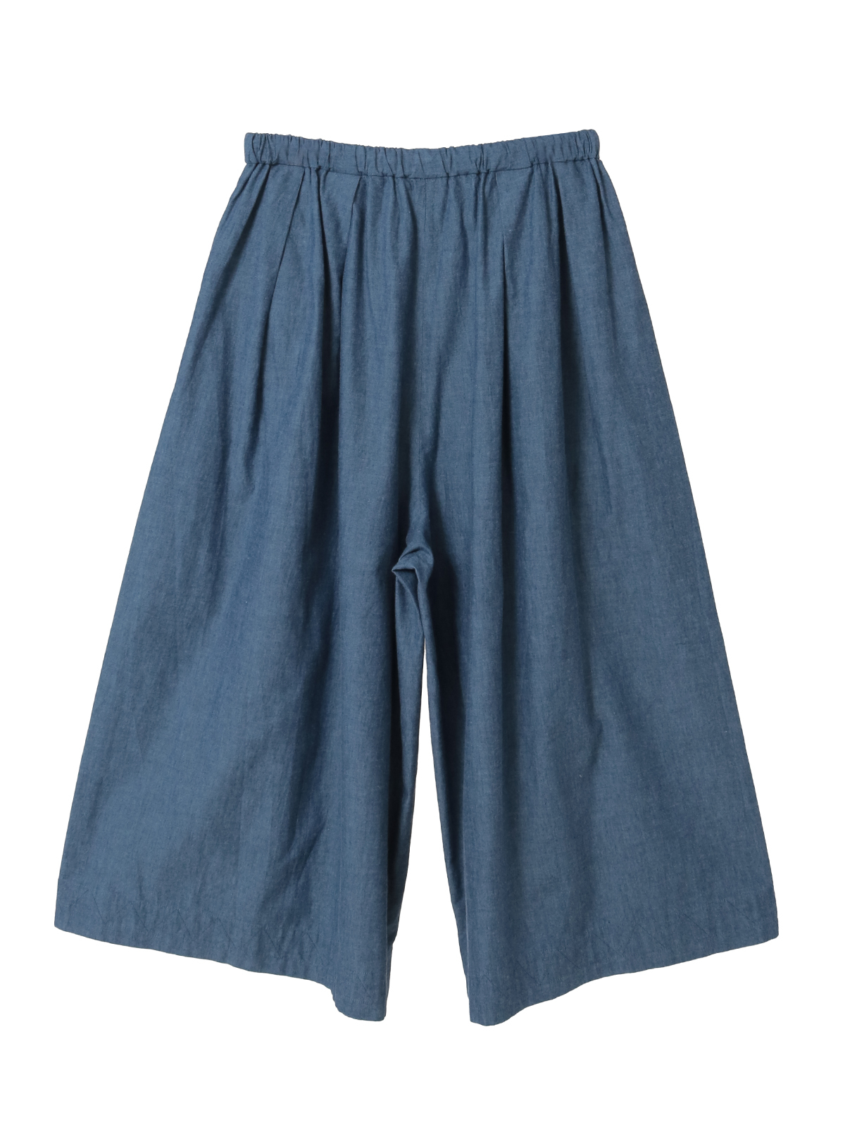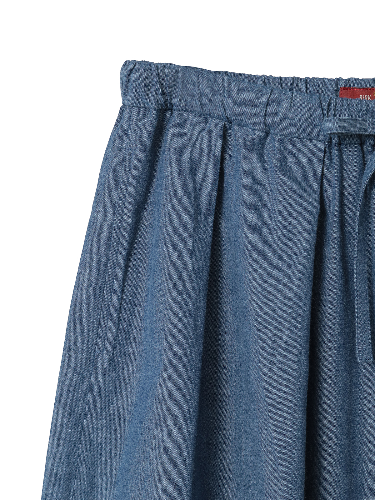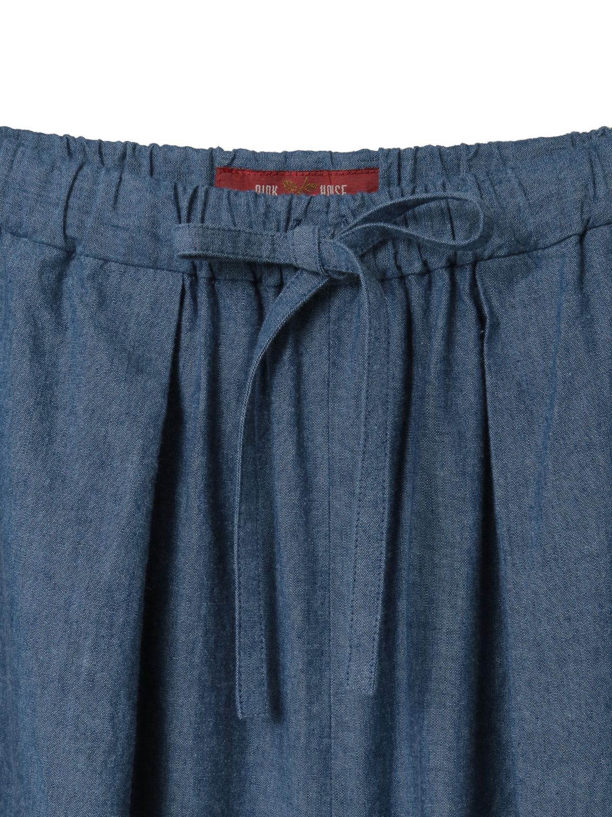 裾にかけてふんわりと広がるワイドシルエット。ウエストの内側に軽くゴムの入ったリボン紐をフロントで結んでラクチンで軽やかな履き心地。