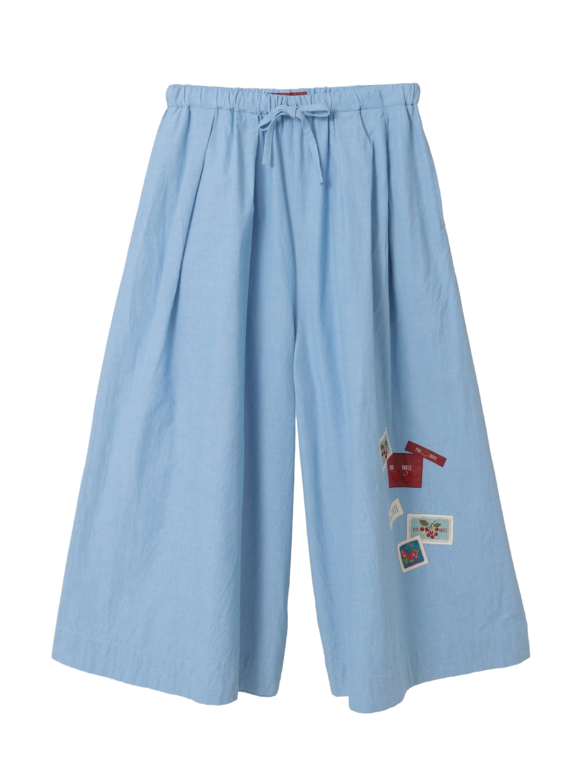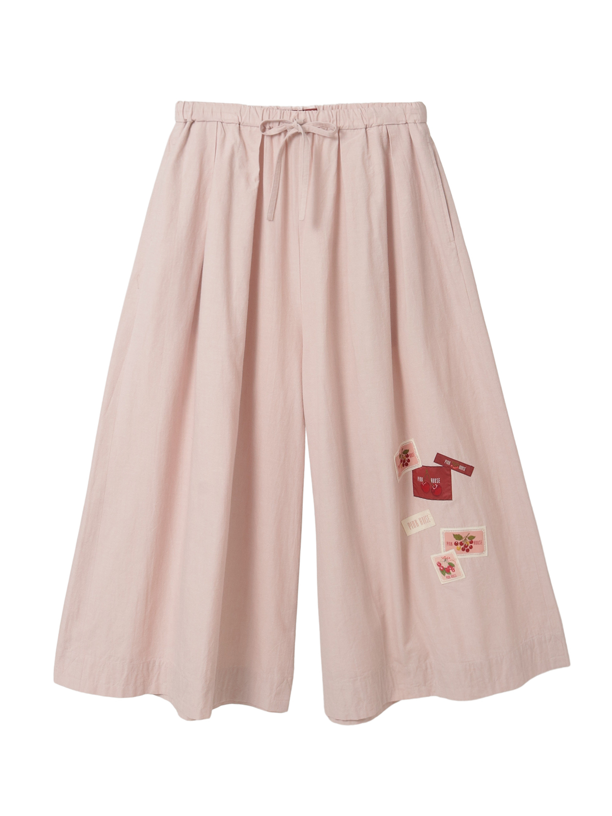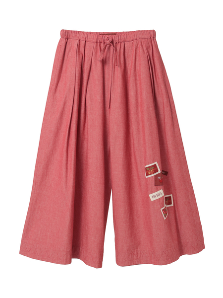 裾にかけてふんわりと広がるワイドシルエット。ウエストの内側に軽くゴムの入ったリボン紐をフロントで結んでラクチンで軽やかな履き心地。