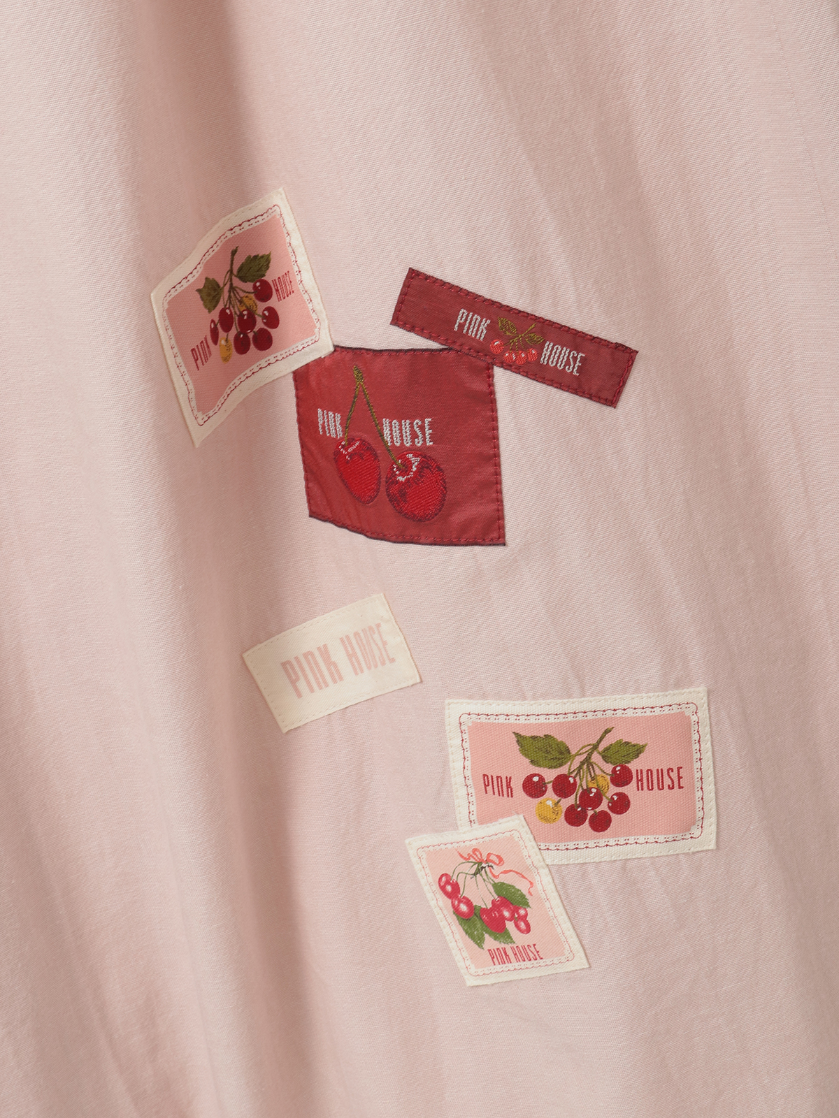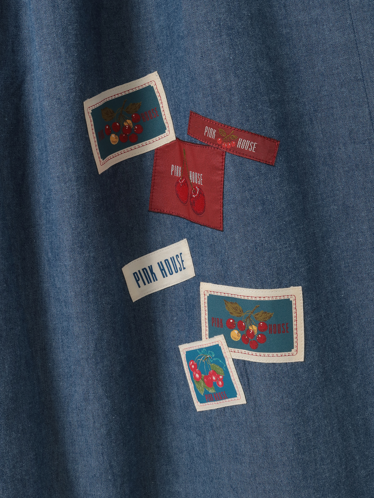 チェリーネームとロゴネームをいくつも重ね合わせて左サイドにあしらったダンガリーワイドパンツ。