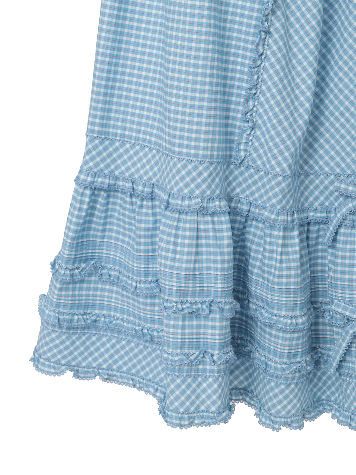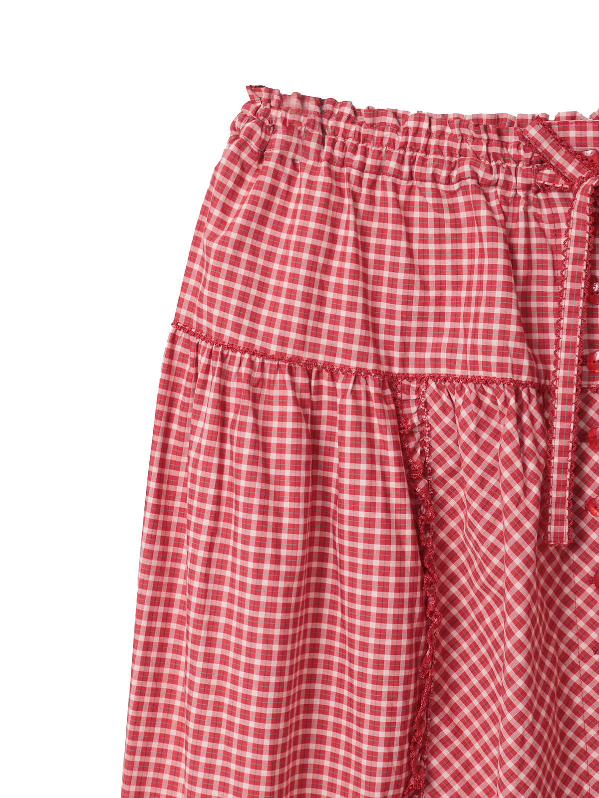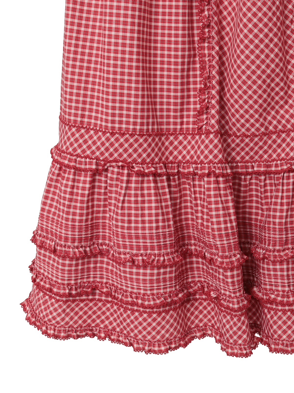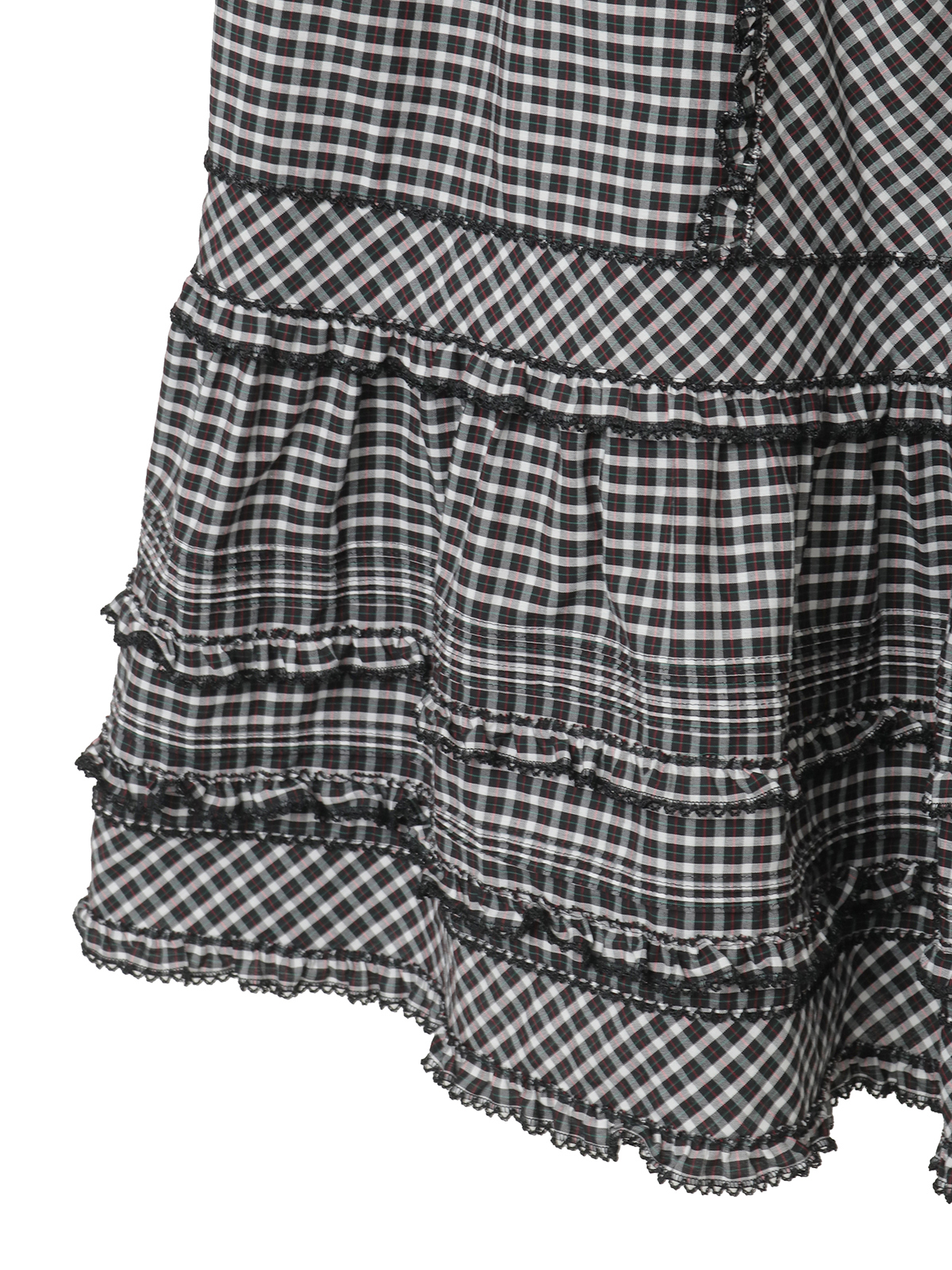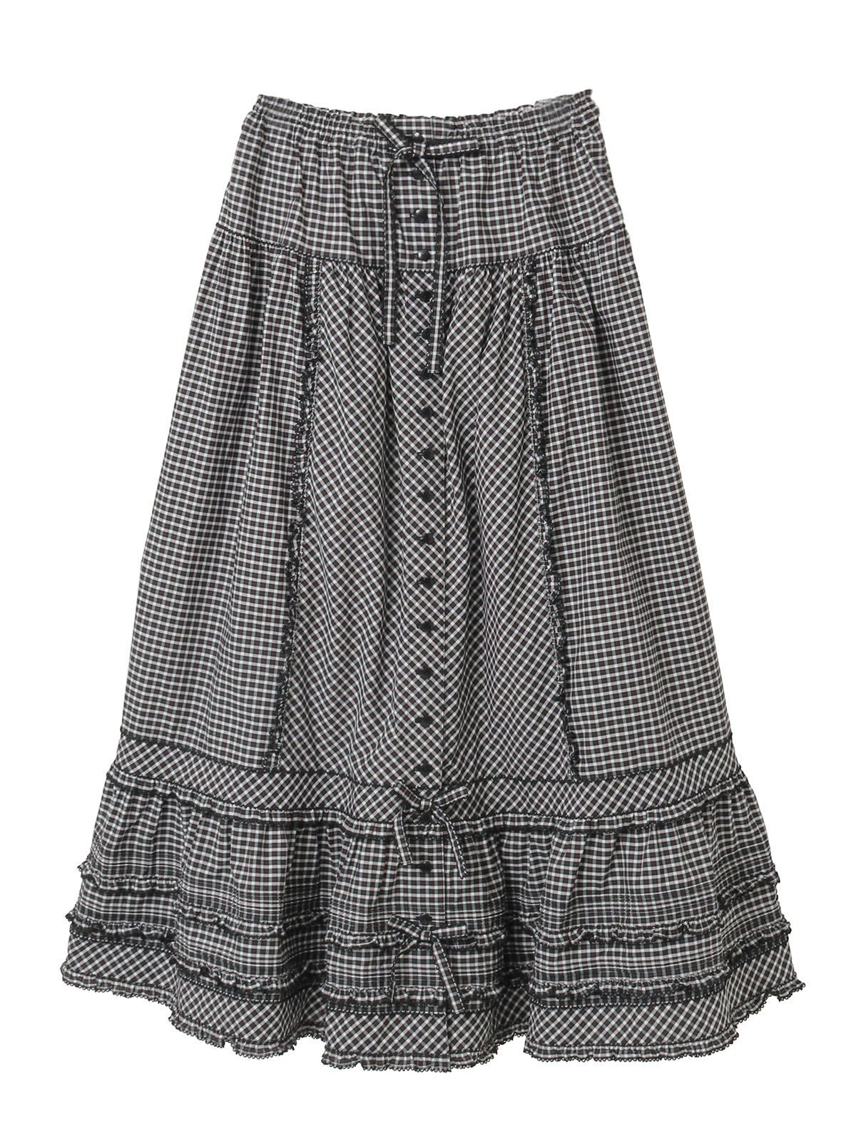 切り替えの入ったティアードタイプのスカートは、バイアス切り替えのデザインでパッチワーク風な仕上がりに。