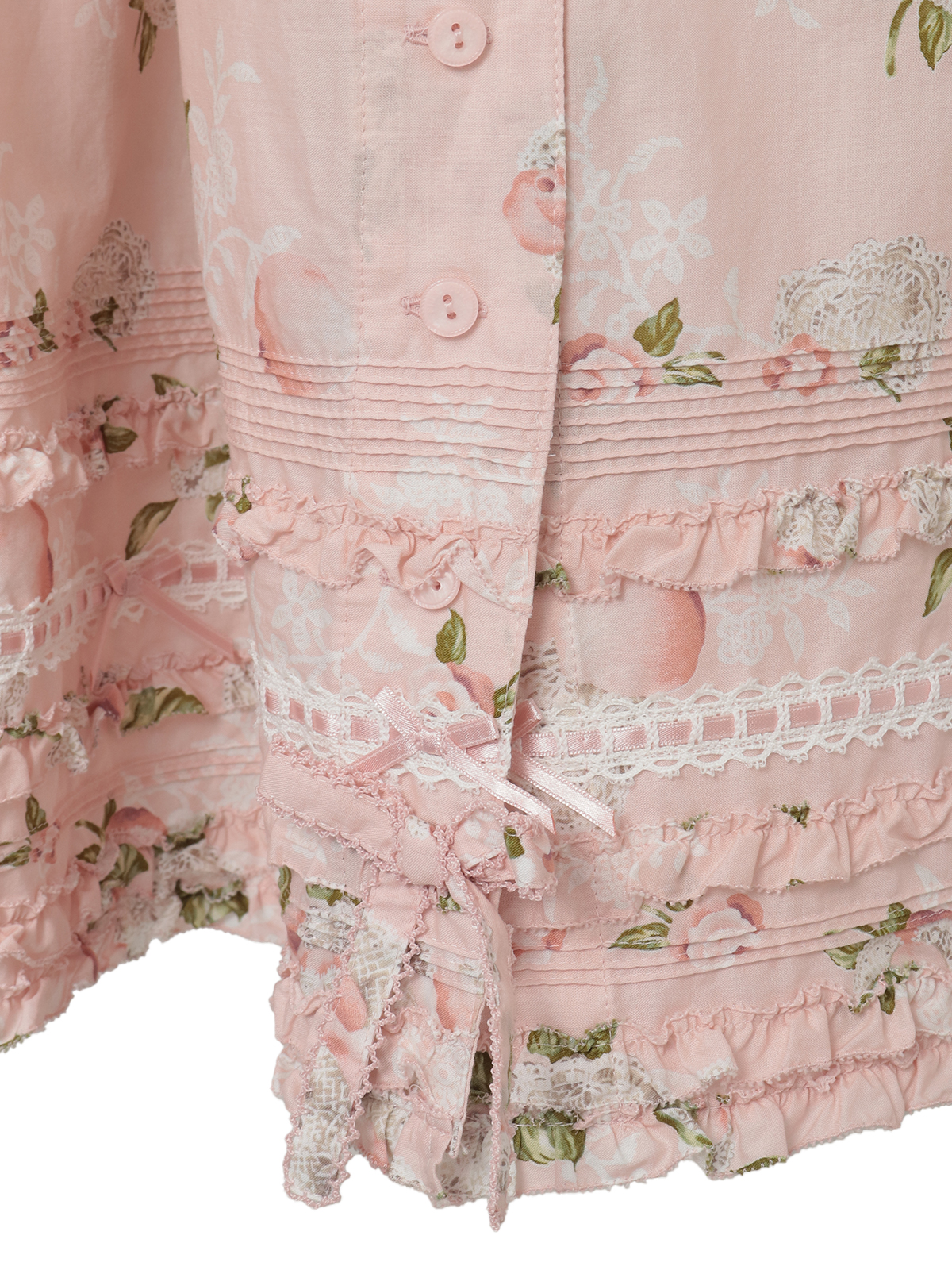 裾まわりにあしらったハシゴレースとなかに通したサテンリボンの装飾がアクセントに。レースのまわりにはちいさな儚げなミニリボンを添えて可愛らしく。