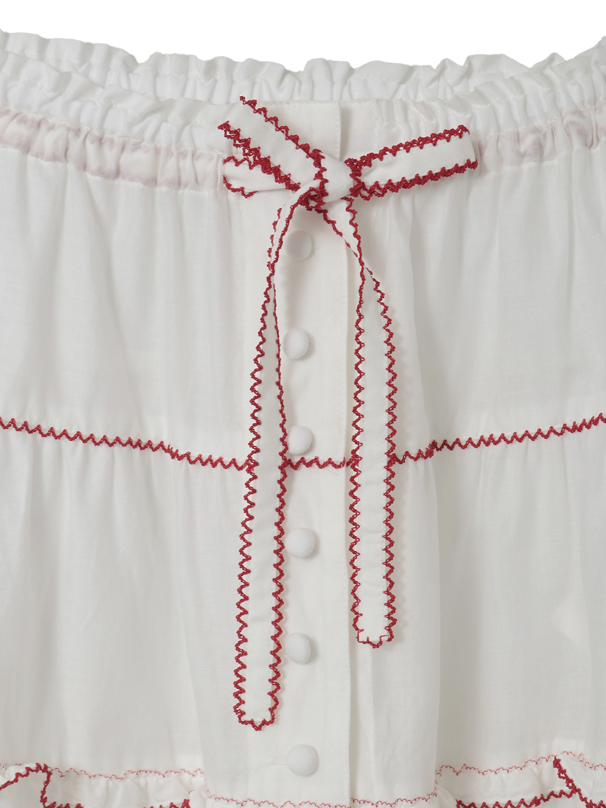 切り替えのところや裾まわりにあしらったフリルの先になどに、ピコット刺繍をあしらって。刺繍の糸は、クロにはシロ、シロにはアカを配色使いにしてきかせてアクセントに。