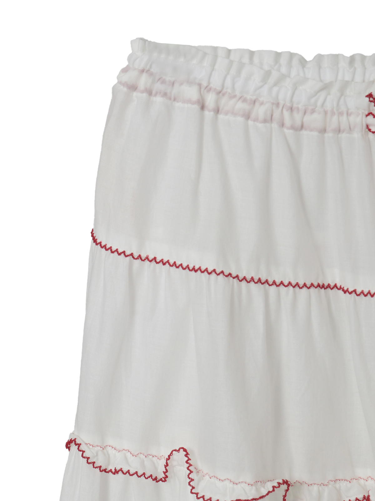 綿ローンのティアードロングスカートの裾まわりにぐるり、ちいさなミニサテンリボンと交互にあしらって可愛らしいポイント使いに。