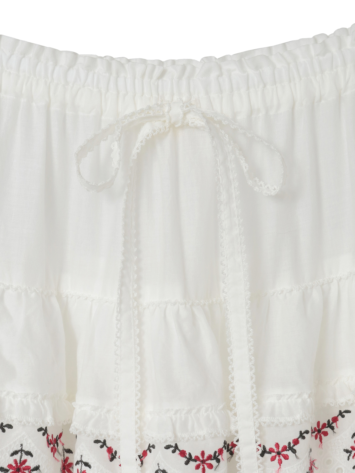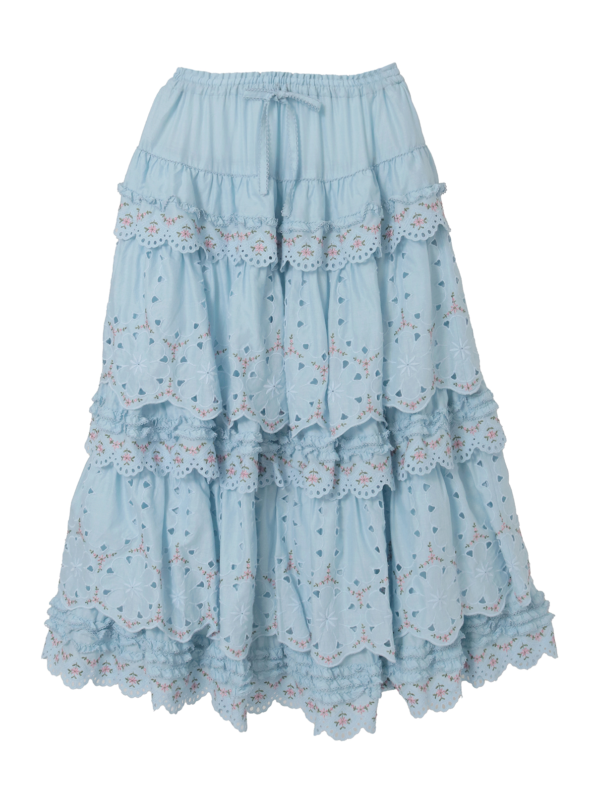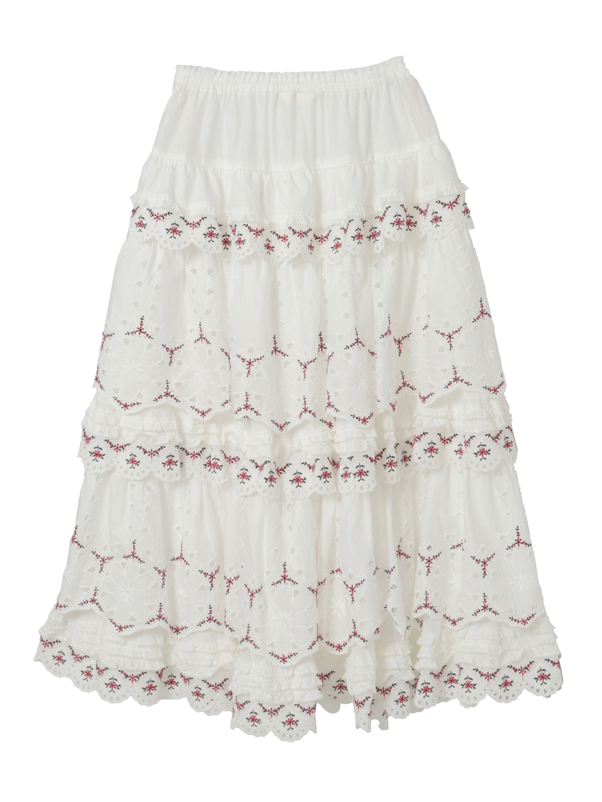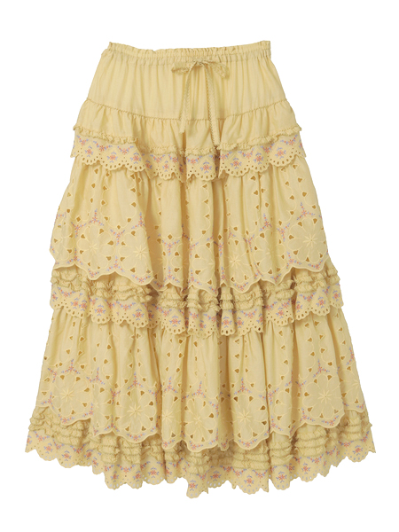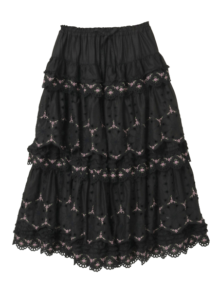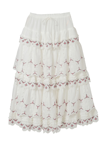 綿ローンに大輪のアイレットフラワーと繊細なエンブフラワーを組み合わせたオリジナルのコットンレースをティアード使いにしたロング丈のスカート。