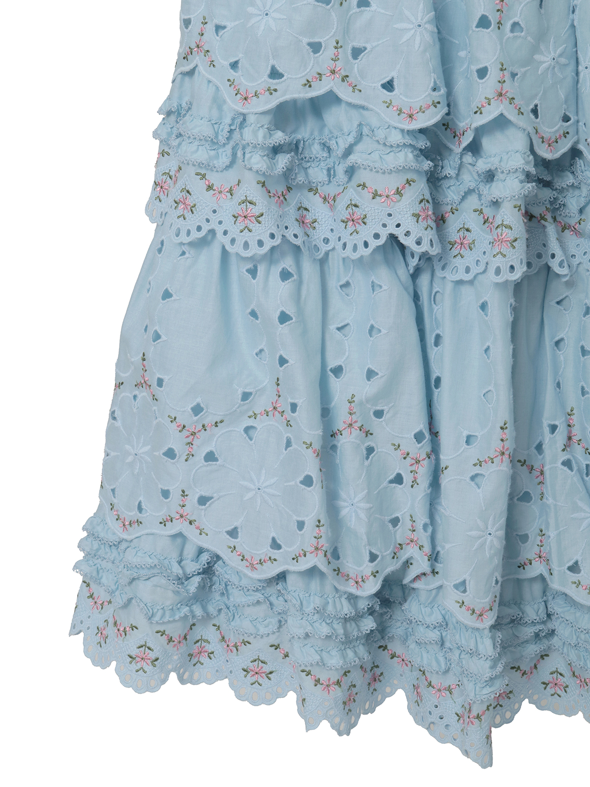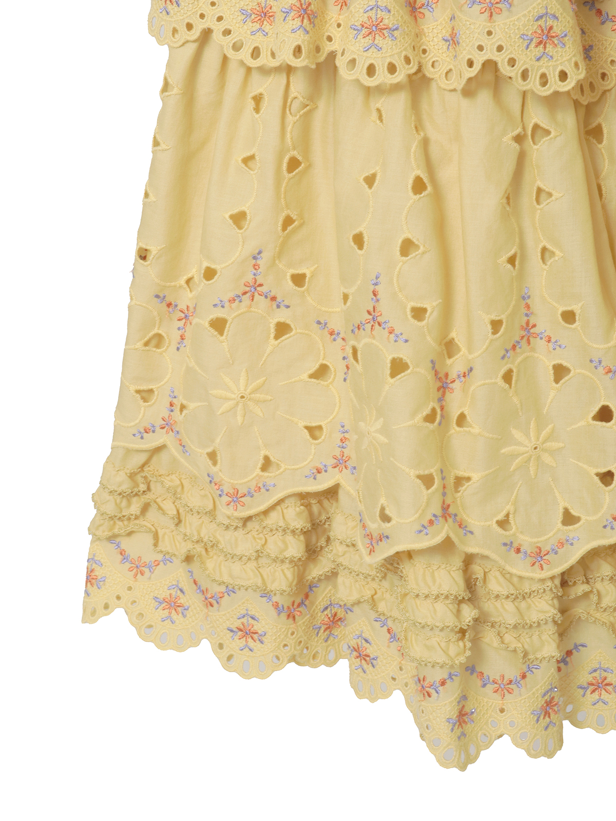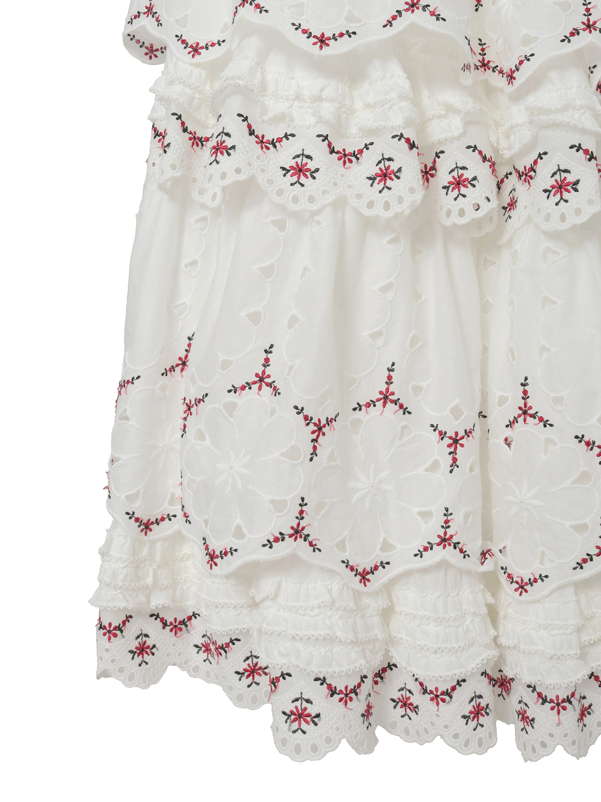綿ローンに大輪のアイレットフラワーと繊細なエンブフラワーを組み合わせたオリジナルのコットンレースをティアード使いにしたロング丈のスカート。