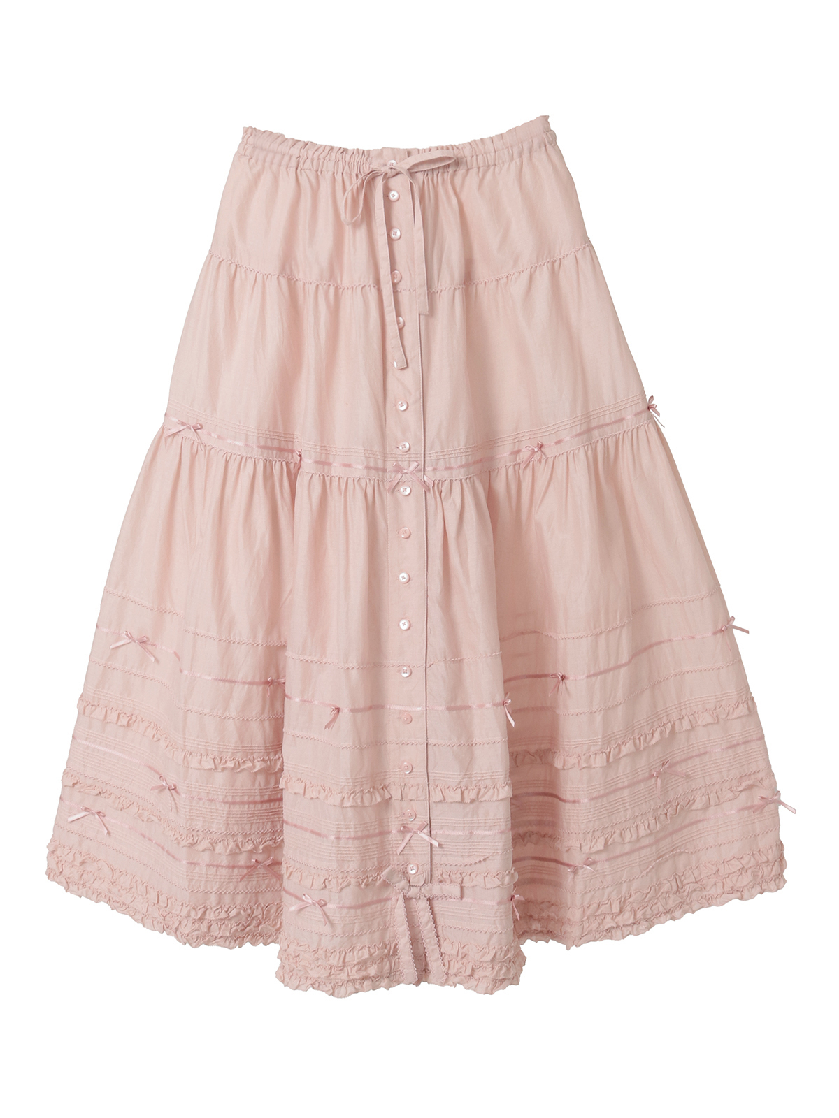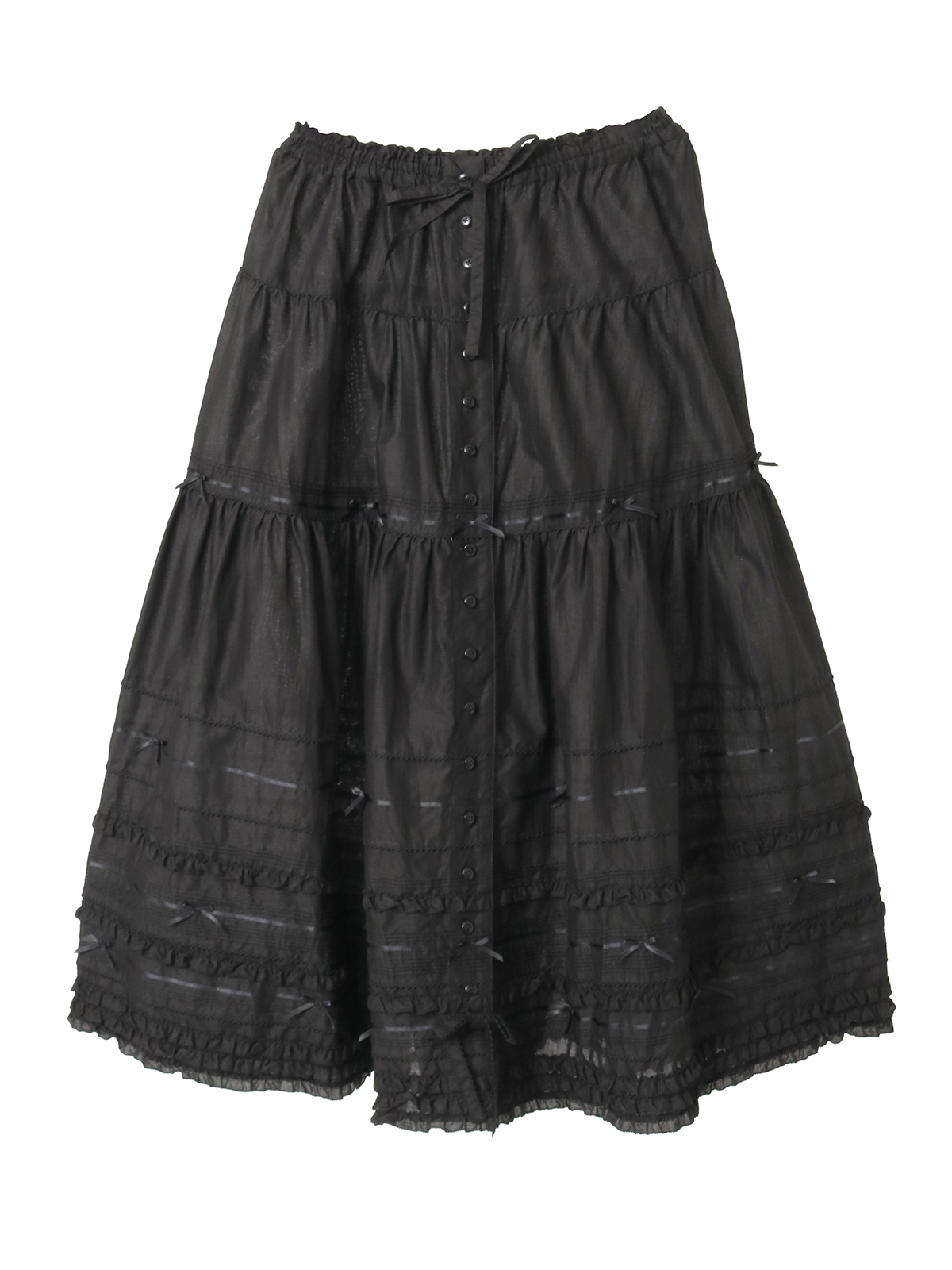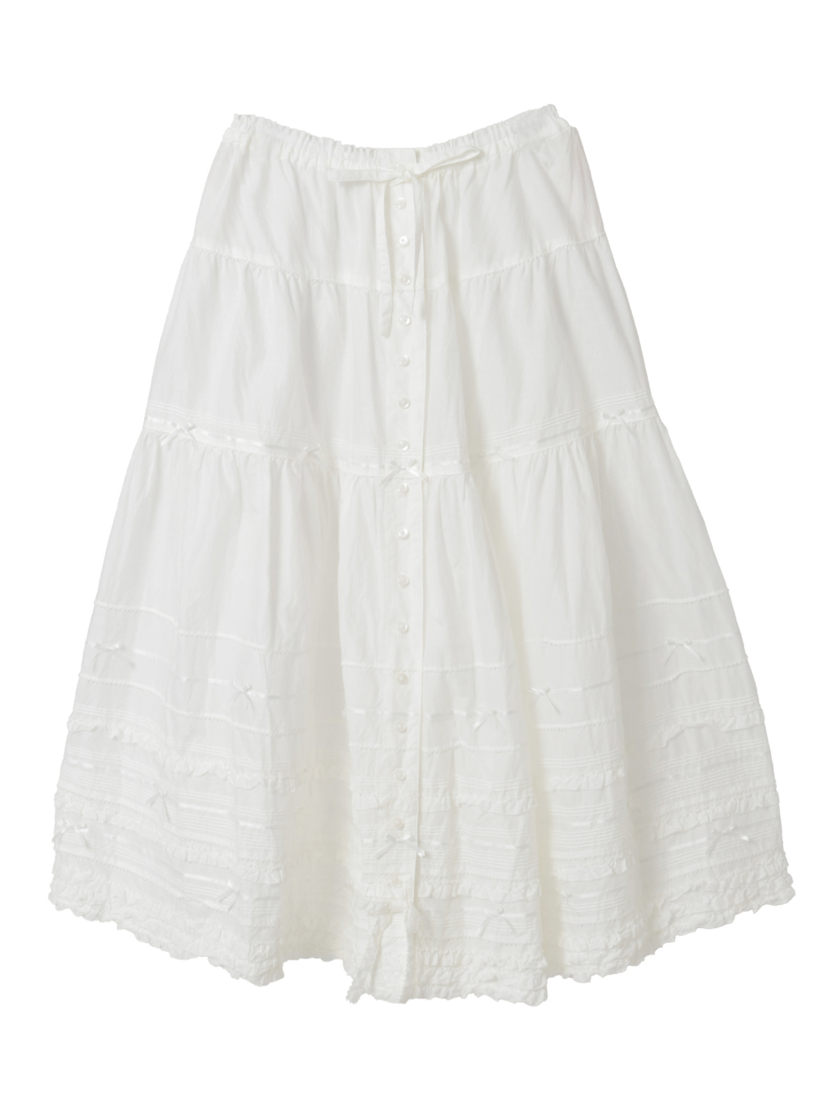 切り替えの入ったふんわりと広がるティアードシルエットのローンスカートは、裾かけてフリルにピンタック、サテンリボンといったキュートなデティールをいっぱい詰め込んでペチコートとして活躍しそうなアイテムに。