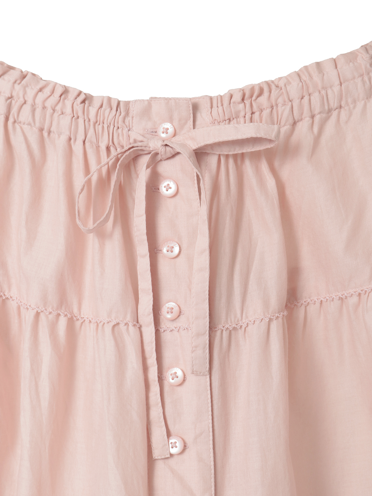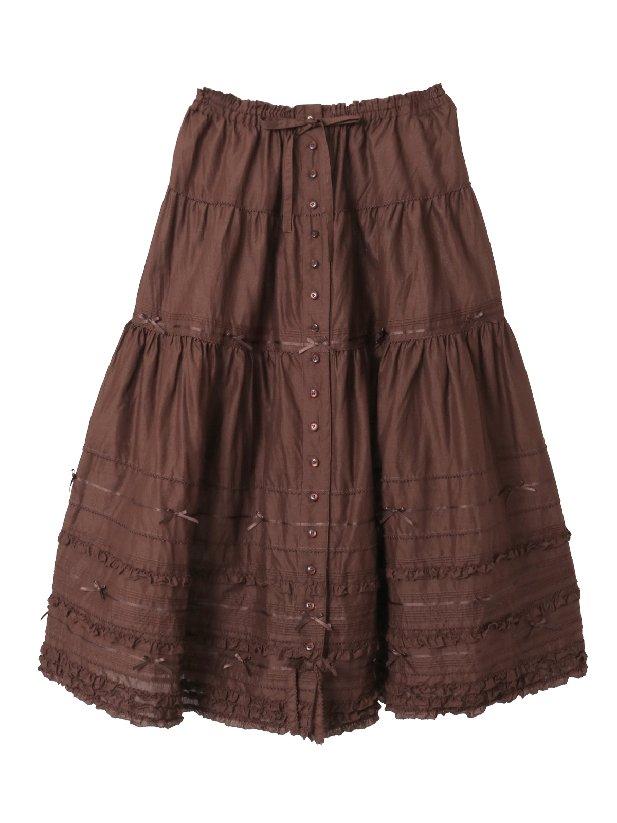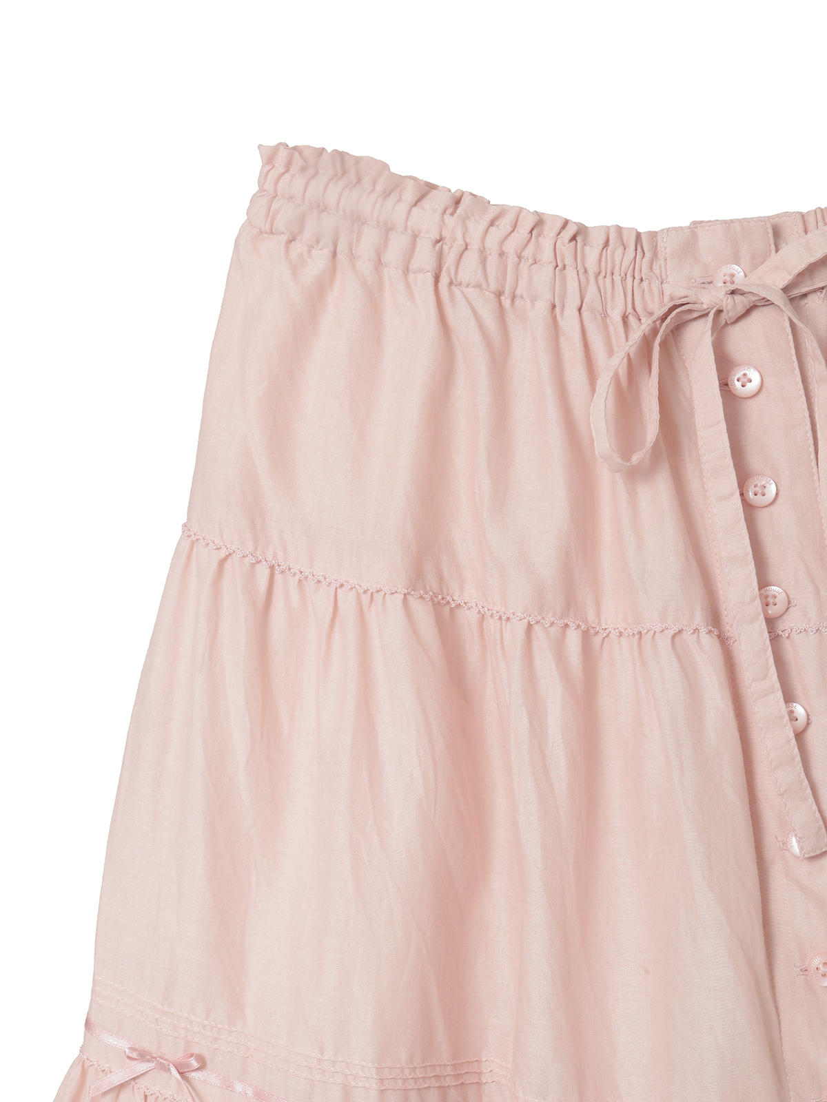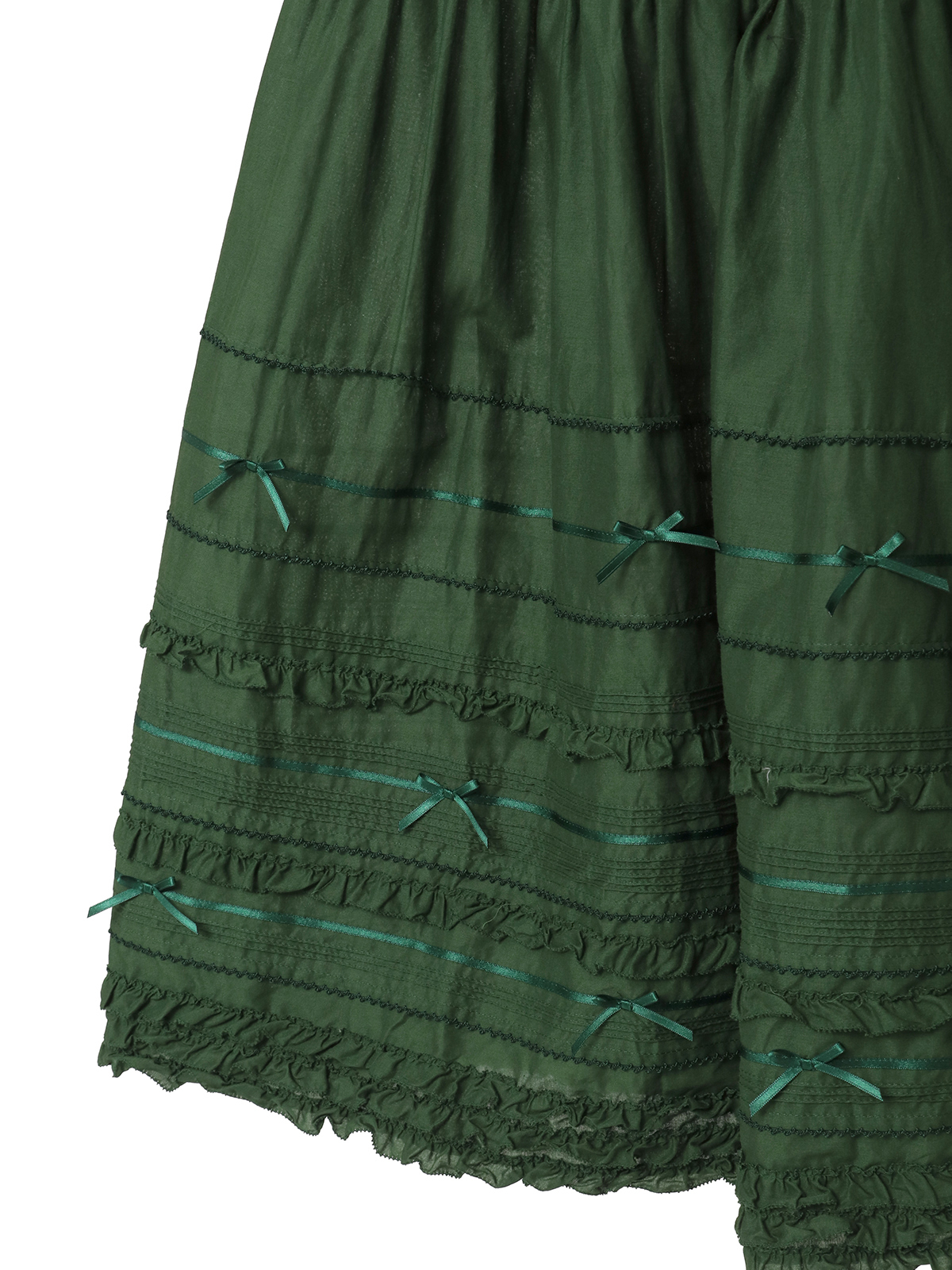 切り替えの入ったふんわりと広がるティアードシルエットのローンスカートは、裾かけてフリルにピンタック、サテンリボンといったキュートなデティールをいっぱい詰め込んでペチコートとして活躍しそうなアイテムに。