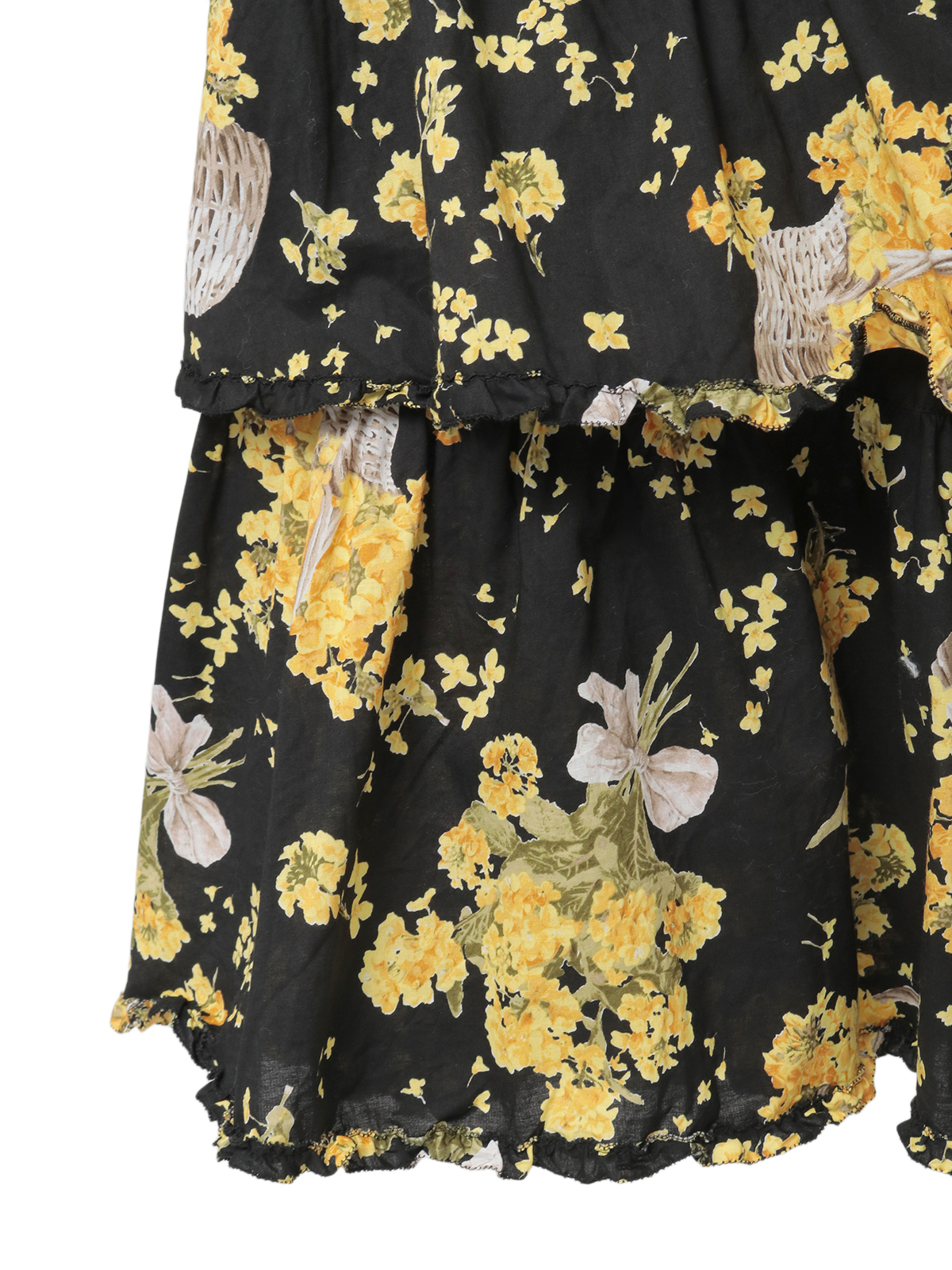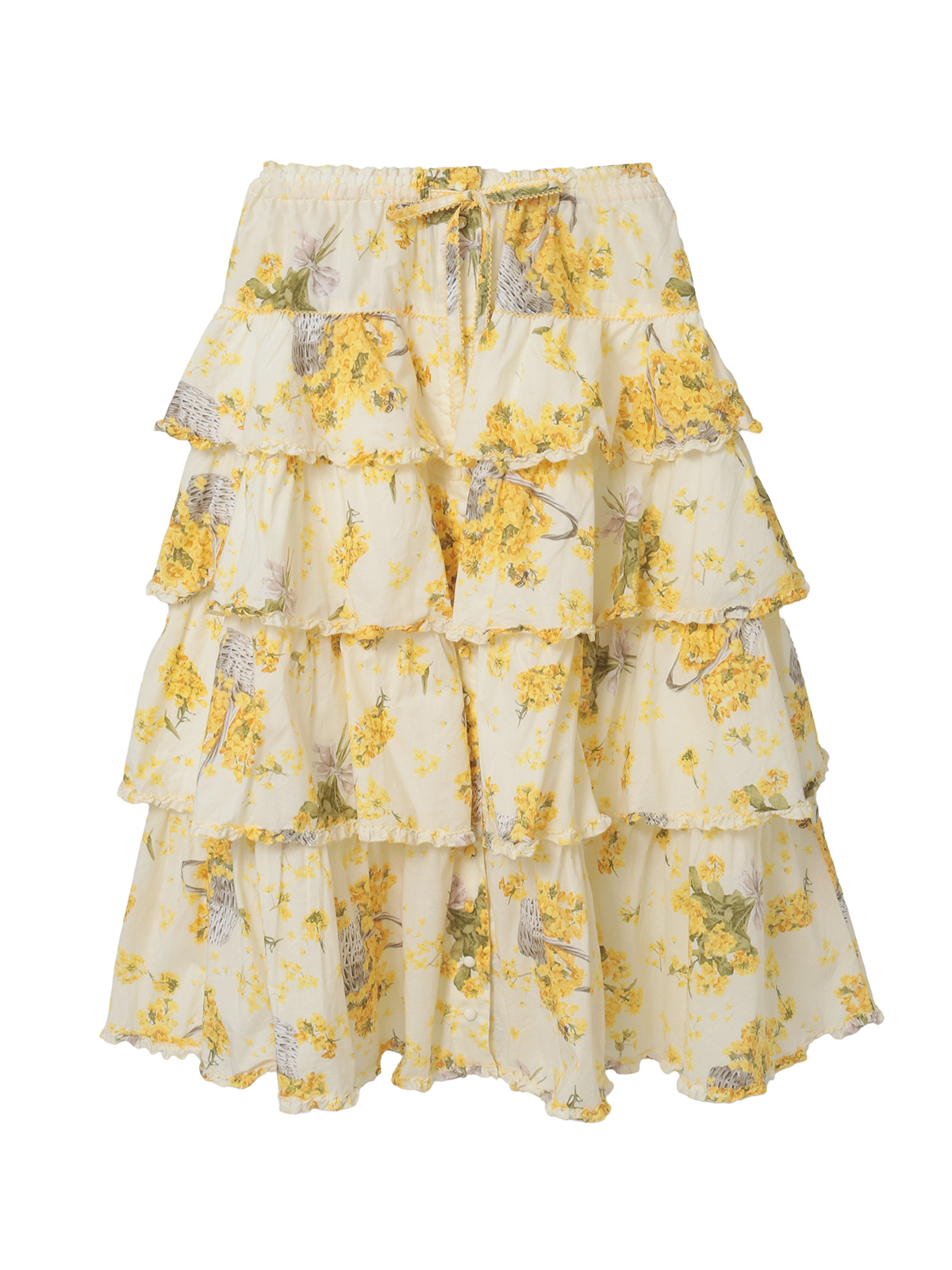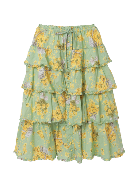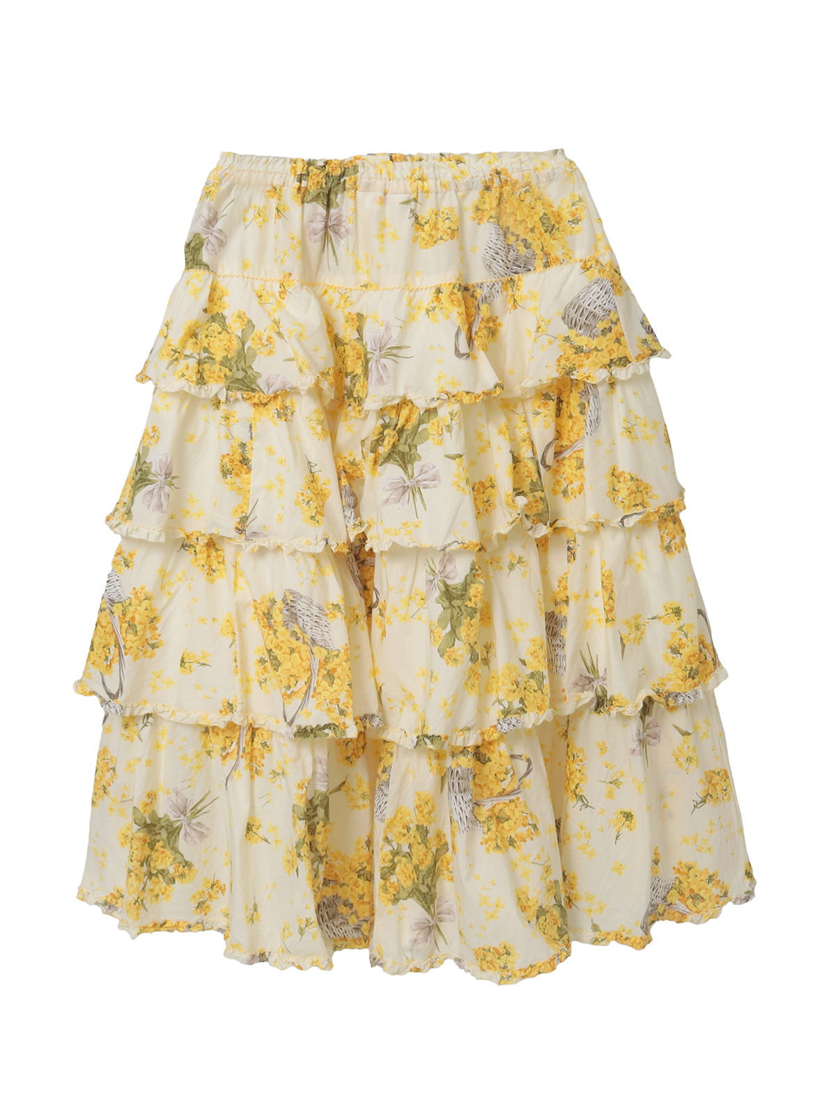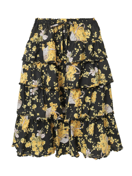 4段の段々フリルを重ね合わせたミディ丈のスカートは、それぞれの段々フリルの先に軽くフリルをあしらった比較的シンプルなデティール使い。