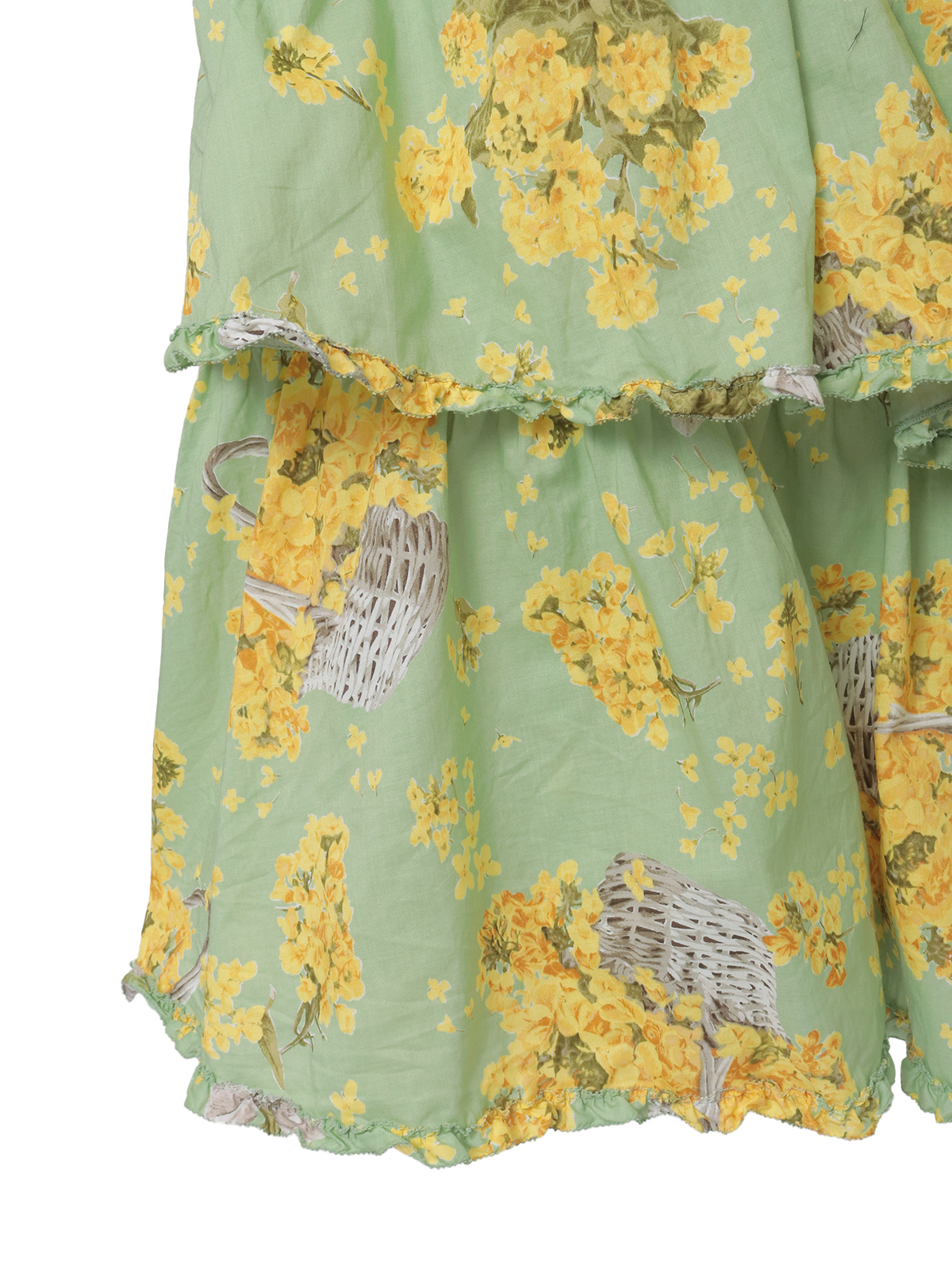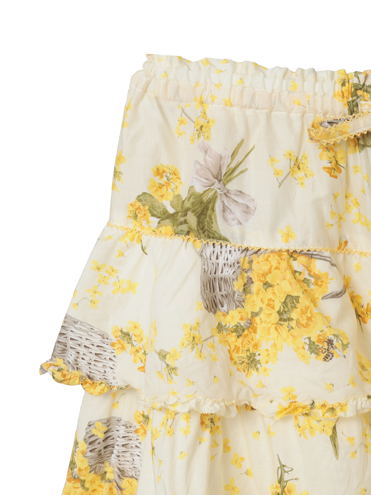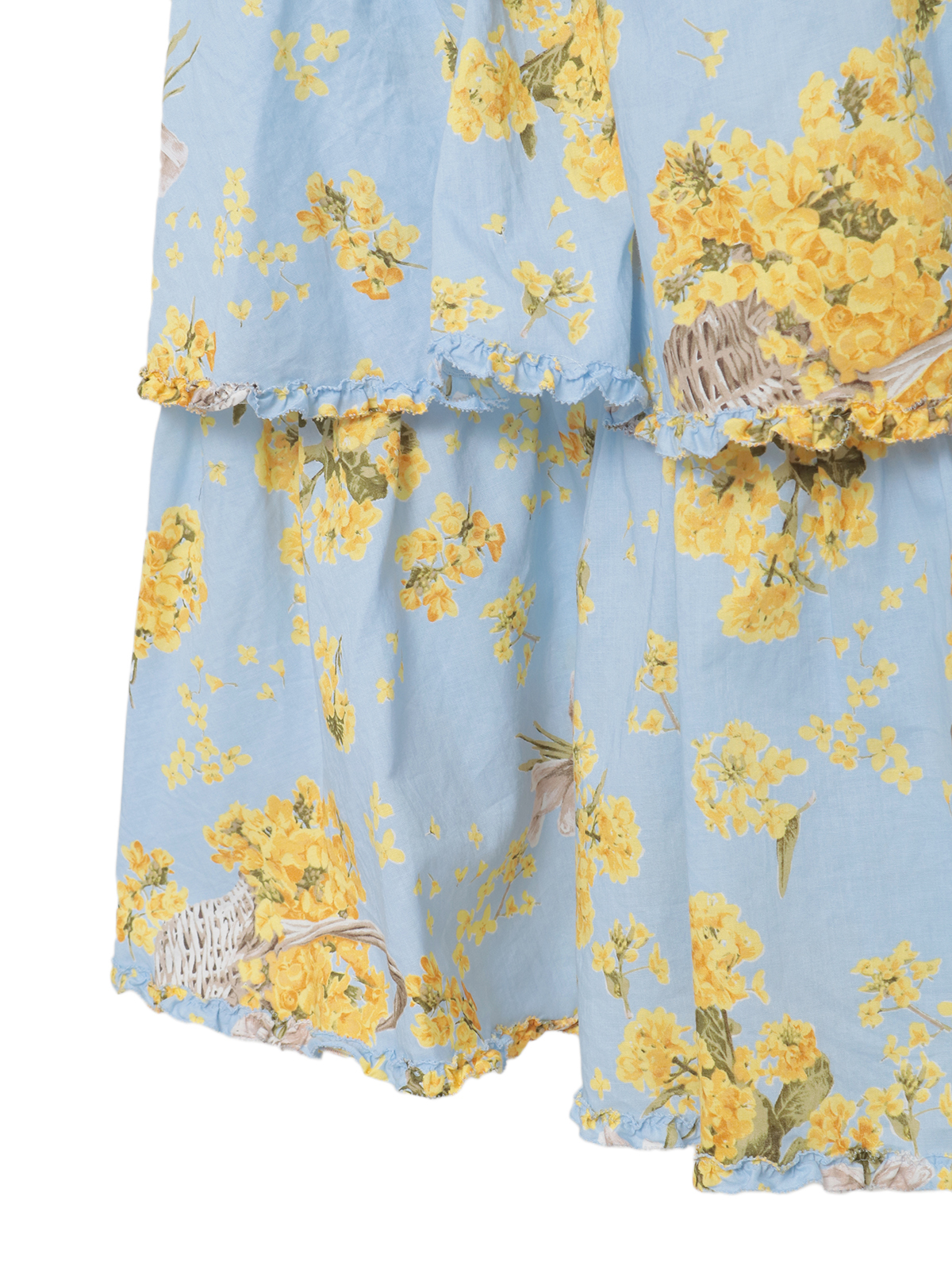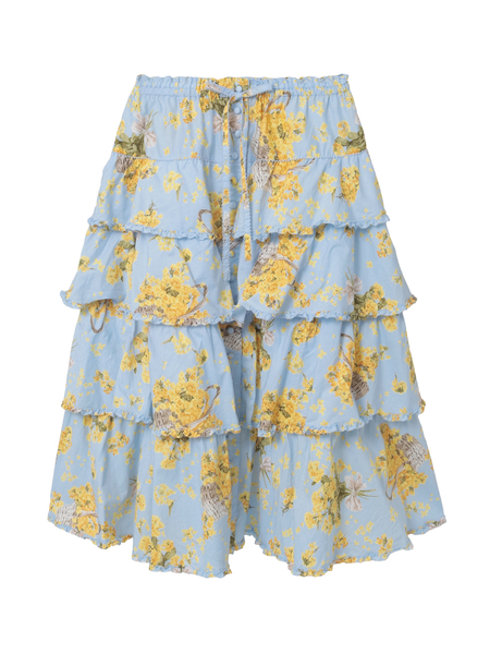 4段の段々フリルを重ね合わせたミディ丈のスカートは、それぞれの段々フリルの先に軽くフリルをあしらった比較的シンプルなデティール使い。