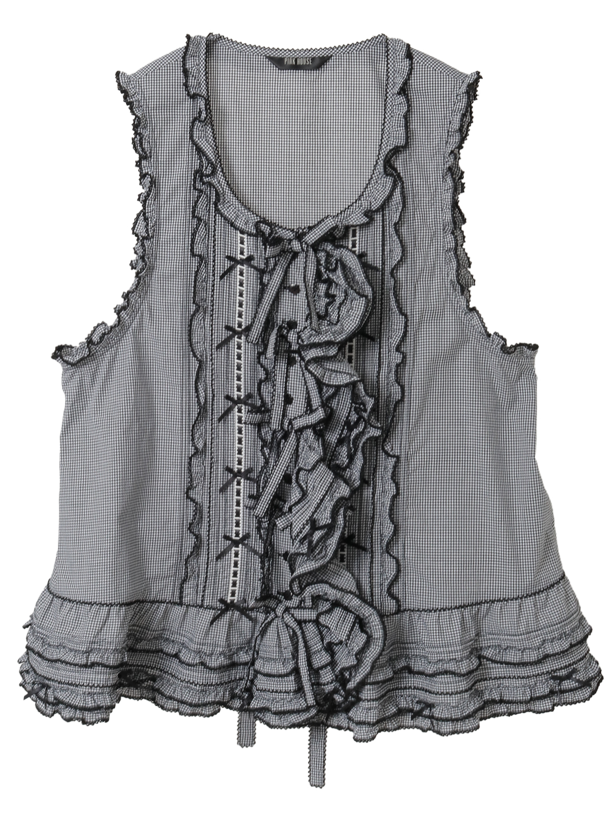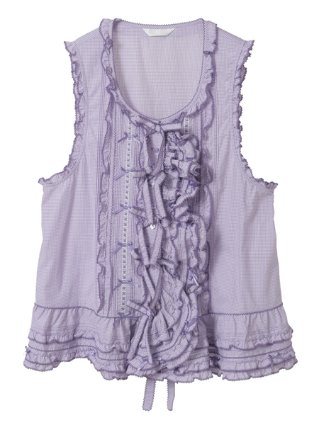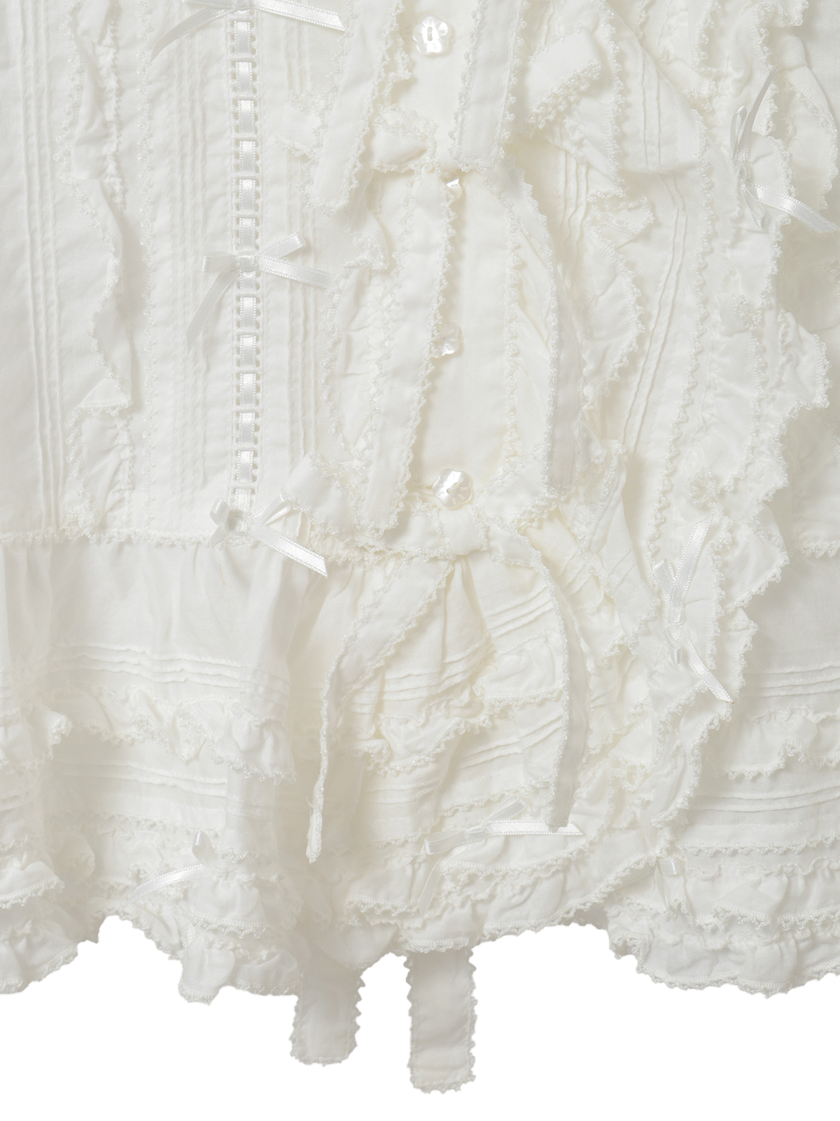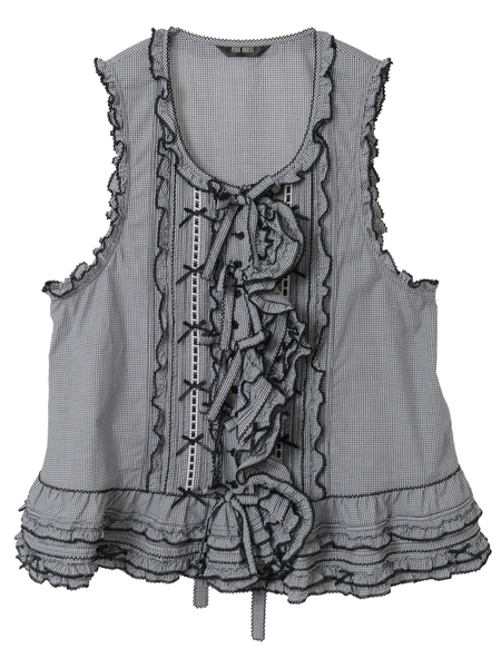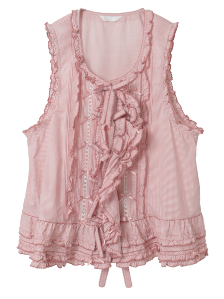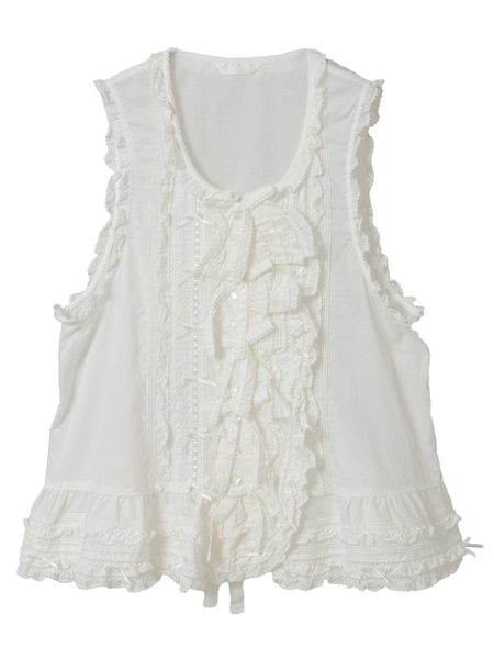 ピコフリルにピンタック、ミニリボンにサテンリボンを通したハシゴレース使いなど、キュートなデティールをあしらったベストブラウス。